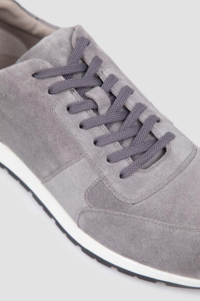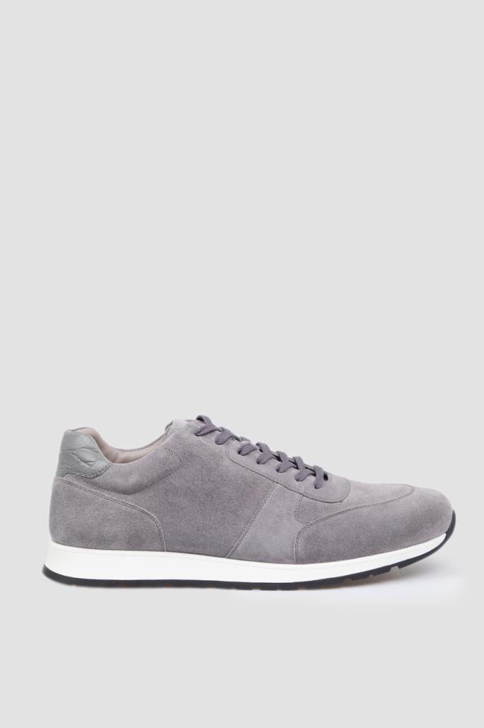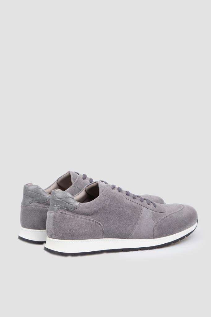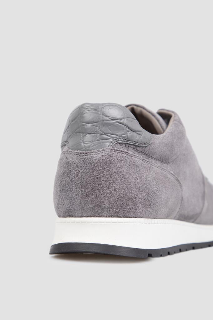 Серые кроссовки Bardini выполнены вручную из мягкой замши. Модель с перекрёстной многорядной шнуровкой отличается бархатистой поверхностью и наличием вставки из фактурной кожи нильского крокодила на заднике в тон. Обувь установлена на амортизирующую подошву из полиуретана в чёрно-белой гамме с рифлением снизу.