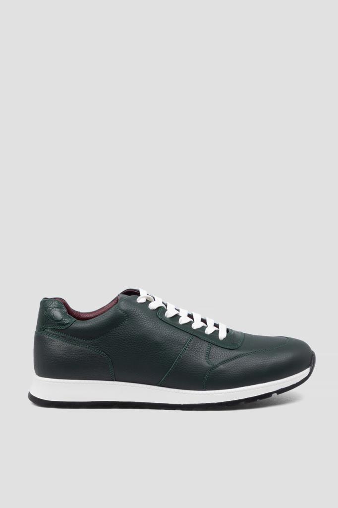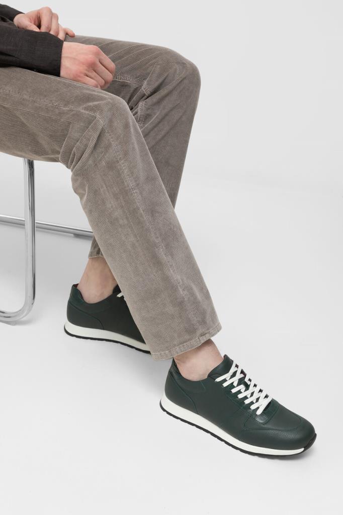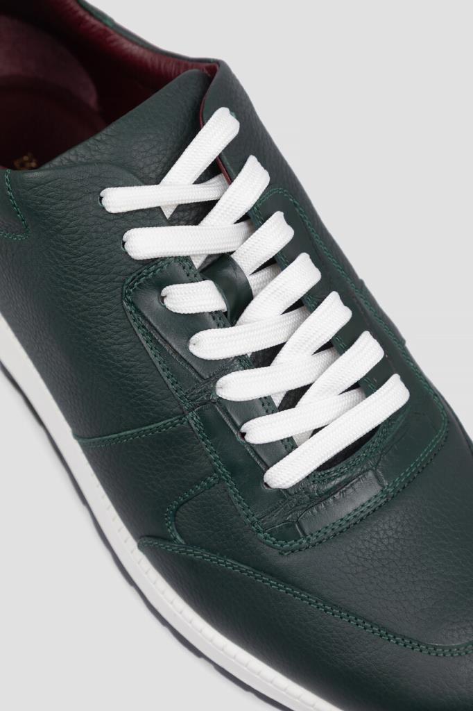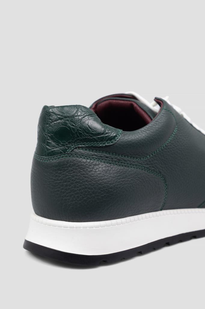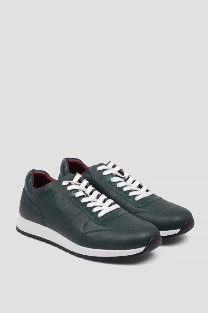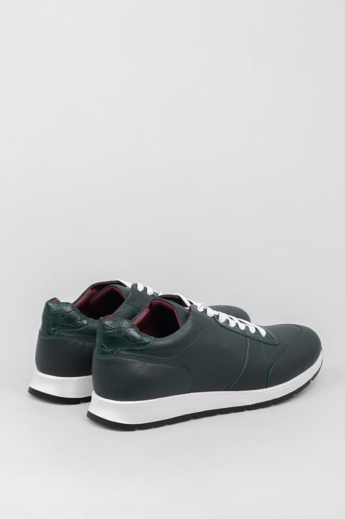 Кроссовки Bardini с уплотнёнными полимерным материалом язычком и задником. Для изготовления тёмно-зелёной модели с перекрёстной многорядной шнуровкой используется зернистая кожа телёнка. Планку шнуровки и задник украшают вставки из фактурной матовой кожи нильского крокодила в тон. Внутри изделие выделано бордовой телячьей кожей.