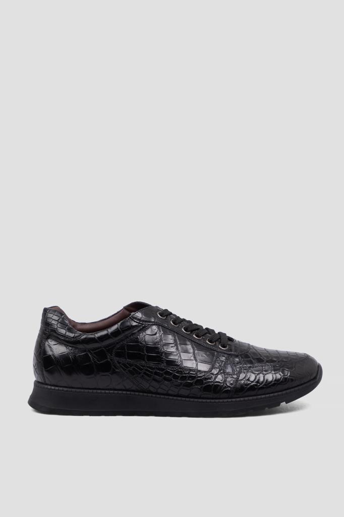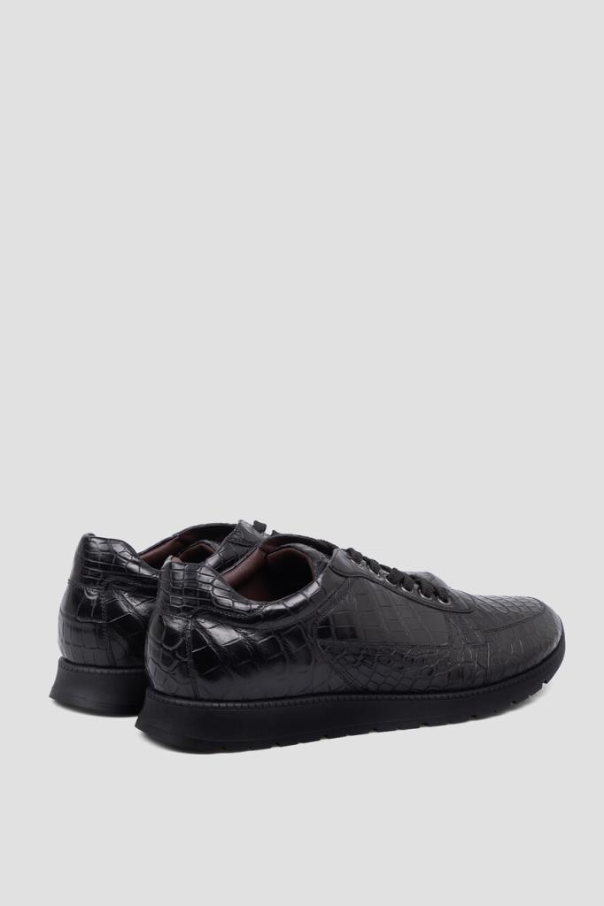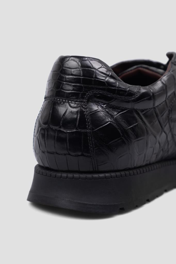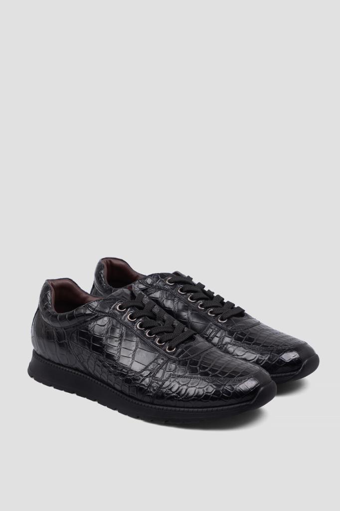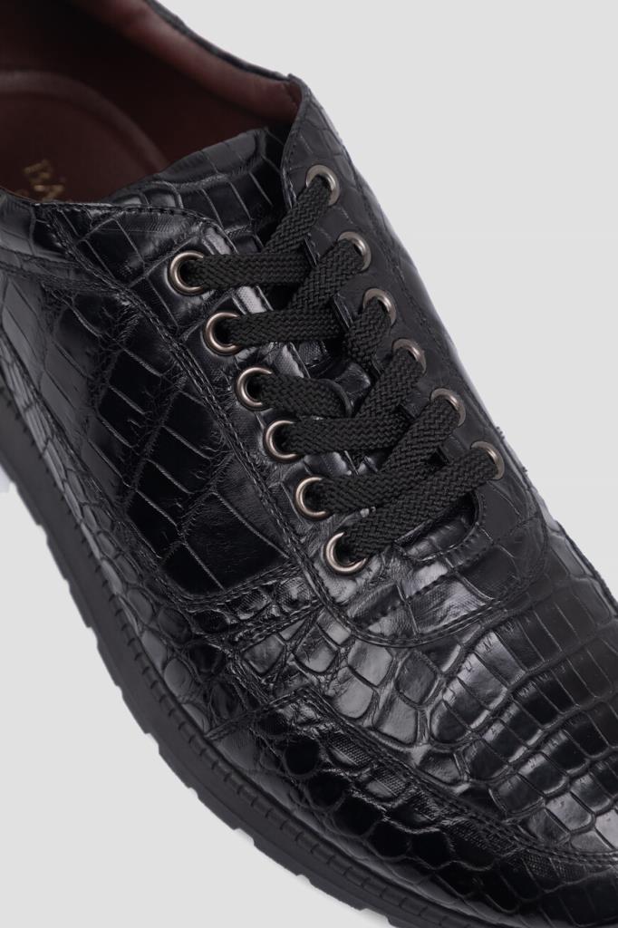 Кожаные кроссовки Bardini с брендированием на стельках. Модель из мягкой фактурной кожи нильского крокодила интересна наличием закрытого типа шнуровки и внутренней отделкой из гладкой телячьей кожи. Лёгкая удобная пара выполнена вручную и установлена на плоскую амортизирующую подошву с рифлением снизу. В изделии чёрного цвета применены технологии, позволяющие максимально снизить вес обуви.