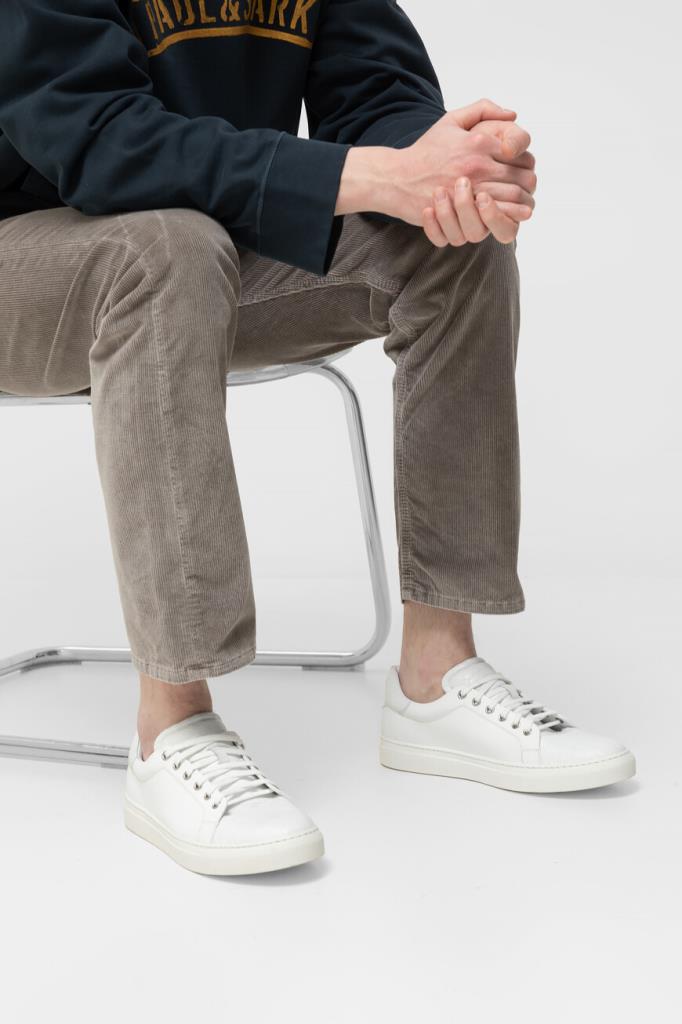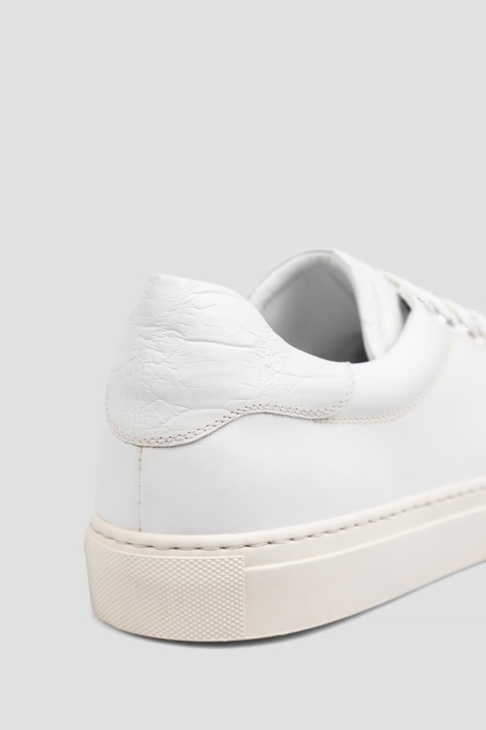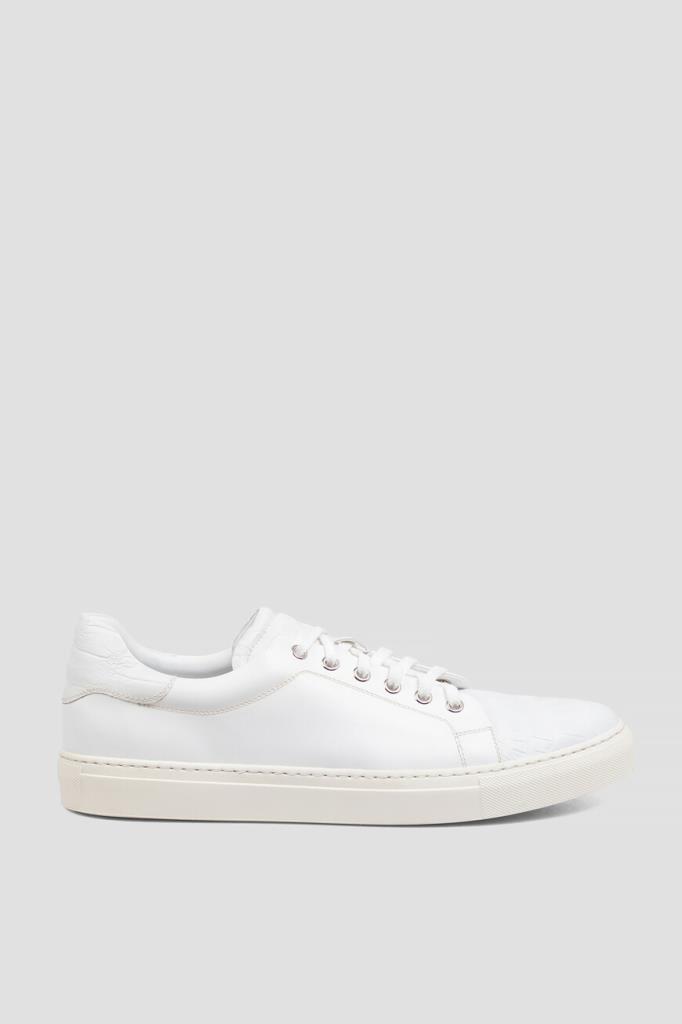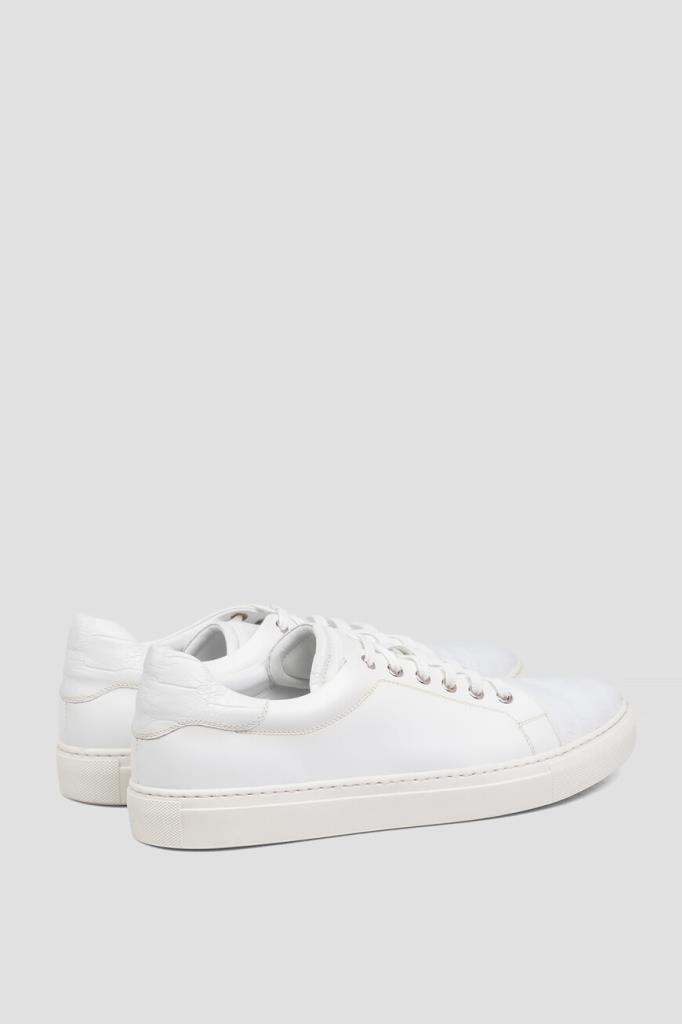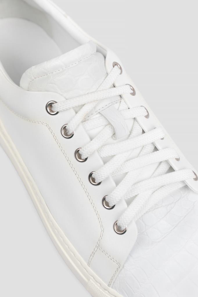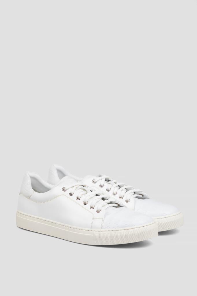 Кеды Bardini выполнены вручную на собственной фабрике бренда. Для изготовления комбинированной пары обуви выбрана гладкая воловья кожа белого цвета со вставками из фактурной кожи нильского крокодила на язычке и заднике в тон. Зона комфорта формируется несколькими элементами: перекрёстной многорядной шнуровкой, мягкими кожаными стельками и плоской амортизирующей подошвой из натуральной резины.