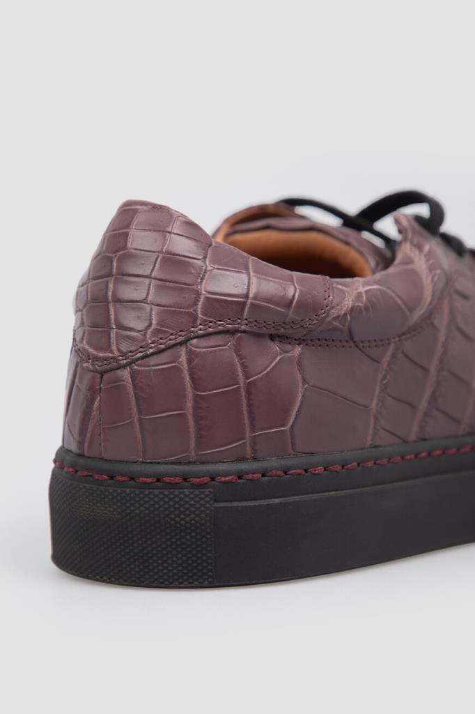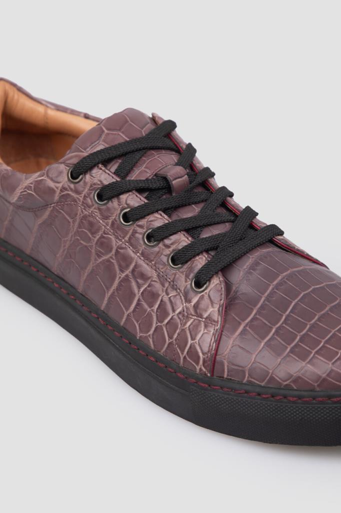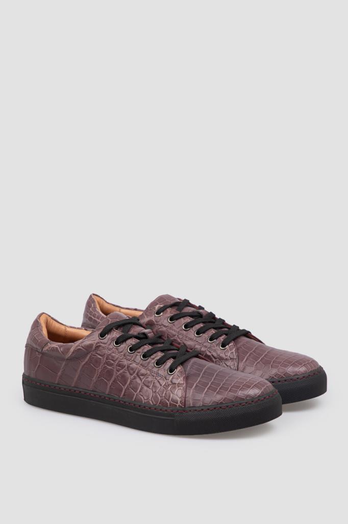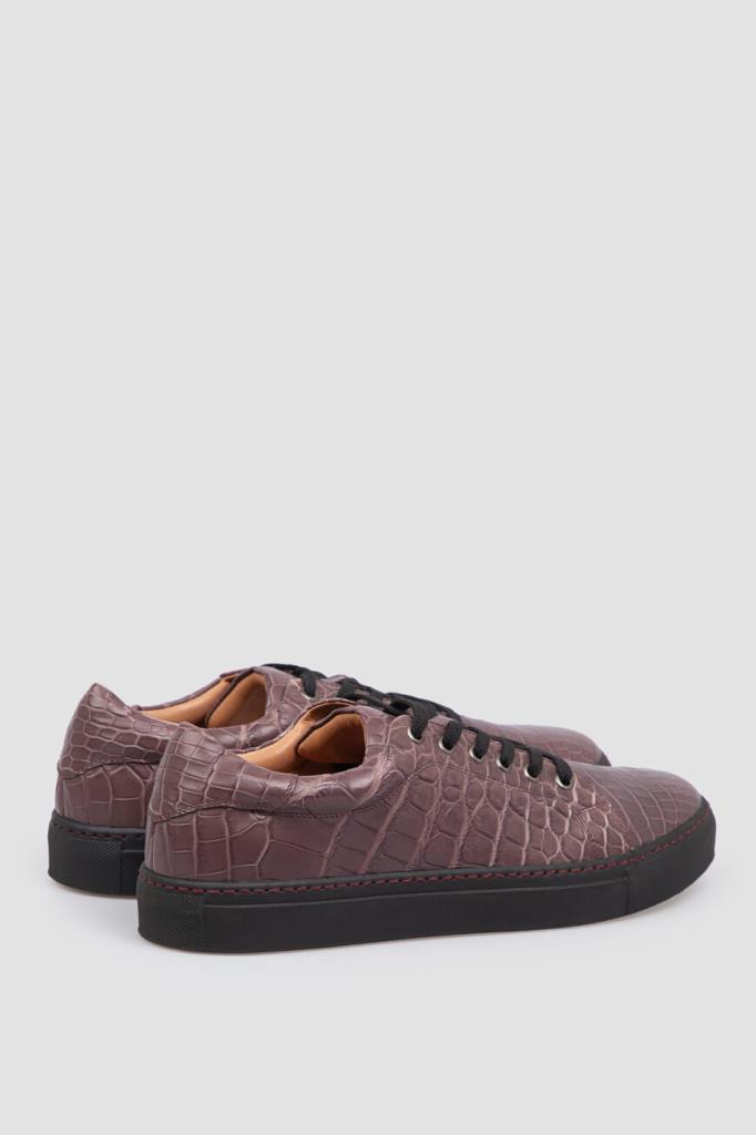 Демисезонные кеды фиолетового оттенка от Bardini. Пудовая модель изготовлена из мягкой кожи крокодила с естественным чешуйчатым рисунком. Конструкция изделия предполагает наличие открытого типа шнуровки и плоской амортизирующей подошвы чёрного цвета и прострочкой-швом.