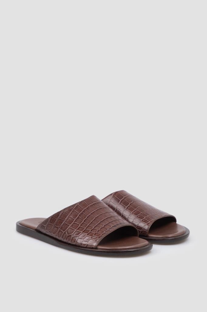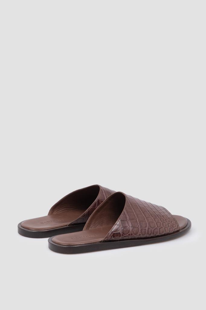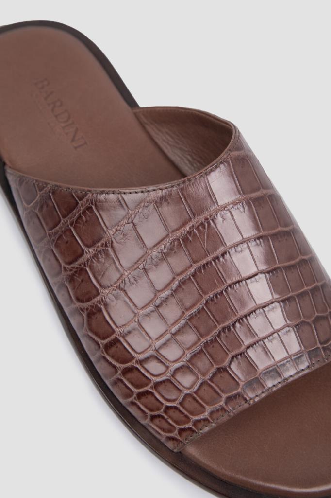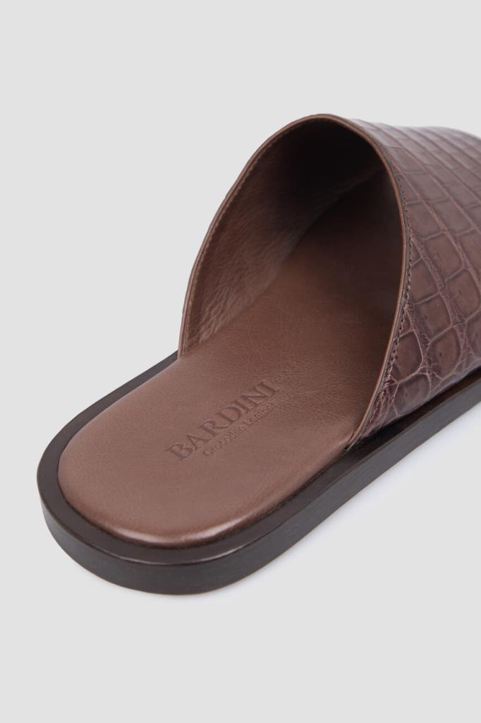 Тёмно-коричневые шлёпанцы Bardini на плоской подошве с брендированием снизу. Для изготовления комбинированной пары обуви выбраны фактурная кожа нильского крокодила и спрессованная телячья кожа. Принадлежность модели с округлым носком Дому деликатно обозначена крупным тиснёным логотипом на кожаных стельках.