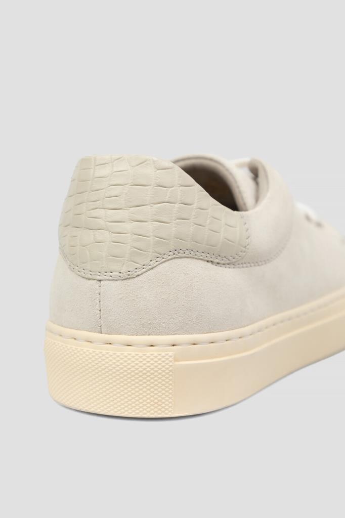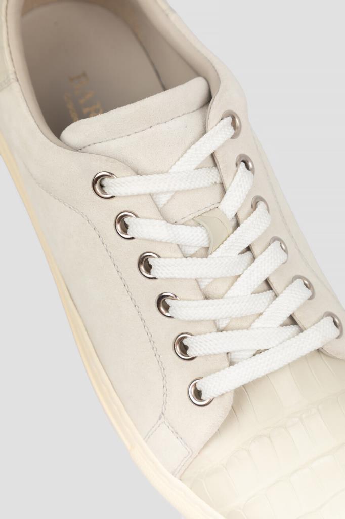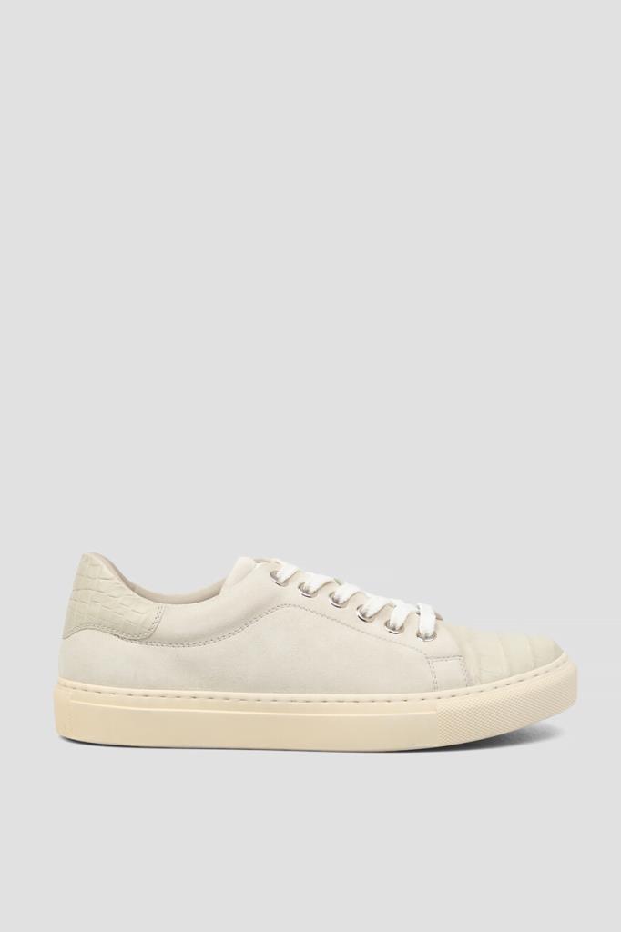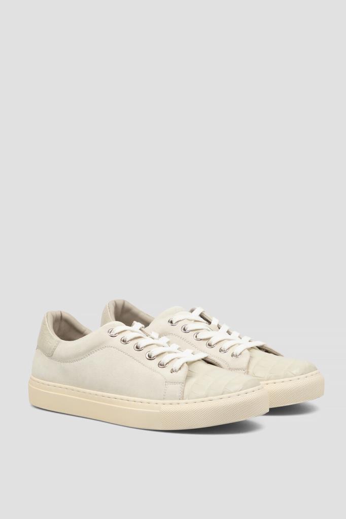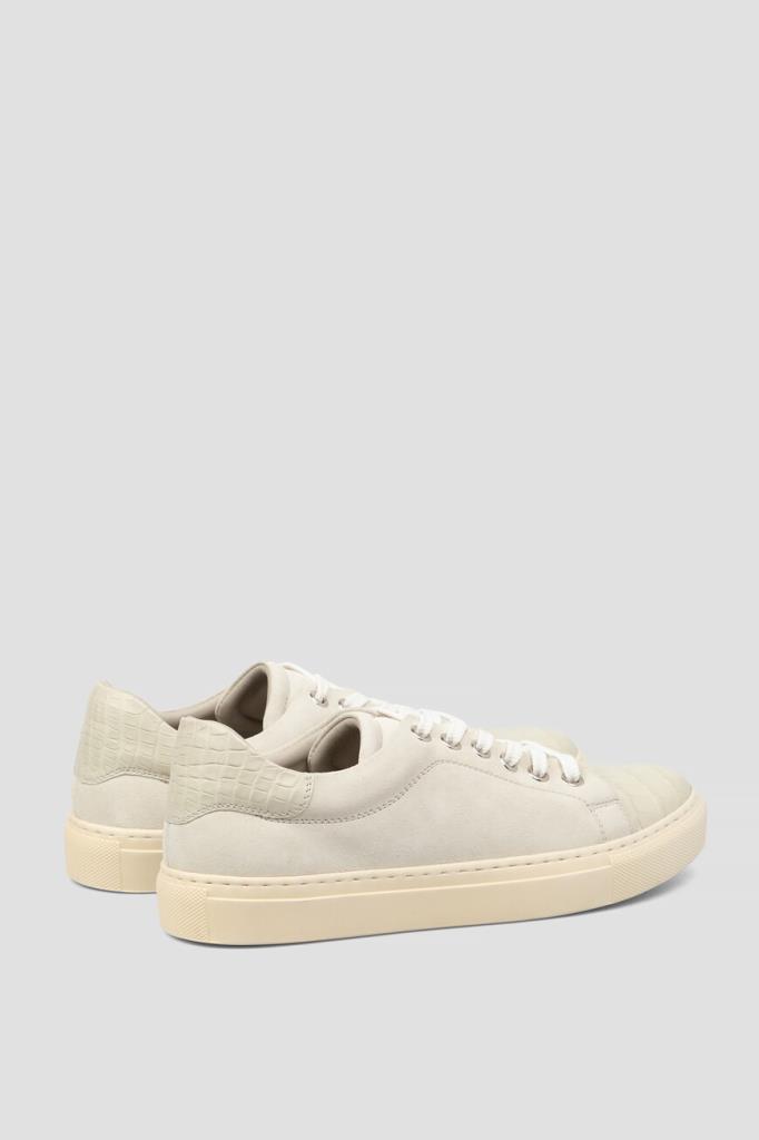 Кеды Bardini на плоской белой подошве из полиуретана. Изделие выполнено из мягкой замши с бархатистой текстурой и вставками из фактурной кожи нильского крокодила на носке и заднике в тон. Модель отличается наличием открытого типа шнуровки с серебристыми люверсами и внутренней отделкой из тонкой телячьей кожи.