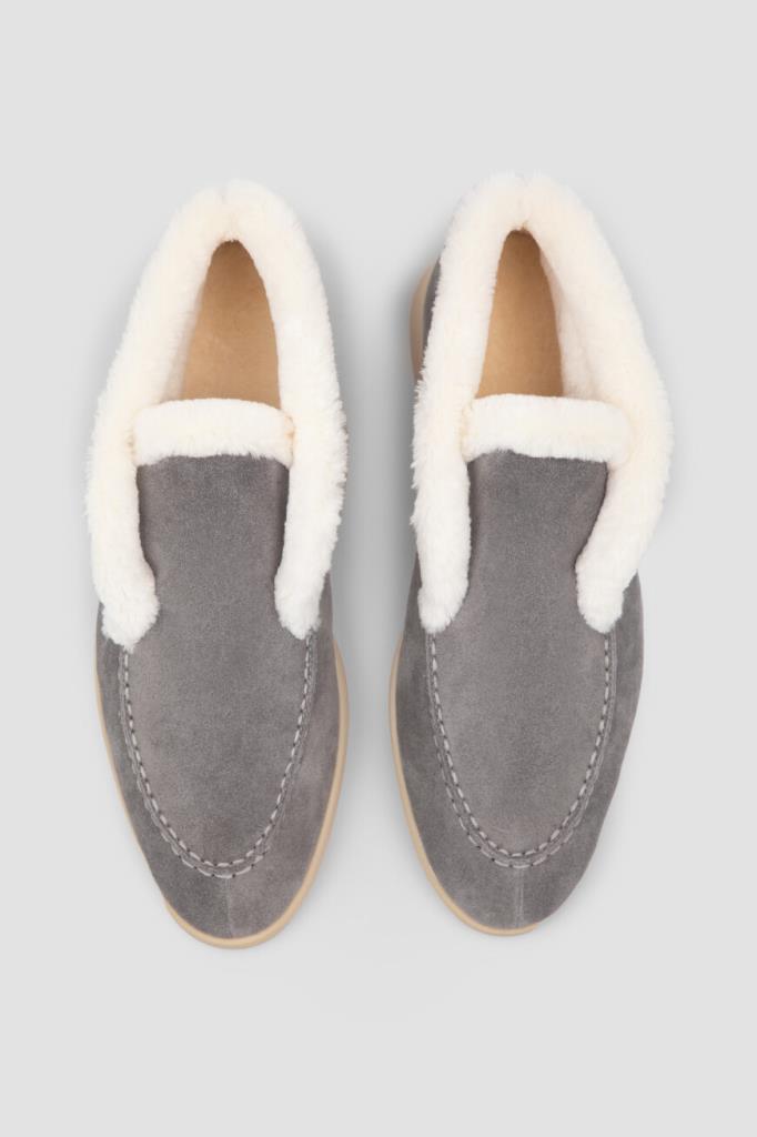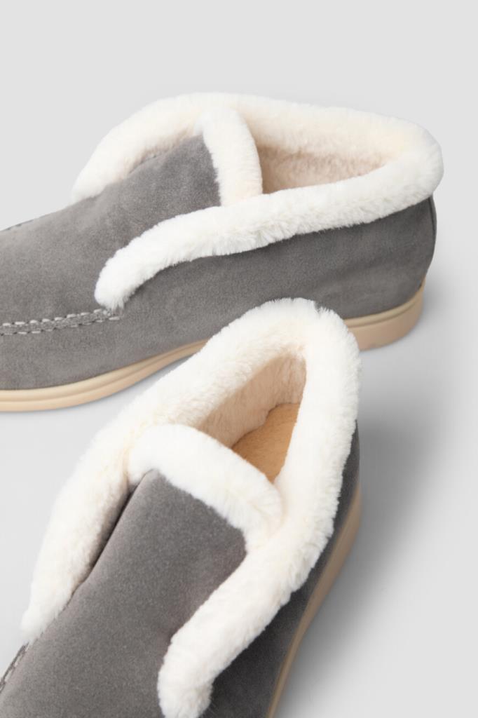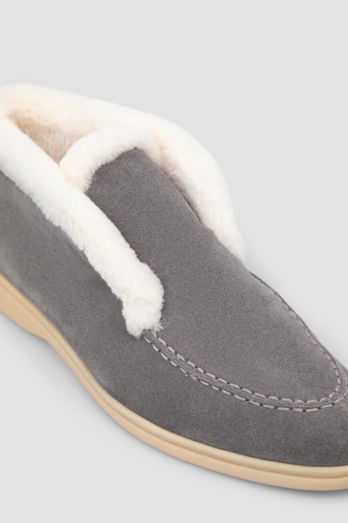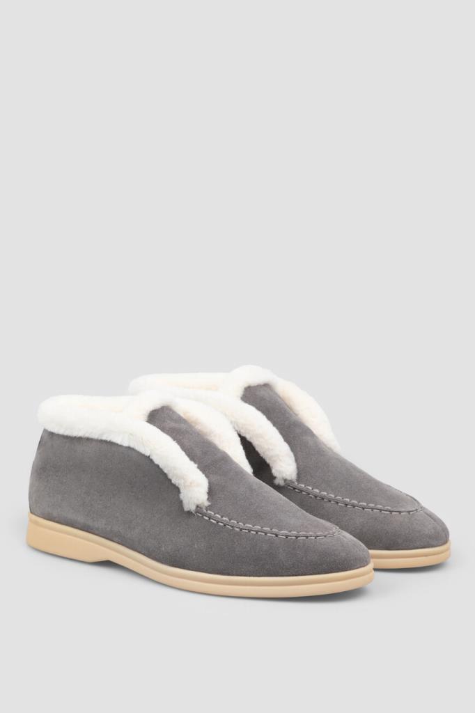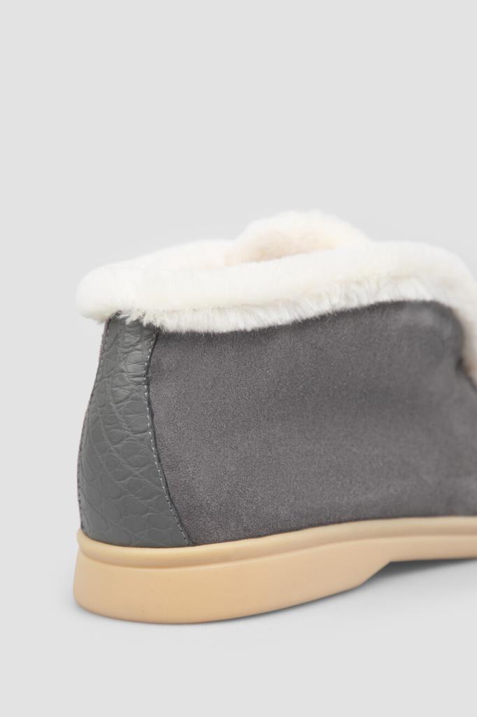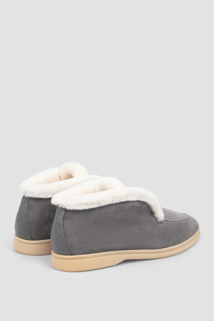 Утеплённые полуботинки серого цвета от Bardini. Модель изготовлена из мягкой бархатистой замши со вставкой из фактурной кожи нильского крокодила на заднике в тон. Особенностями изделия без шнуровки являются наличие прошитого округлого шва на мыске и белые кант и внутренняя отделка из натурального меха бобра.