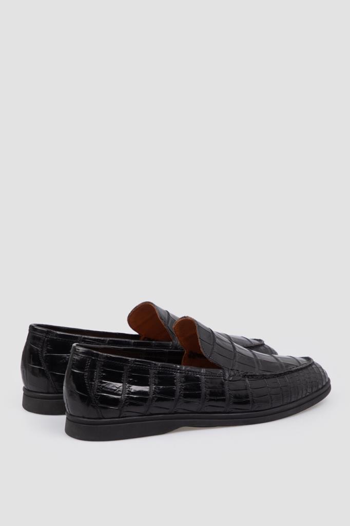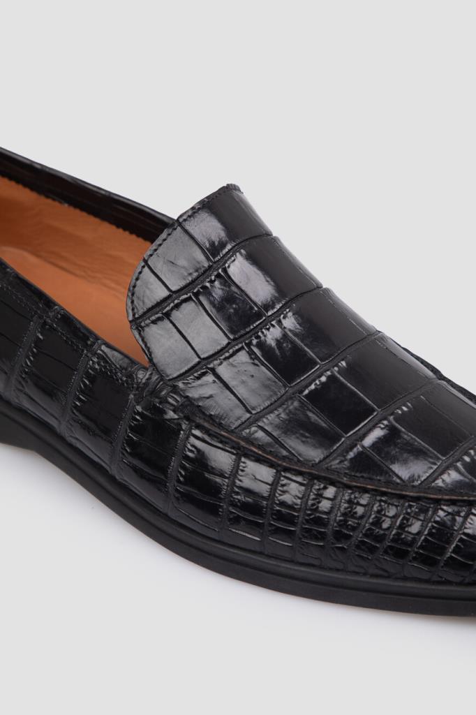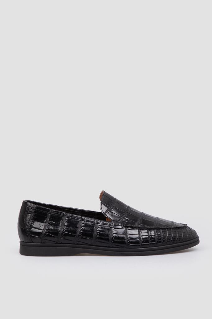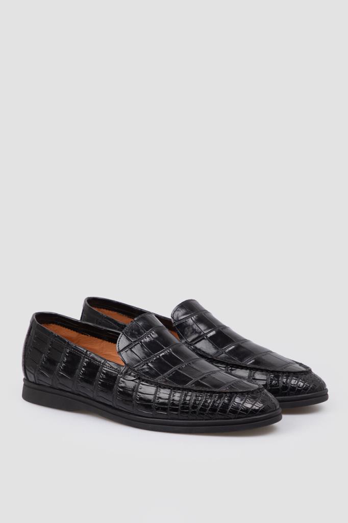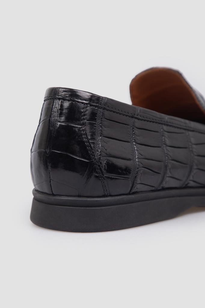 Чёрные лоферы Bardini с закруглённым носком. Для создания классической модели выбрана фактурная кожа нильского крокодила с деликатным блеском. Отличительными деталями являются декоративный рельефный шов на союзке и амортизирующая подошва из прочного полиуретана в тон с небольшим утолщением в области устойчивого каблука и оттиском в стиле бренда Bardini снизу.