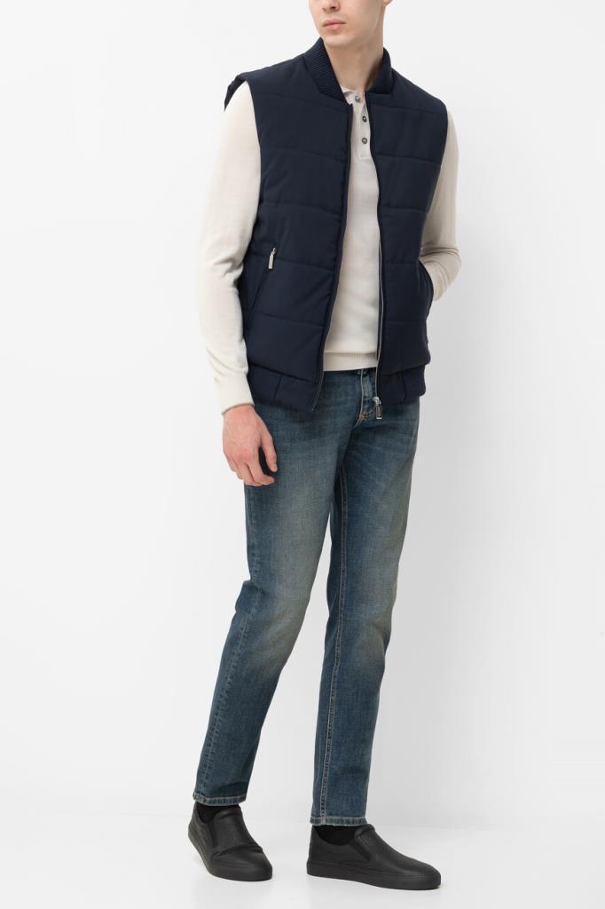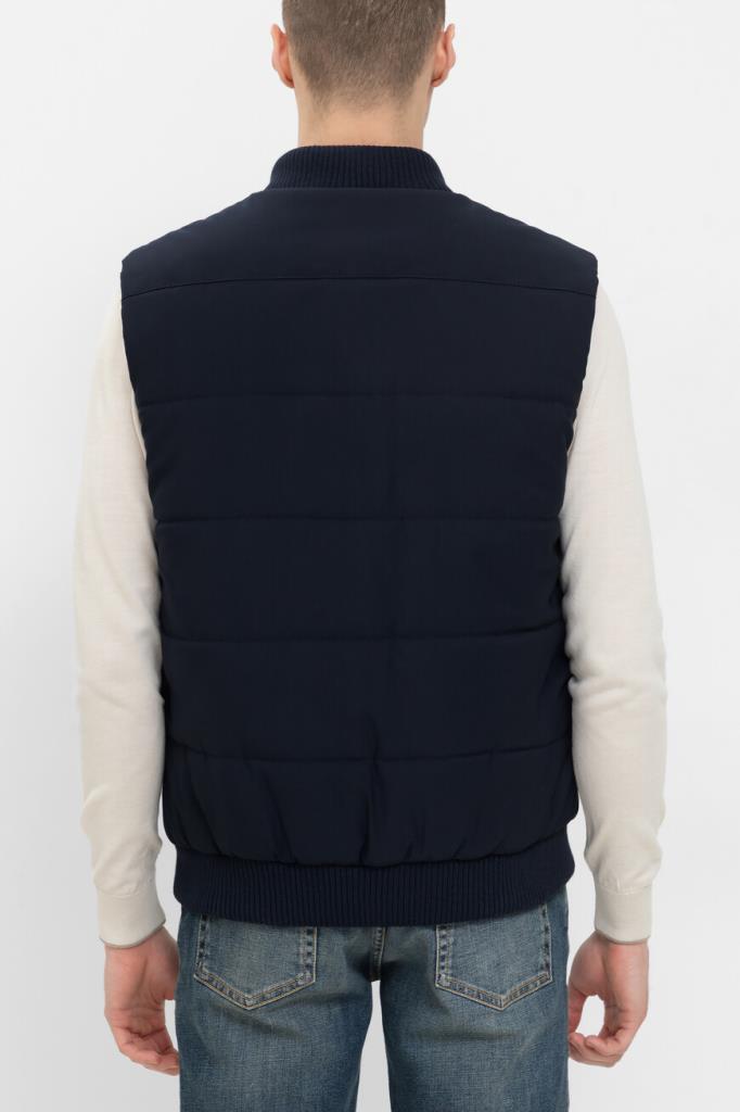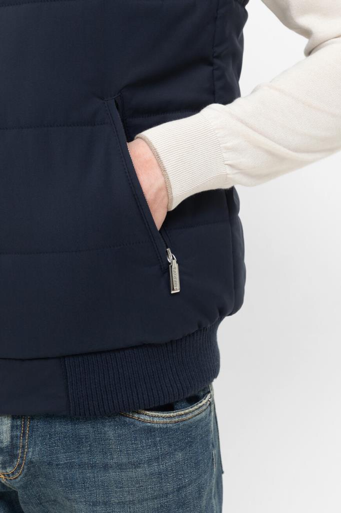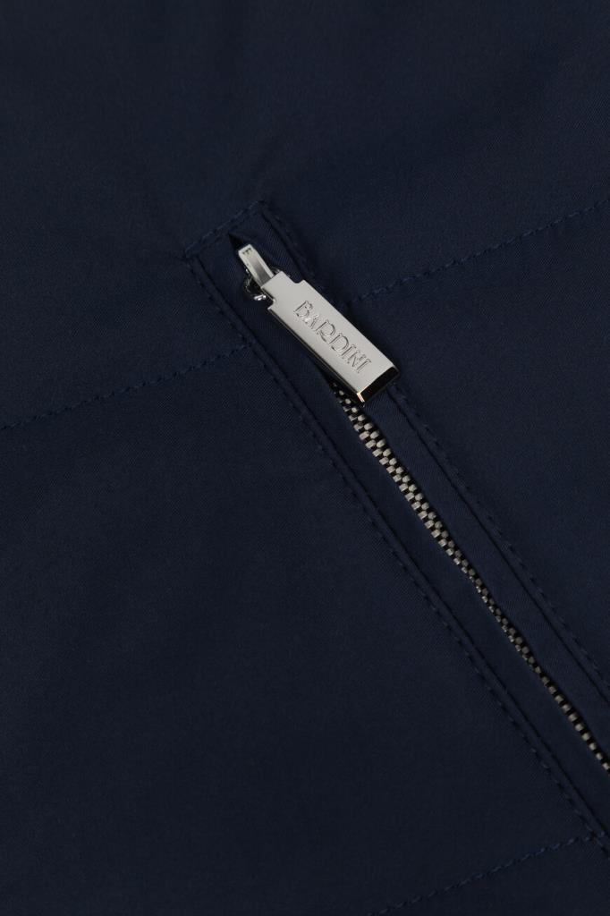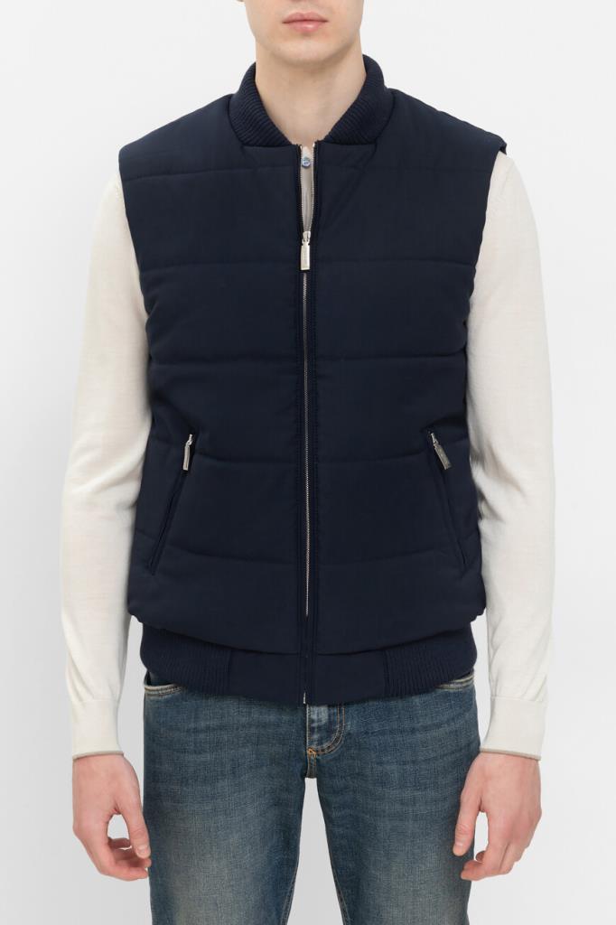 Шерстяной жилет Bardini на блестящей серой подкладке. Модель полуприлегающего силуэта окрашена в тёмно-синий оттенок и дополнена горизонтальной стёжкой. Фасон изделия предполагает наличие невысокого воротника-стойки и застёжку на серебристую молнию с брендированным пуллером. Для оптимальной посадки жилета по фигуре предусмотрен широкий эластичный пояс-резинка.