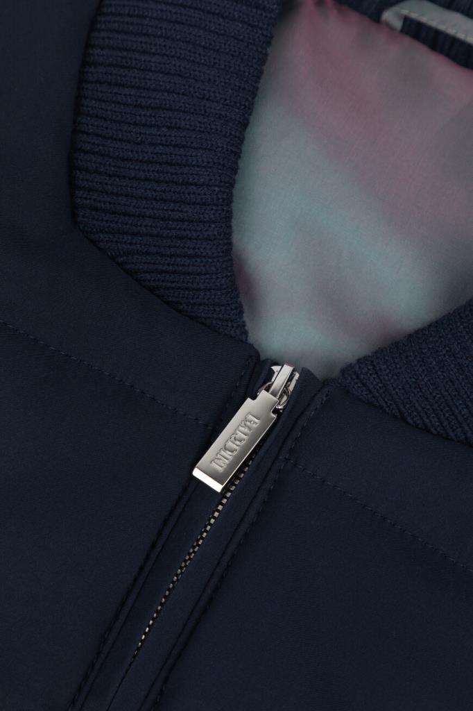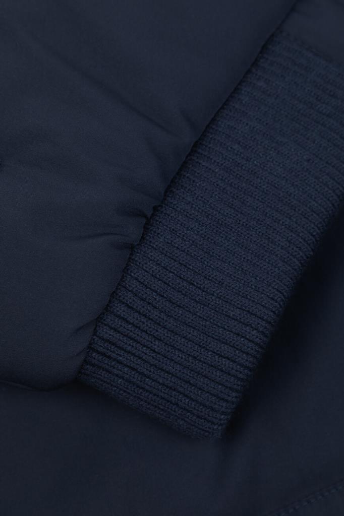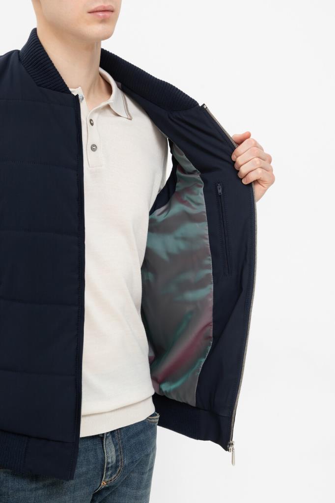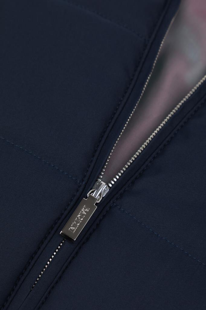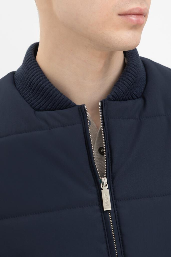 Шерстяной жилет Bardini на блестящей серой подкладке. Модель полуприлегающего силуэта окрашена в тёмно-синий оттенок и дополнена горизонтальной стёжкой. Фасон изделия предполагает наличие невысокого воротника-стойки и застёжку на серебристую молнию с брендированным пуллером. Для оптимальной посадки жилета по фигуре предусмотрен широкий эластичный пояс-резинка.