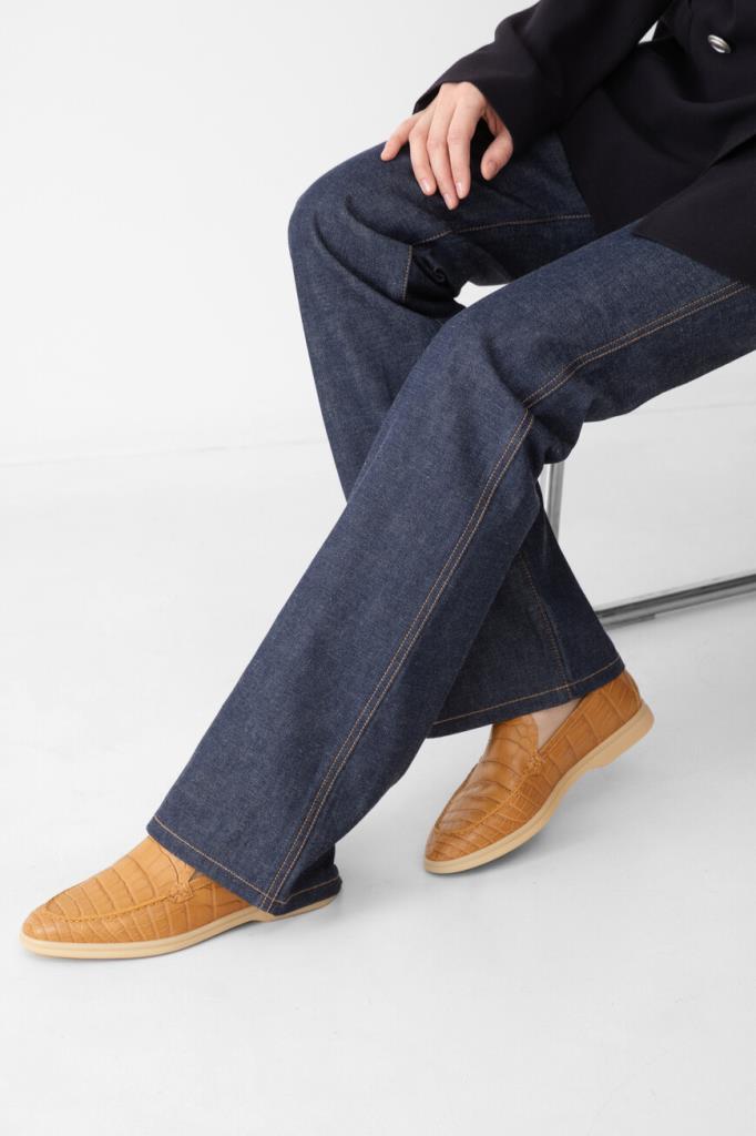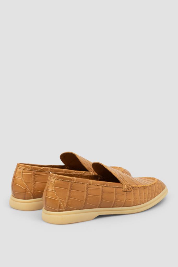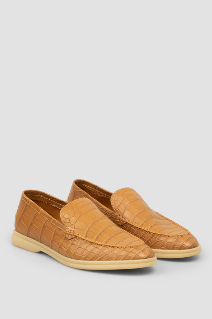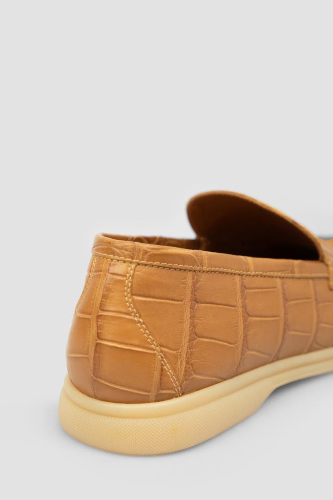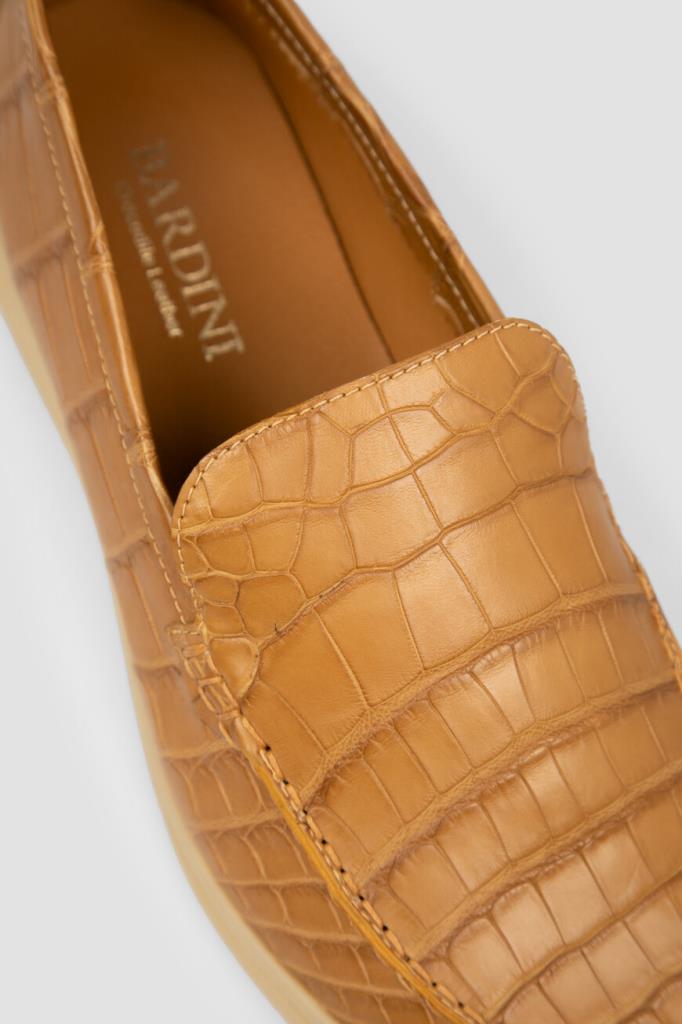 Женские лоферы горчичного цвета от Bardini. Для изготовления изделия с широкой колодкой используется натуральная кожа нильского крокодила с характерным природным узором. Максимальный комфорт обеспечивается мягкой конструкцией обуви и амортизирующей подошвой из гибкого каучука с небольшим утолщением в области широкого каблука и оттиском в стиле бренда Bardini снизу.