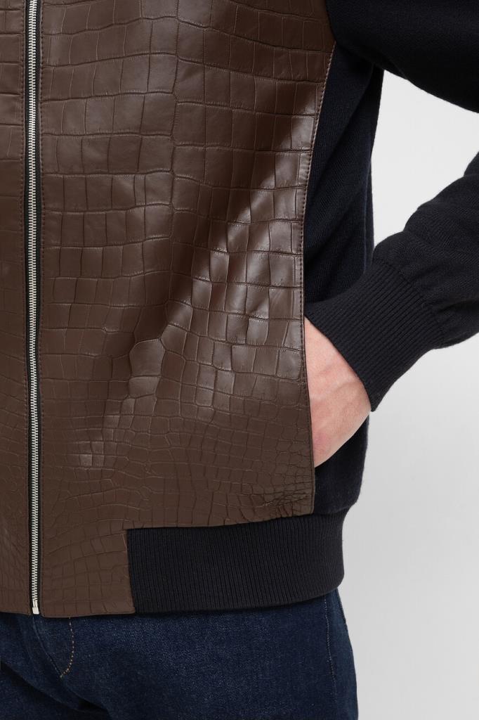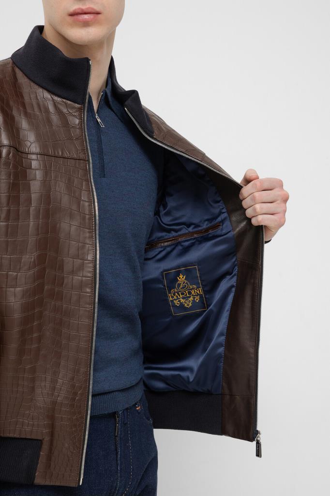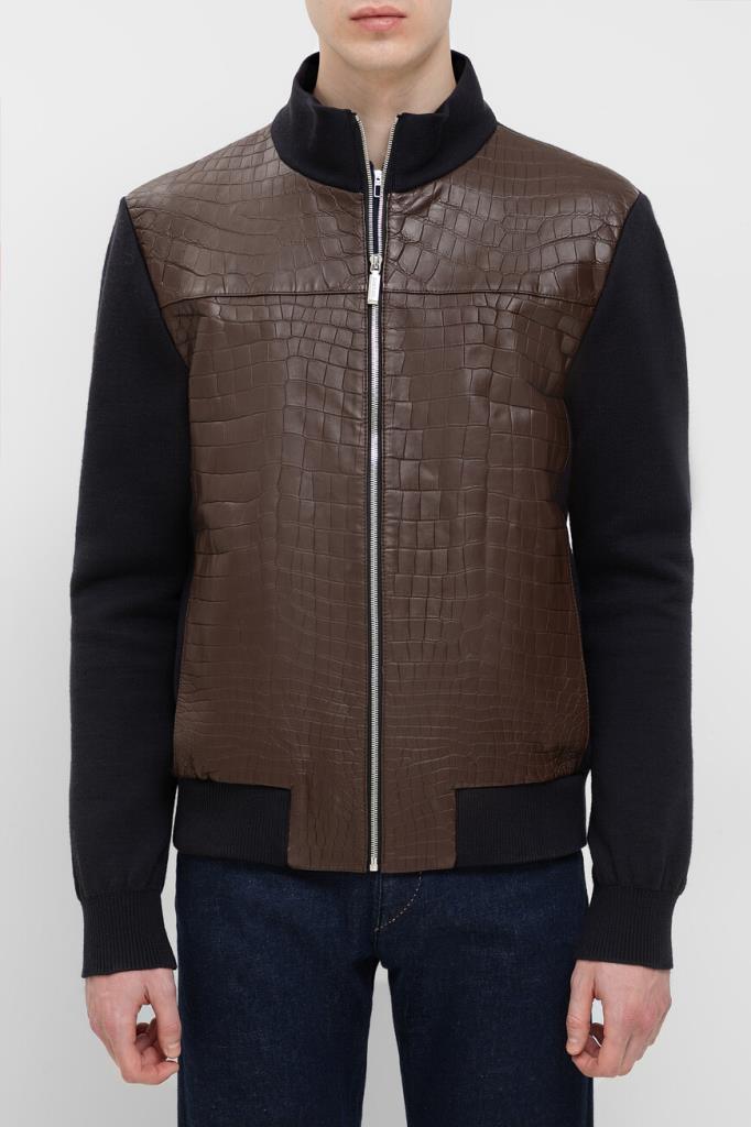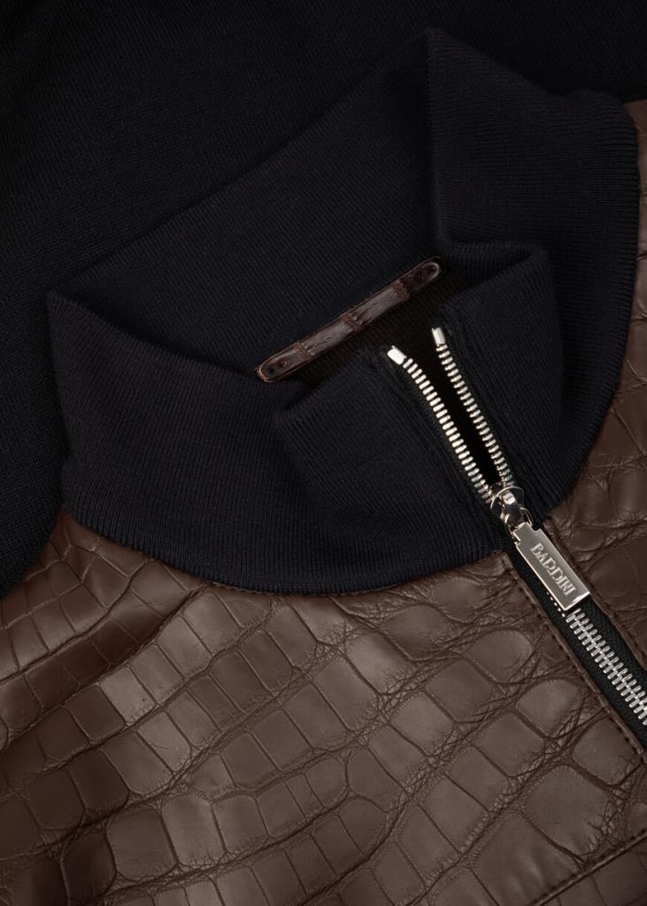 Комбинированная куртка с невысоким воротником-стойкой от Bardini. Изделие связано из мягкой шерсти и акрила тёмно-синего цвета и дополнено вставками из фактурной тёмно-коричневой кожи крокодила спереди и на кокетке. Модель застёгивается на серебристую молнию с брендированным пуллером и отличается наличием двух прорезных карманов в боковых швах.