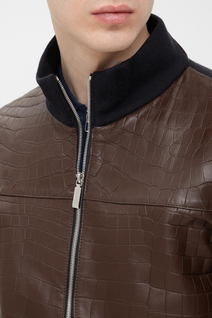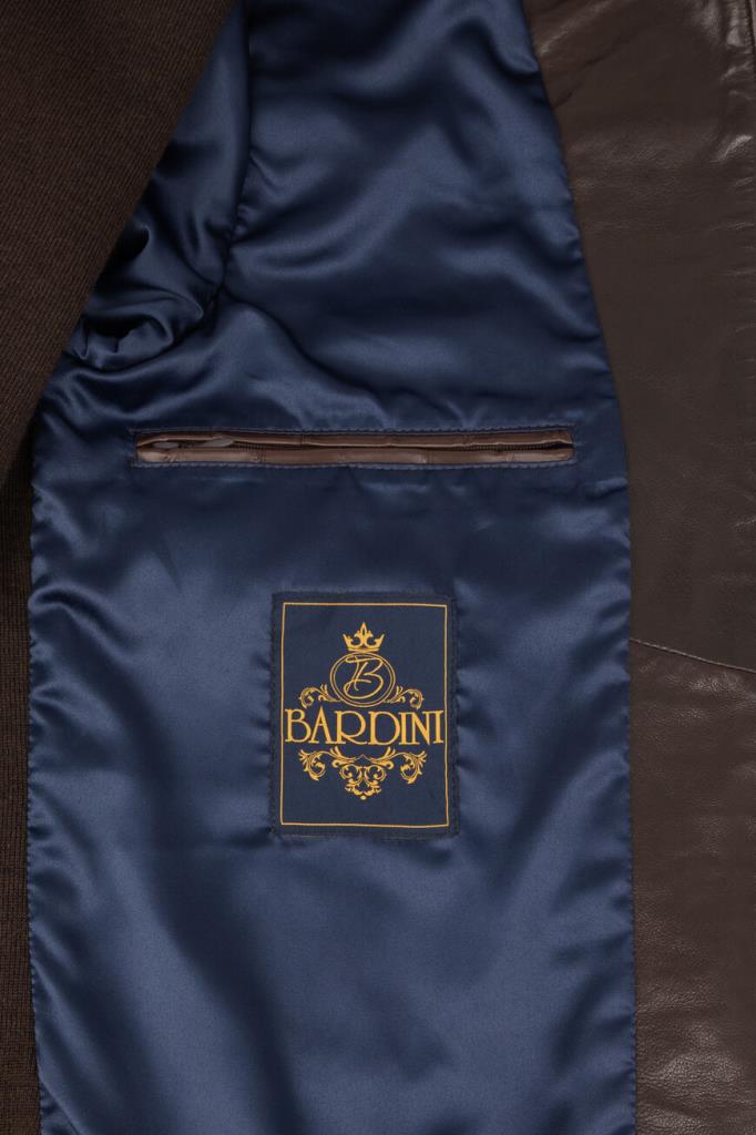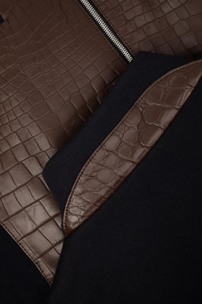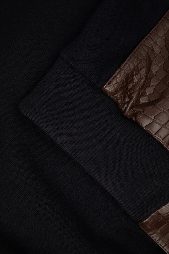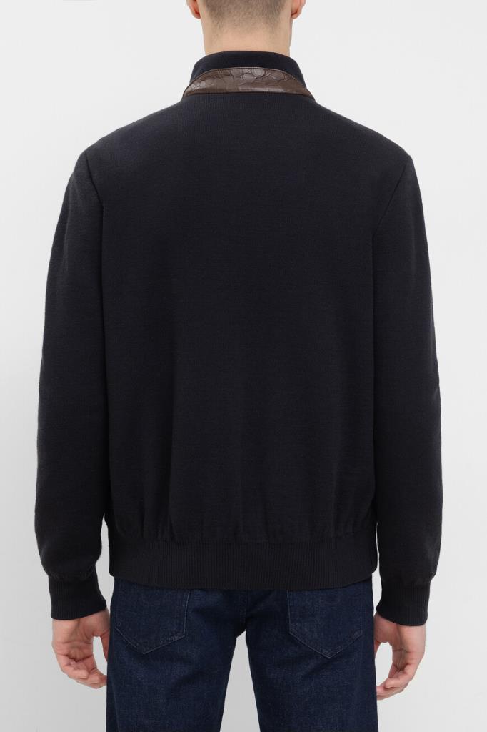 Комбинированная куртка с невысоким воротником-стойкой от Bardini. Изделие связано из мягкой шерсти и акрила тёмно-синего цвета и дополнено вставками из фактурной тёмно-коричневой кожи крокодила спереди и на кокетке. Модель застёгивается на серебристую молнию с брендированным пуллером и отличается наличием двух прорезных карманов в боковых швах.