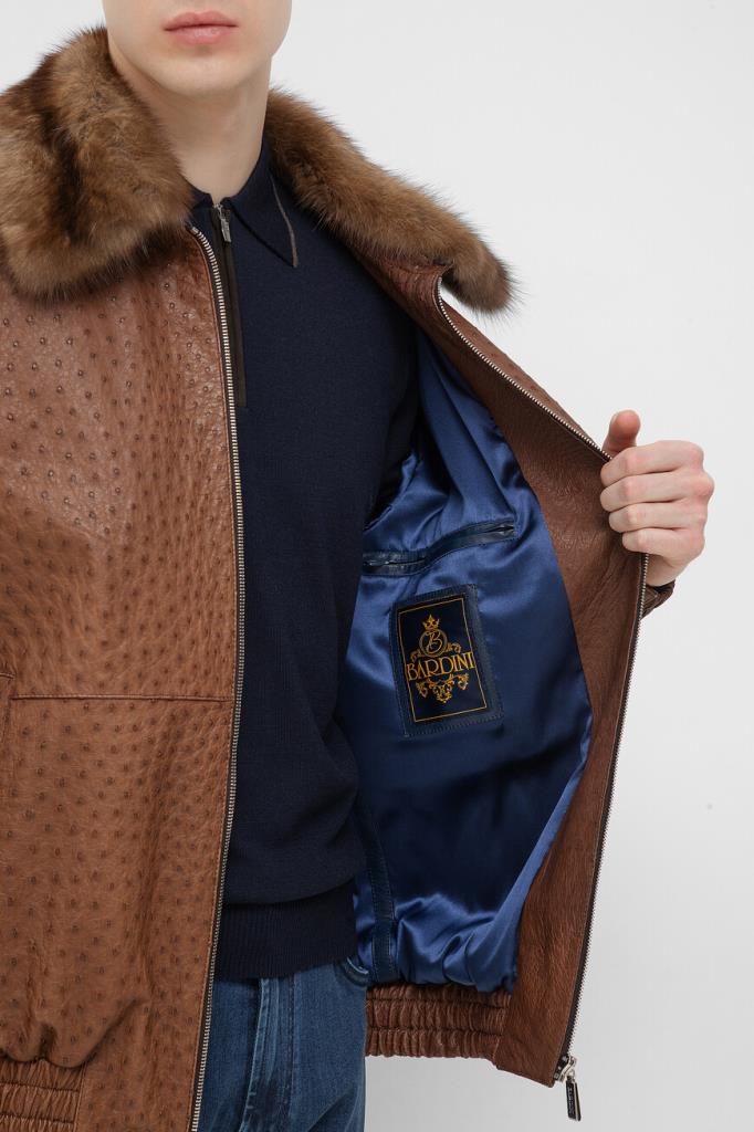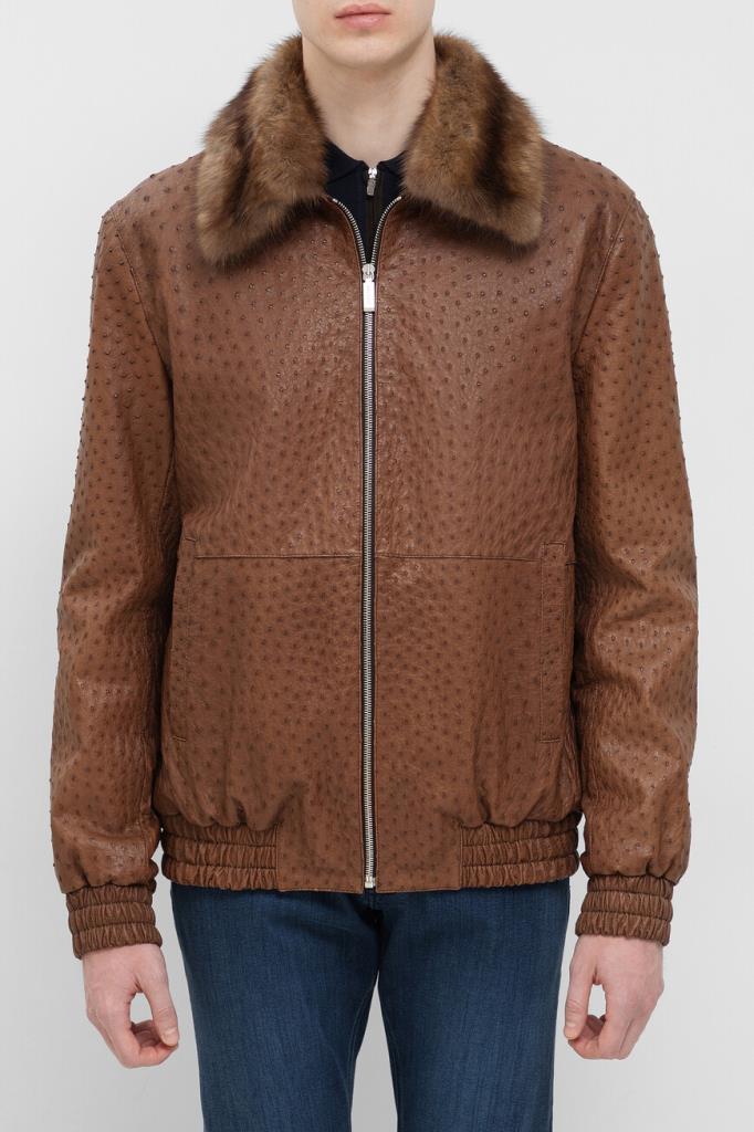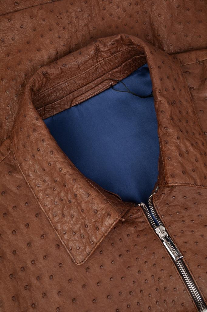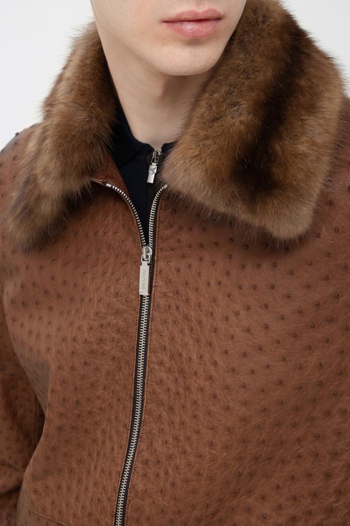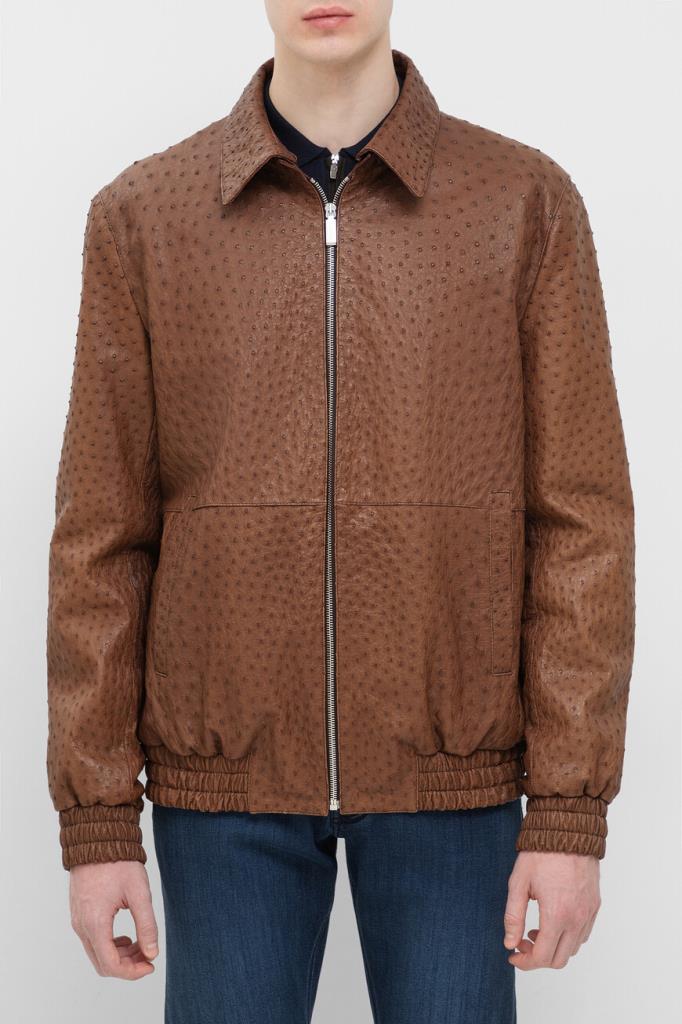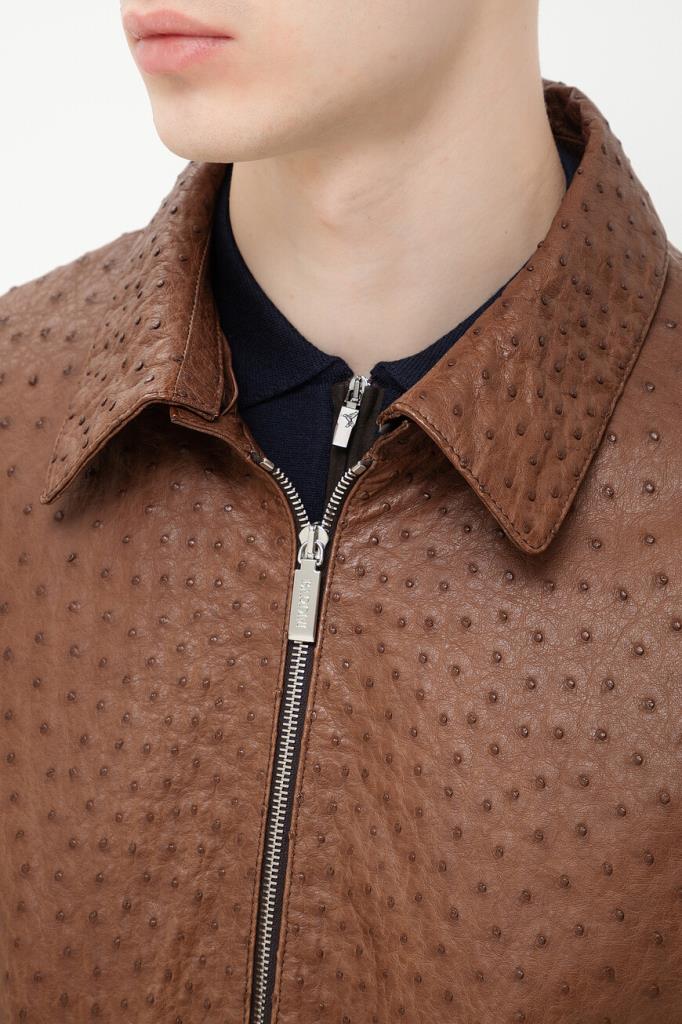 Коричневая куртка Bardini из мягкой экзотической кожи страуса. Конструкция изделия прямого силуэта предполагает наличие двух отстёгивающихся воротников, кожаного и мехового, а также застёжку на серебристую молнию с брендированным пуллером. Блестящая подкладка из прочного синего полиэфира создаёт особый комфорт. Элегантное сочетание цветов отражает эстетику сезонной коллекции.