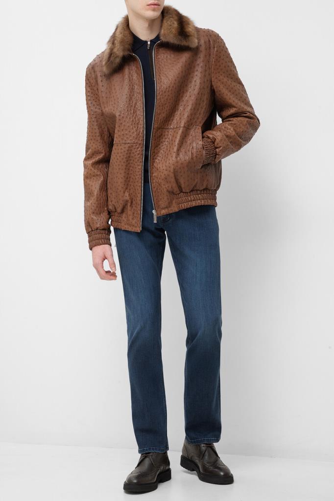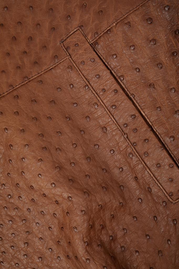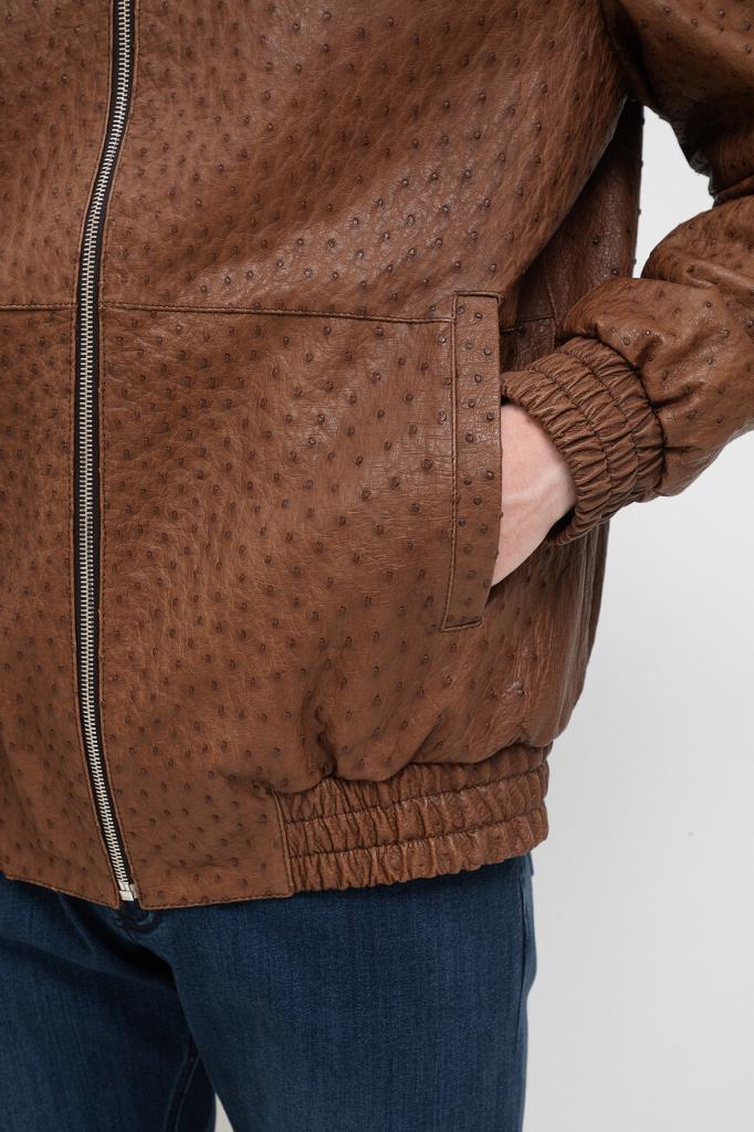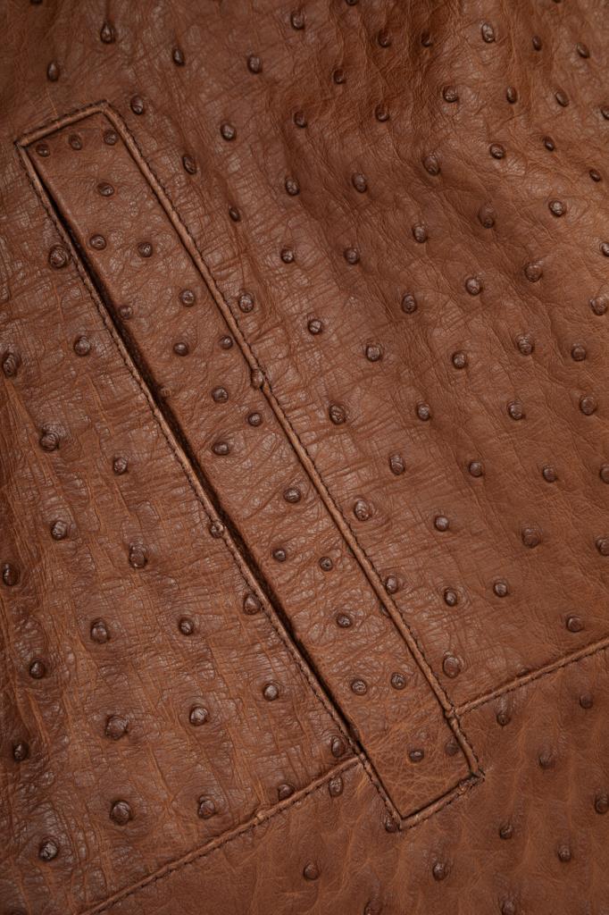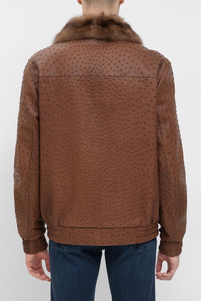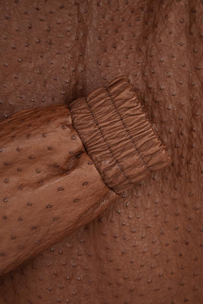 Коричневая куртка Bardini из мягкой экзотической кожи страуса. Конструкция изделия прямого силуэта предполагает наличие двух отстёгивающихся воротников, кожаного и мехового, а также застёжку на серебристую молнию с брендированным пуллером. Блестящая подкладка из прочного синего полиэфира создаёт особый комфорт. Элегантное сочетание цветов отражает эстетику сезонной коллекции.