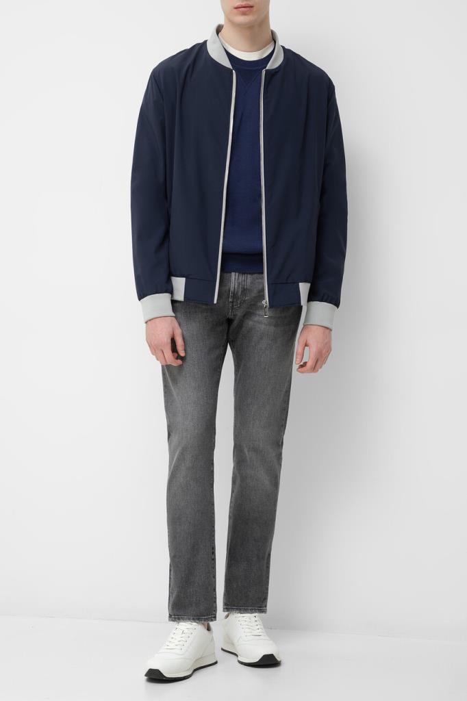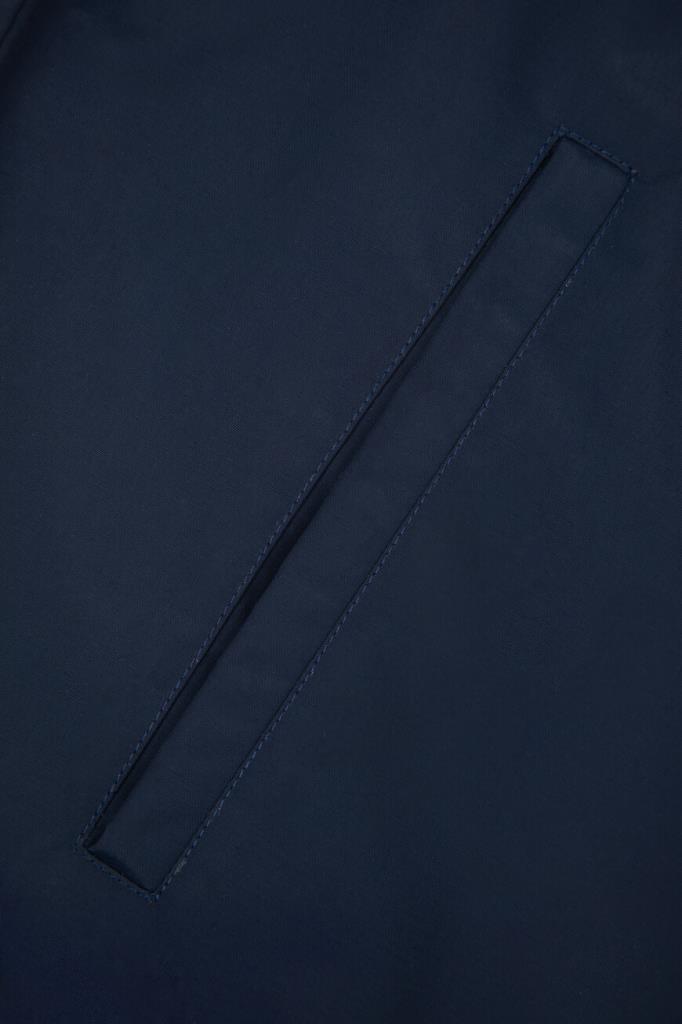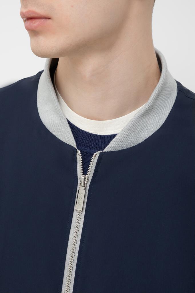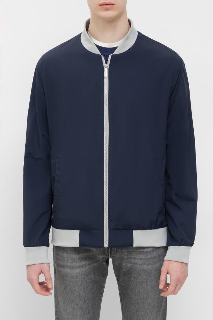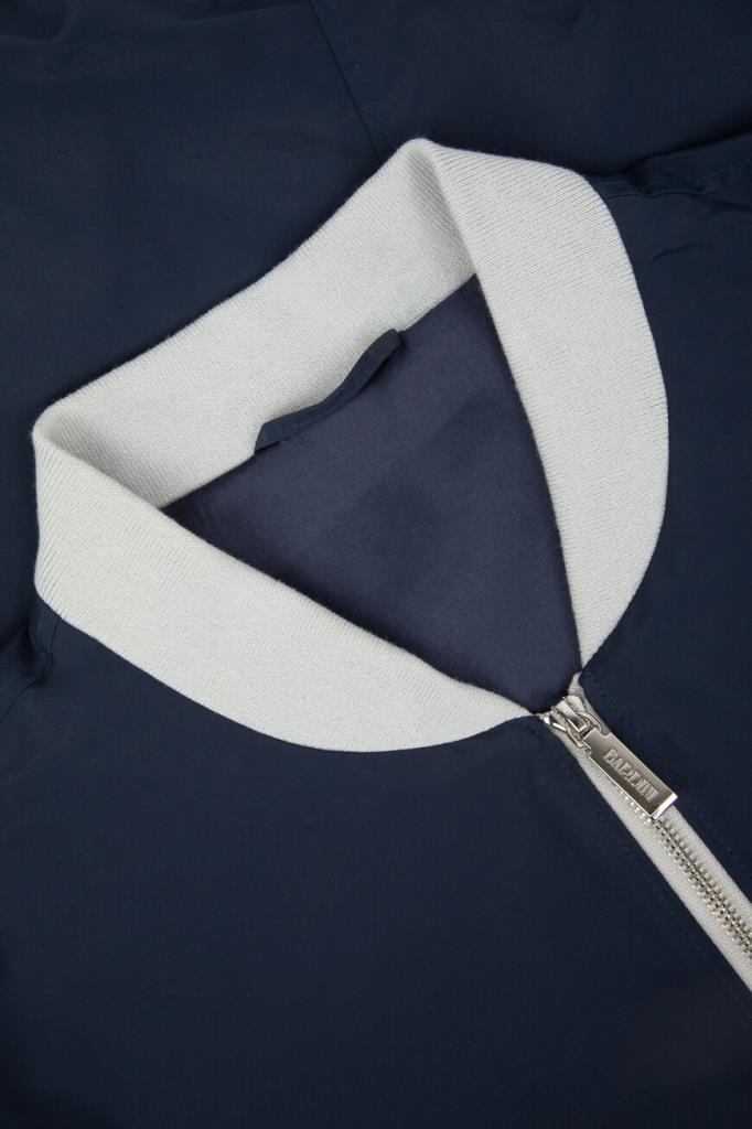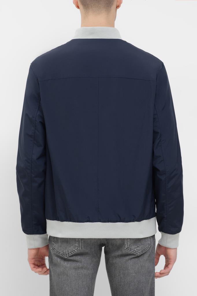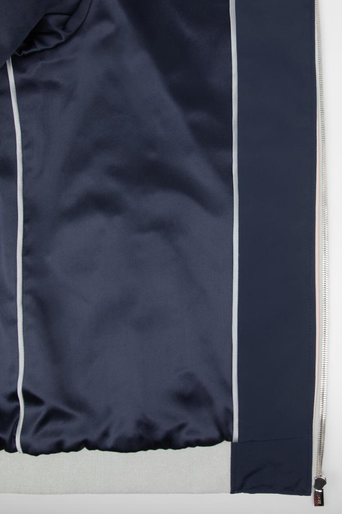Бомбер Bardini из тёмно-синей шерсти с добавлением искусственных волокон. Отличительными деталями являются светло-серые невысокий воротник-стойка, манжеты рукавов и пояс, подобранные на резинку. Дополнительный комфорт обеспечивает блестящая подкладка из полиэстера в тон основе.