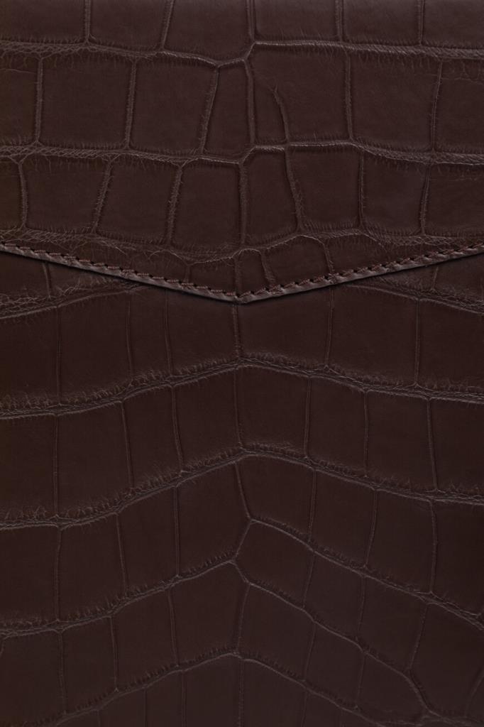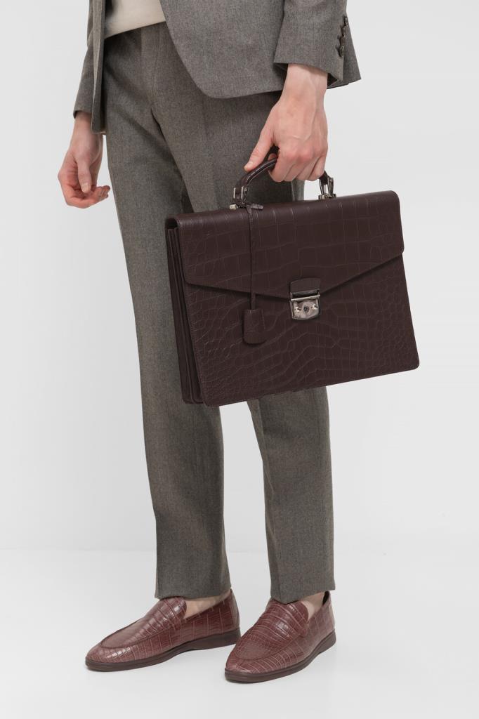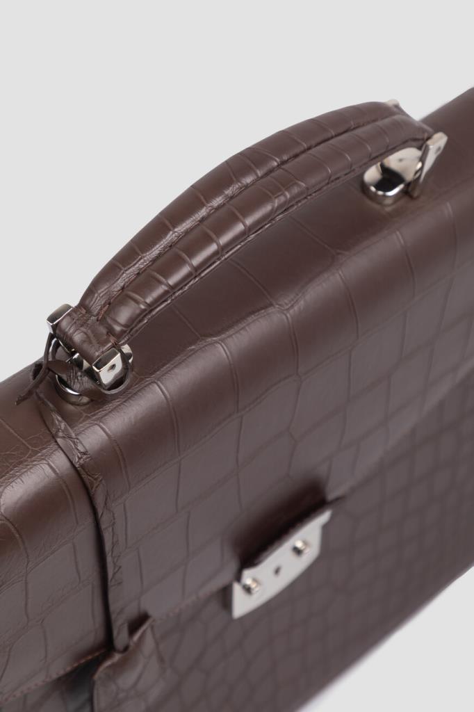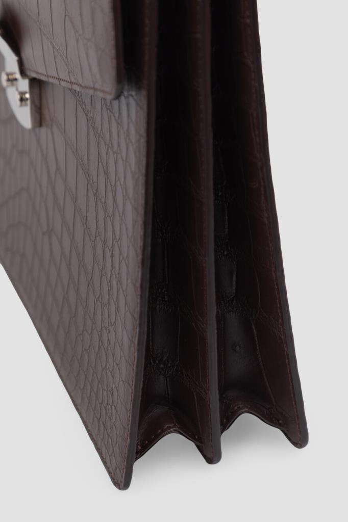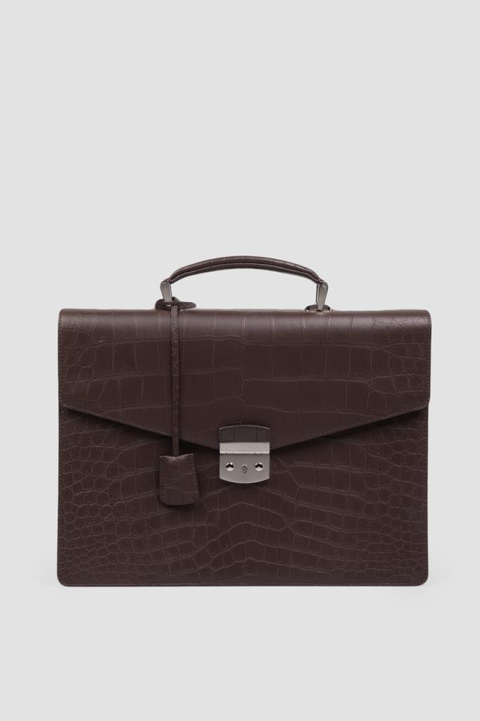 Тёмно-коричневый портфель Bardini из фактурной матовой кожи крокодила. Изделие интересно наличием двух просторных внутренних отделений с откидным клапаном на металлическом замке. Отличительными деталями являются съёмная кожаная подвеска и удобная ручка с металлическими деталями по бокам для переноски.