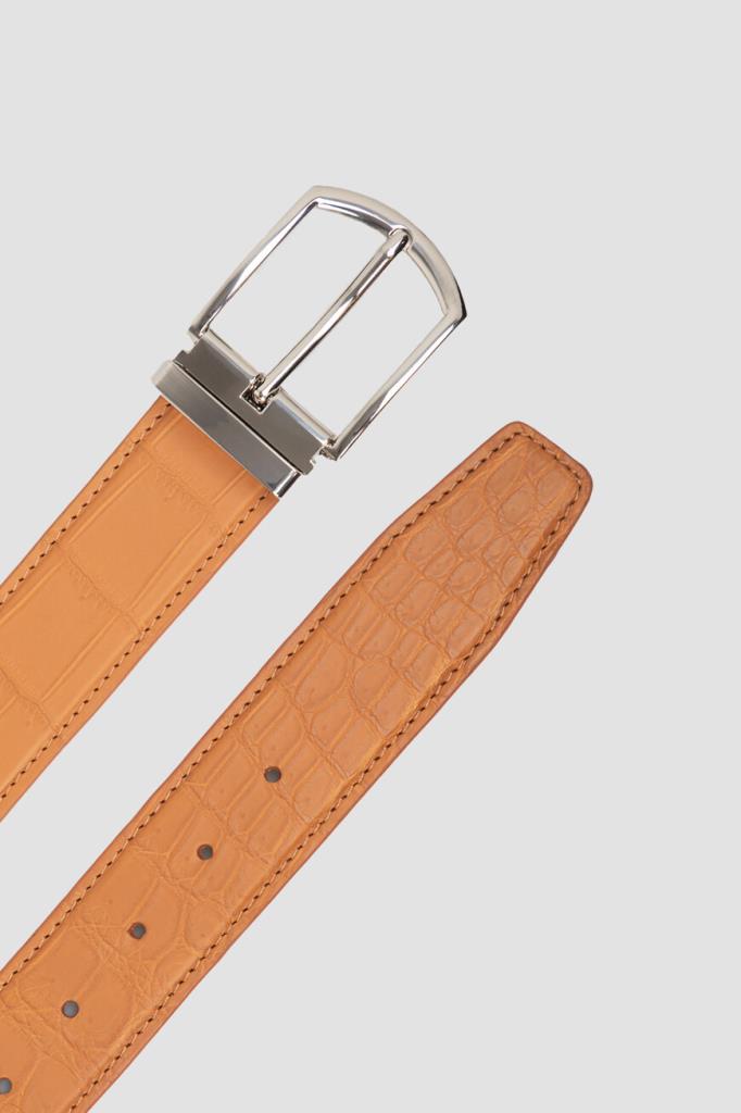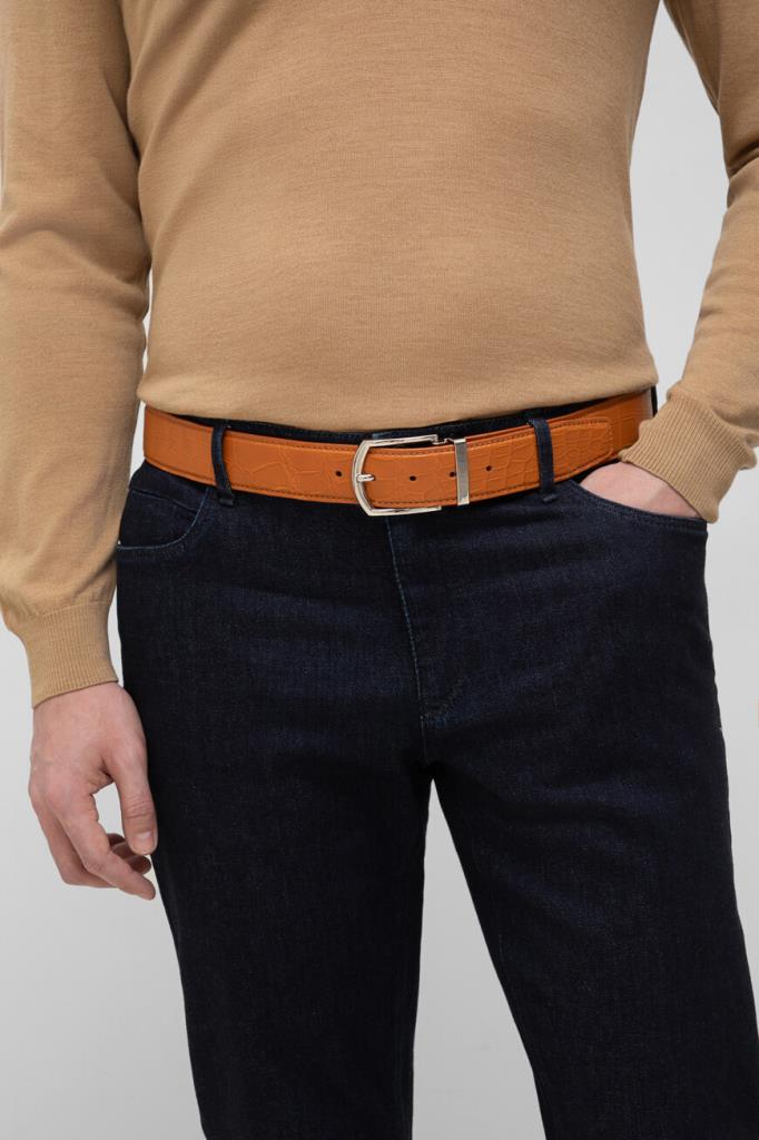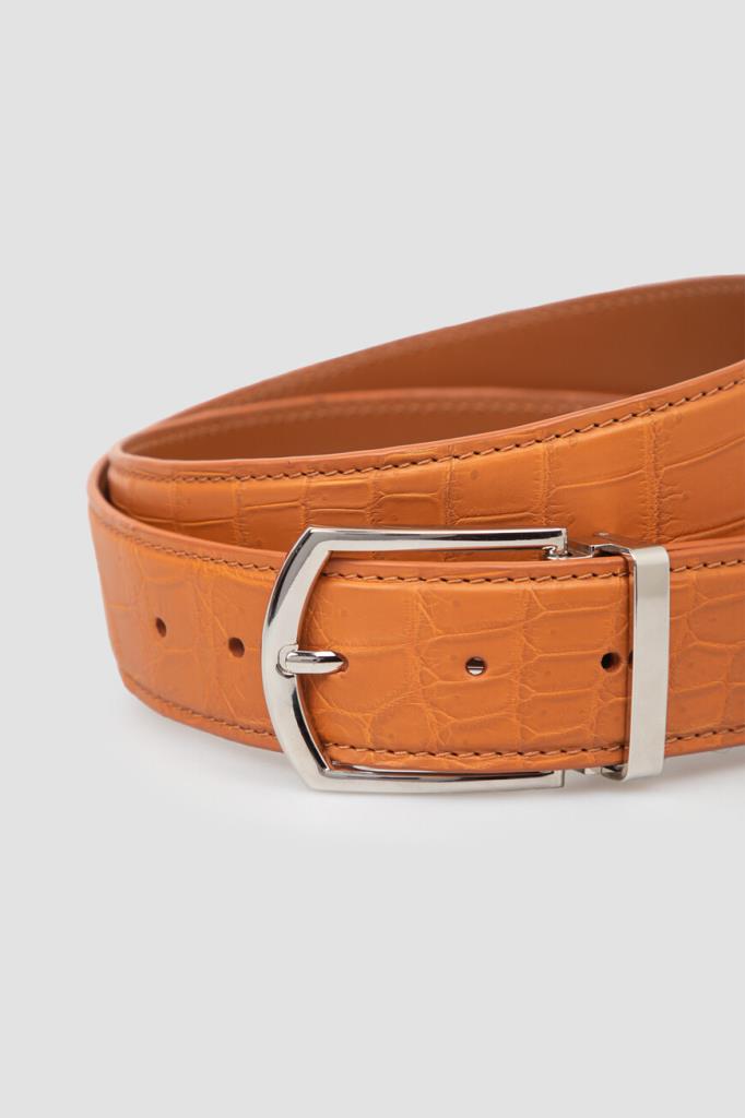Оранжевый ремень Bardini может стать акцентной деталью Вашего образа. Для изготовления модели ручной работы выбрана фактурная матовая кожа нильского крокодила. Материал характеризуется наличием естественного чешуйчатого рисунка на поверхности. Классический аксессуар застёгивается закруглённой прямоугольной пряжкой из латуни с высококачественным и прочным гальваническим покрытием и язычком.