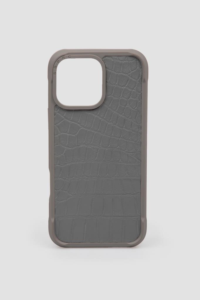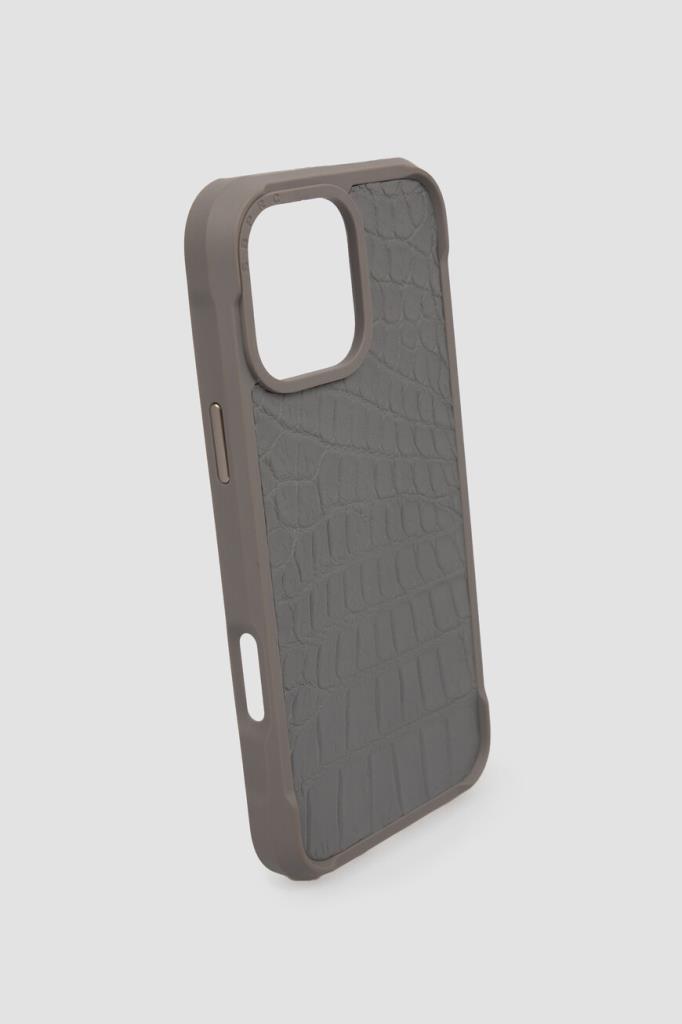 Серый чехол для iPhone 16 Pro Max от Bardini. Для изготовления основы аксессуара выбран плотный пластик, обеспечивающий удобство в использовании, при этом не утяжеляя устройство. Отличительными особенностями изделия стали выступающие детали и вставка из фактурной кожи крокодила итальянской выделки.
