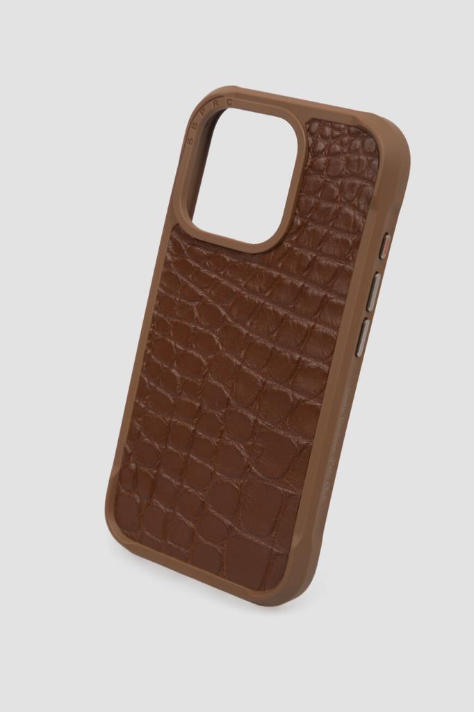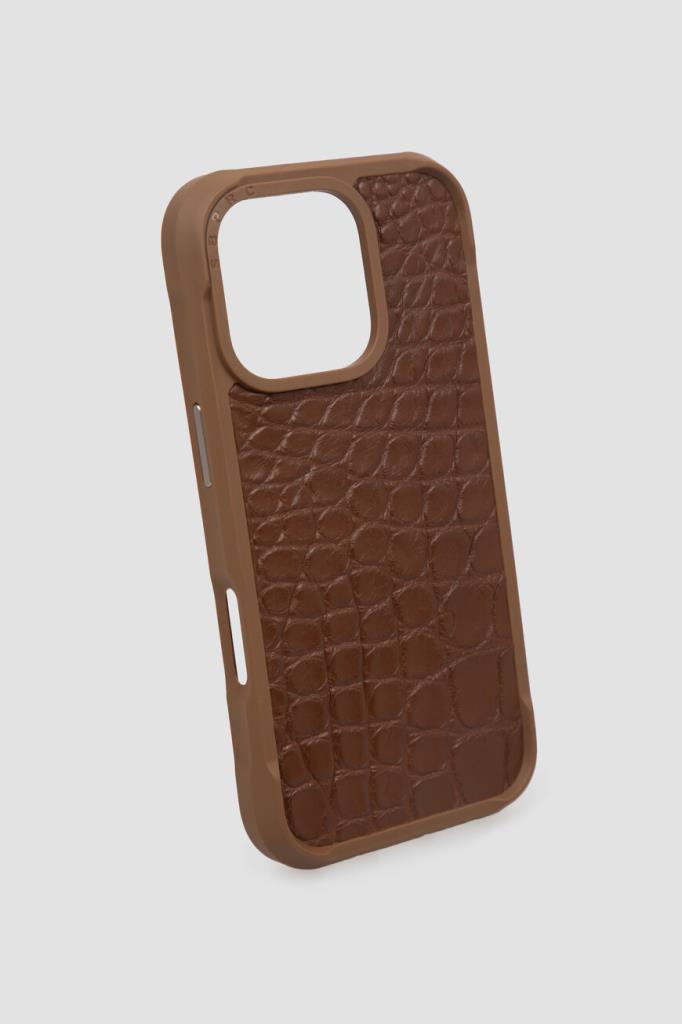 Комбинированный чехол для iPhone 16 Pro от Bardini. Плотная основа изделия выполнена из пластика, который защитит телефон от случайных повреждений. Вставка изготовлена из фактурной кожи крокодила коричневого оттенка с естественным чешуйчатым рисунком.