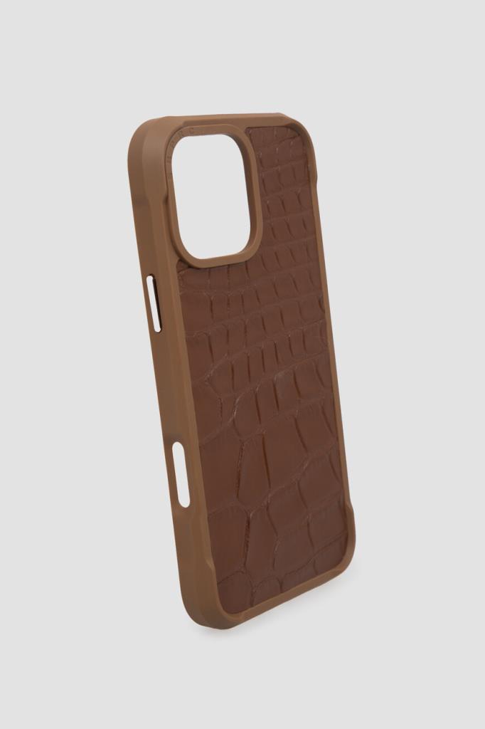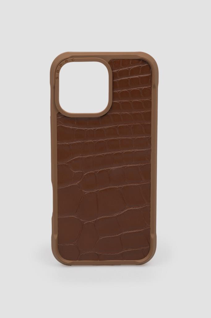 Комбинированный чехол для iPhone 16 Pro Max от Bardini. Плотная основа изделия выполнена из пластика, который защитит телефон от случайных повреждений. Вставка изготовлена из фактурной кожи крокодила коричневого оттенка с естественным чешуйчатым рисунком.