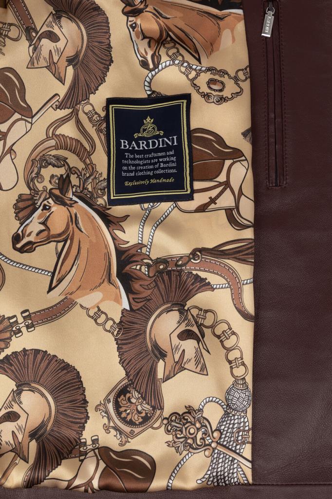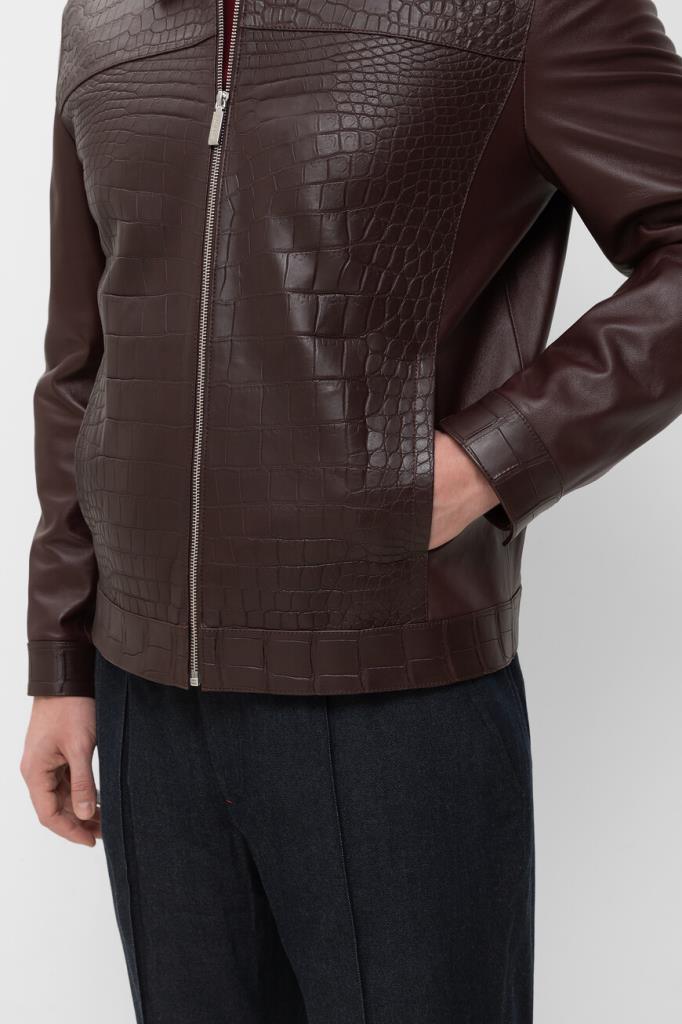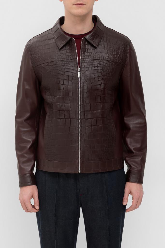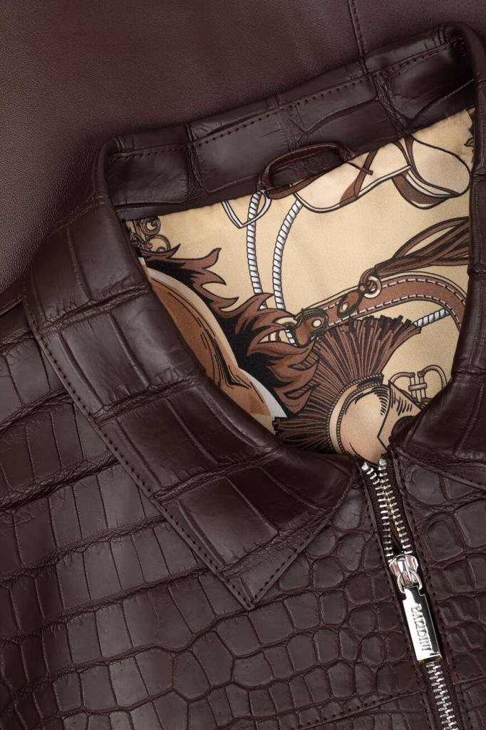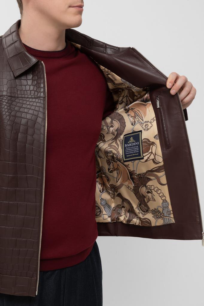 Комбинированная куртка тёмно-бордового оттенка от Bardini. Для изготовления модели прямого силуэта используются гладкая кожа ягнёнка и фактурная кожа крокодила в тон. Фасон изделия предполагает наличие отложного воротника и застёжки на серебристую молнию с брендированным металлическим пуллером. Отличительной особенностью куртки является подкладка из эластичного шелкового атласа и принтом на рыцарскую тематику.