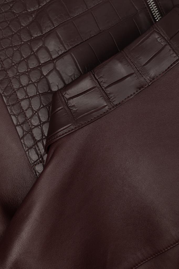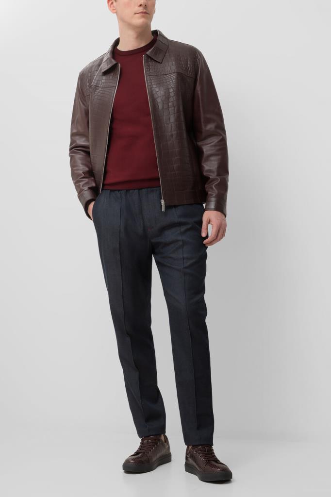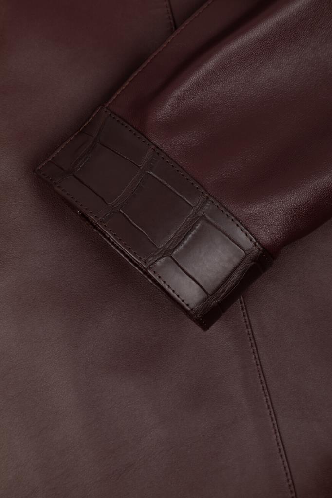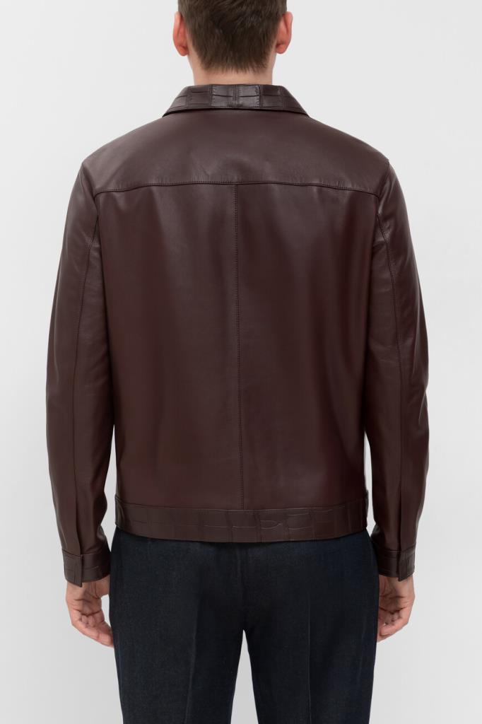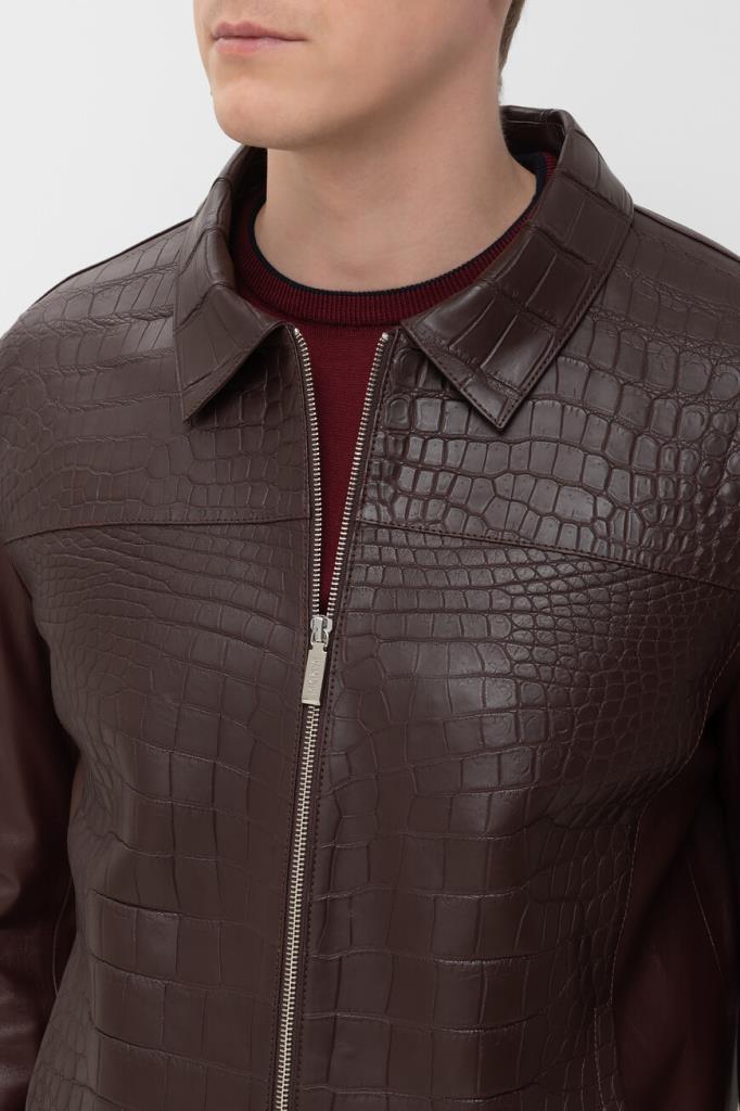 Комбинированная куртка тёмно-бордового оттенка от Bardini. Для изготовления модели прямого силуэта используются гладкая кожа ягнёнка и фактурная кожа крокодила в тон. Фасон изделия предполагает наличие отложного воротника и застёжки на серебристую молнию с брендированным металлическим пуллером. Отличительной особенностью куртки является подкладка из эластичного шелкового атласа и принтом на рыцарскую тематику.