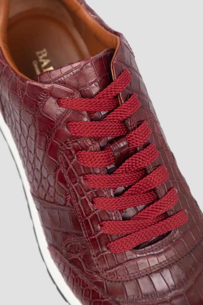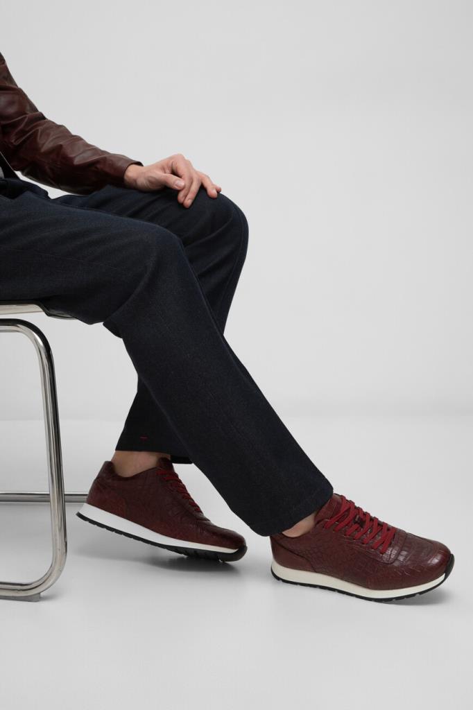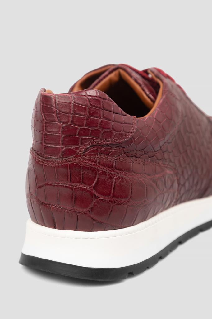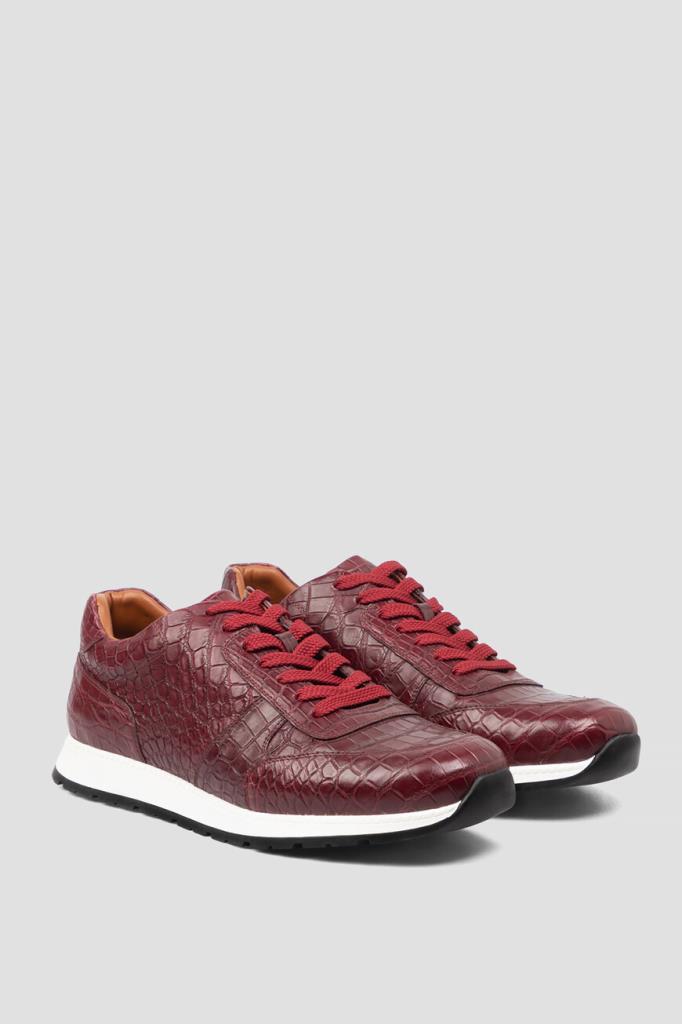 Бордовые кроссовки ручной работы от Bardini. Для изготовления удобной пары используется фактурная кода нильского крокодила с естественным природным рисунком. Изделие является неотъемлемым атрибутом спортивного стиля, предполагающим наличие закрытого типа шнуровки и чёрно-белой амортизирующей подошвы с протектором для дополнительной устойчивости.