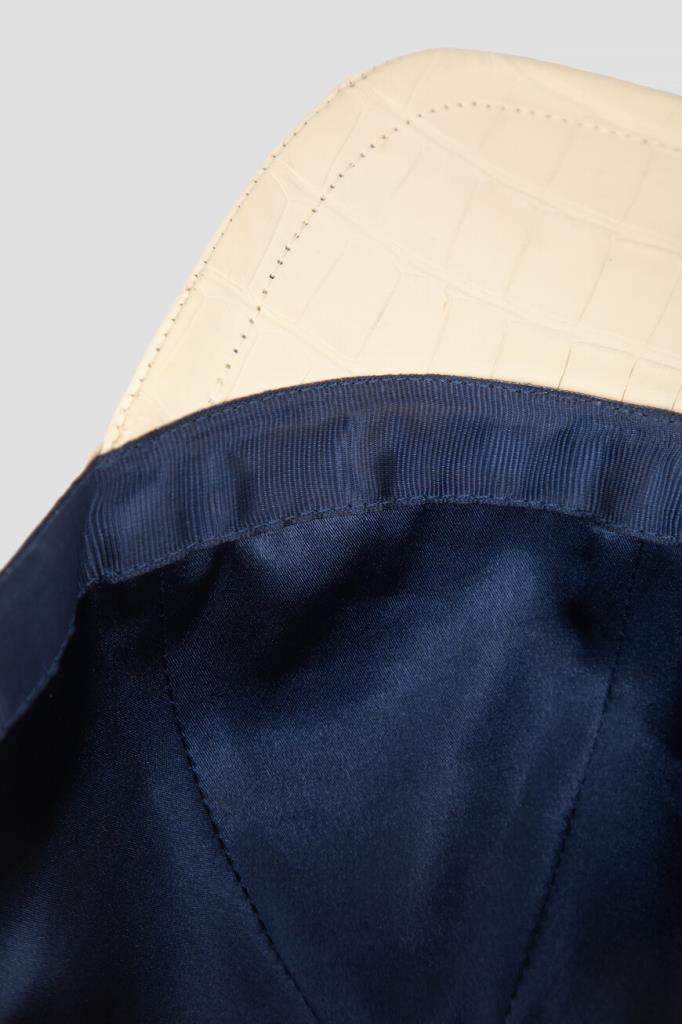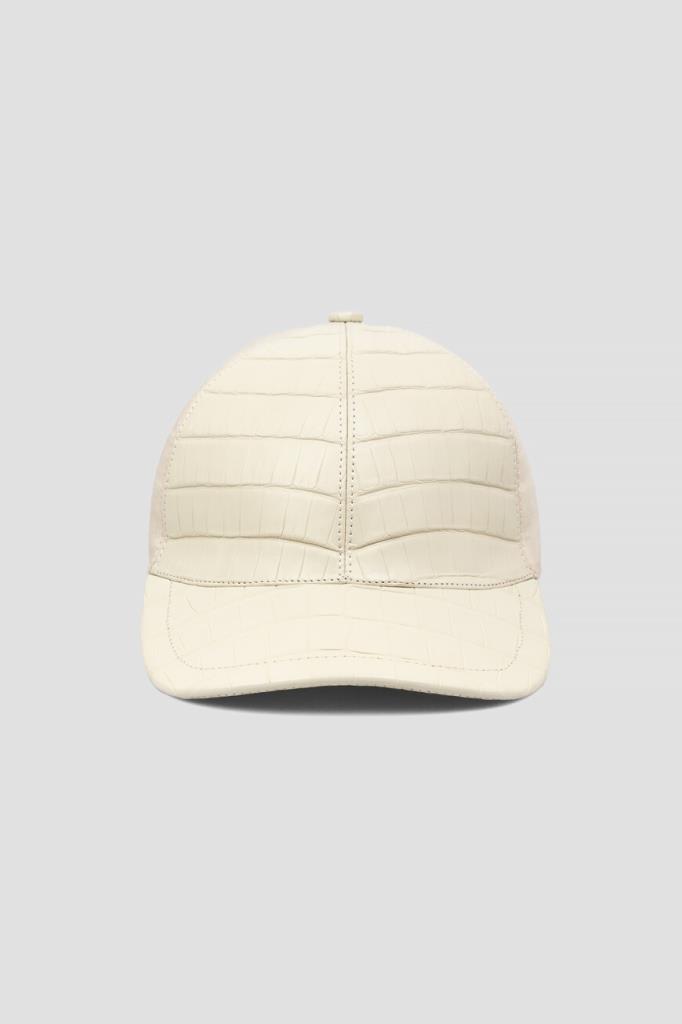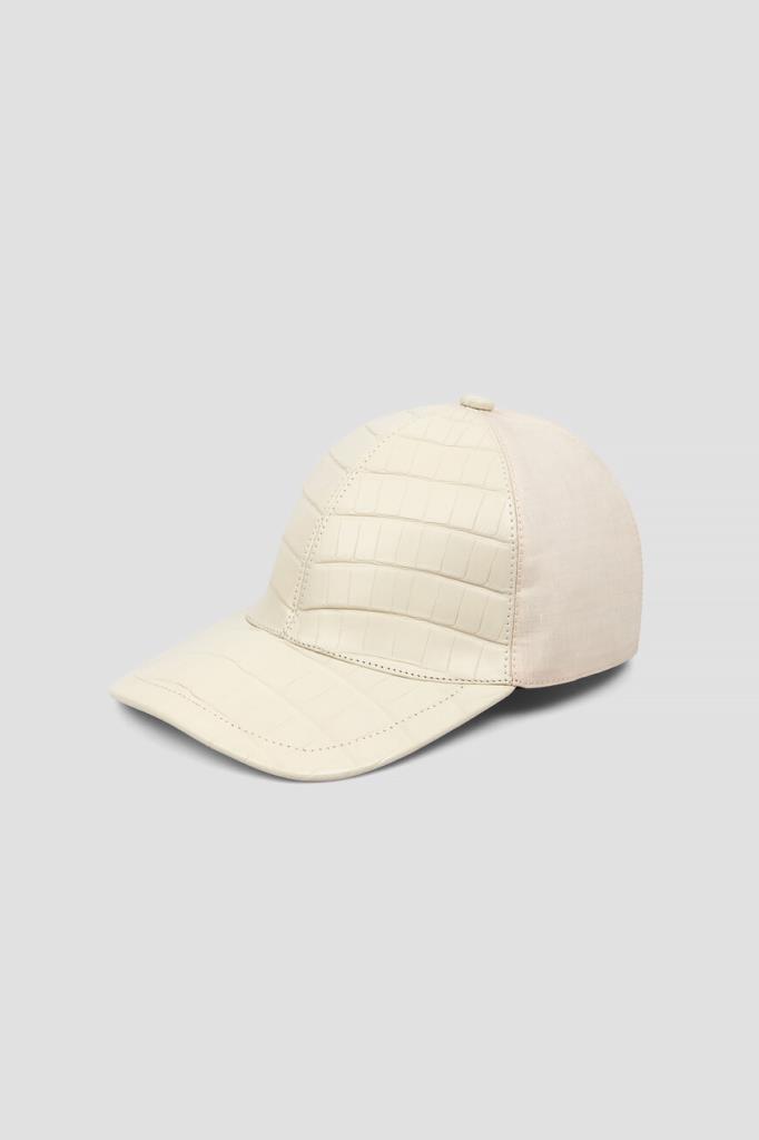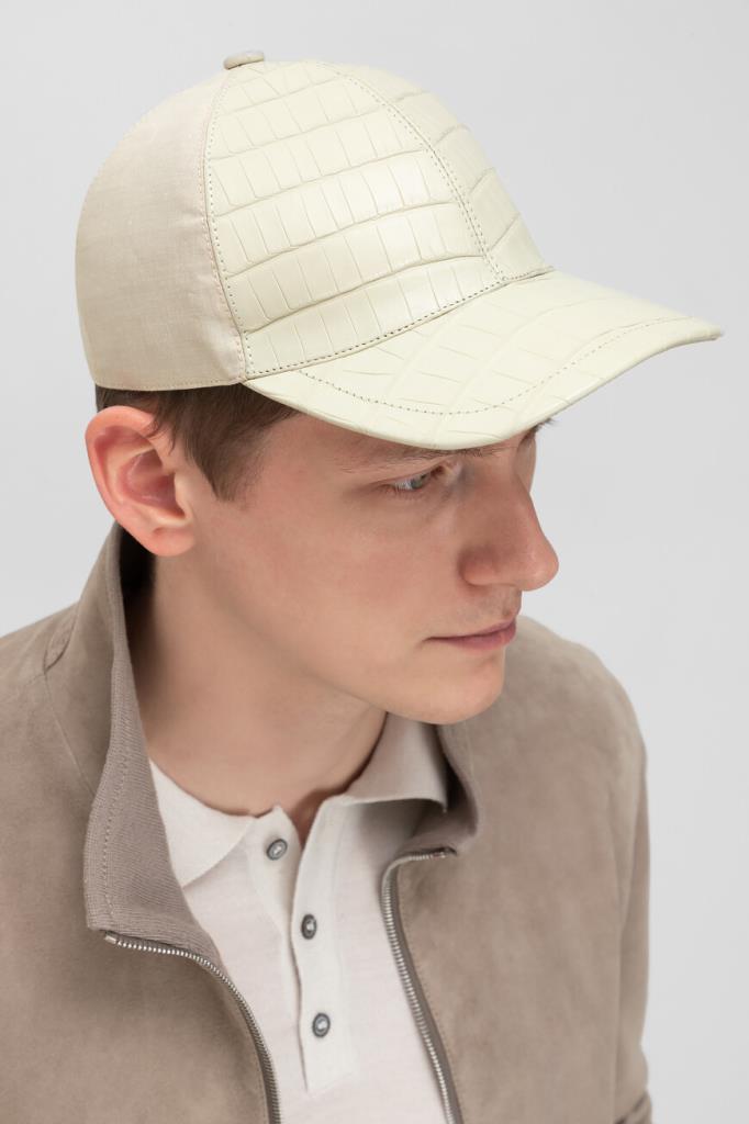 Белая бейсболка Bardini идеально подходит для осенне-зимнего сезона. Для изготовления модели традиционной формы выбран микс из фактурной кожи крокодила с естественным природным рисунком и лёгкого мягкого льна. Изделие регулируется по объёму благодаря ремешку с серебристой металлической пряжкой сзади.