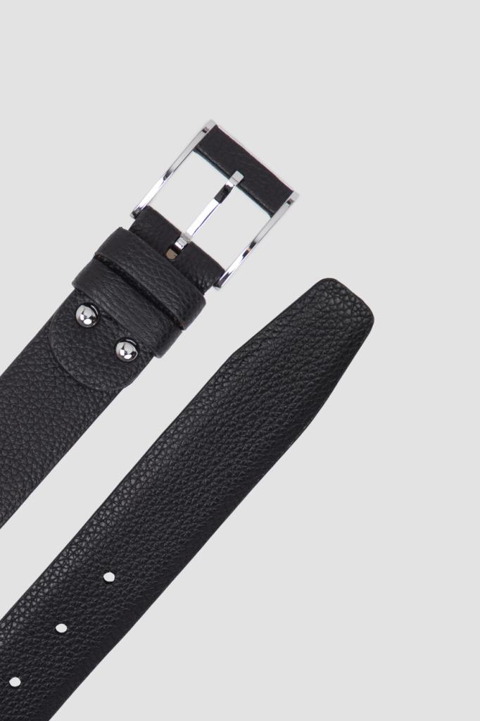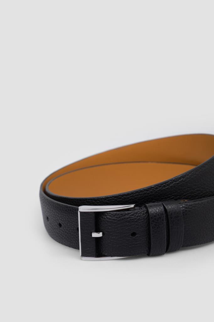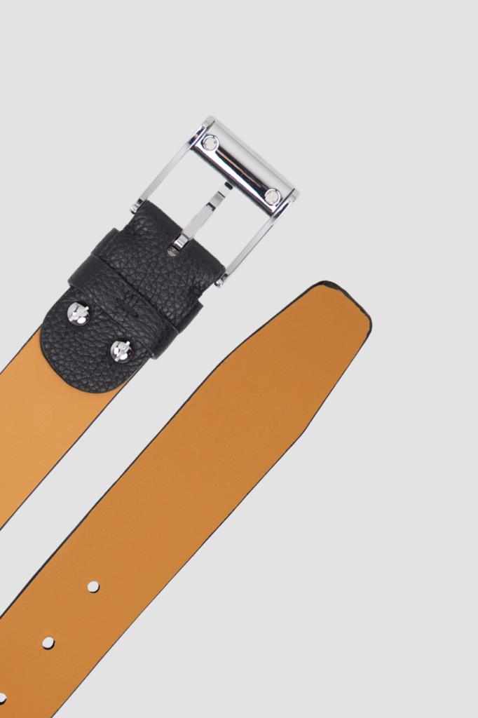 Кожаный ремень Bardini с классической прямоугольной пряжкой. Изделие чёрного базового цвета интересно зернистой текстурой материала итальянской выделки и наличием двух подвижных тренчиков для фиксации наконечника. Атрибутом Дома стала серебристая надпись-логотип на подкладке из из гладкой телячьей кожи коричневого оттенка.
