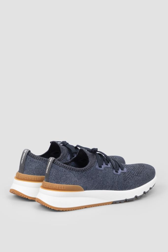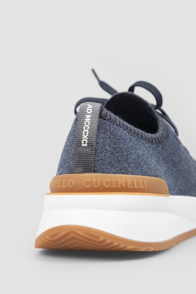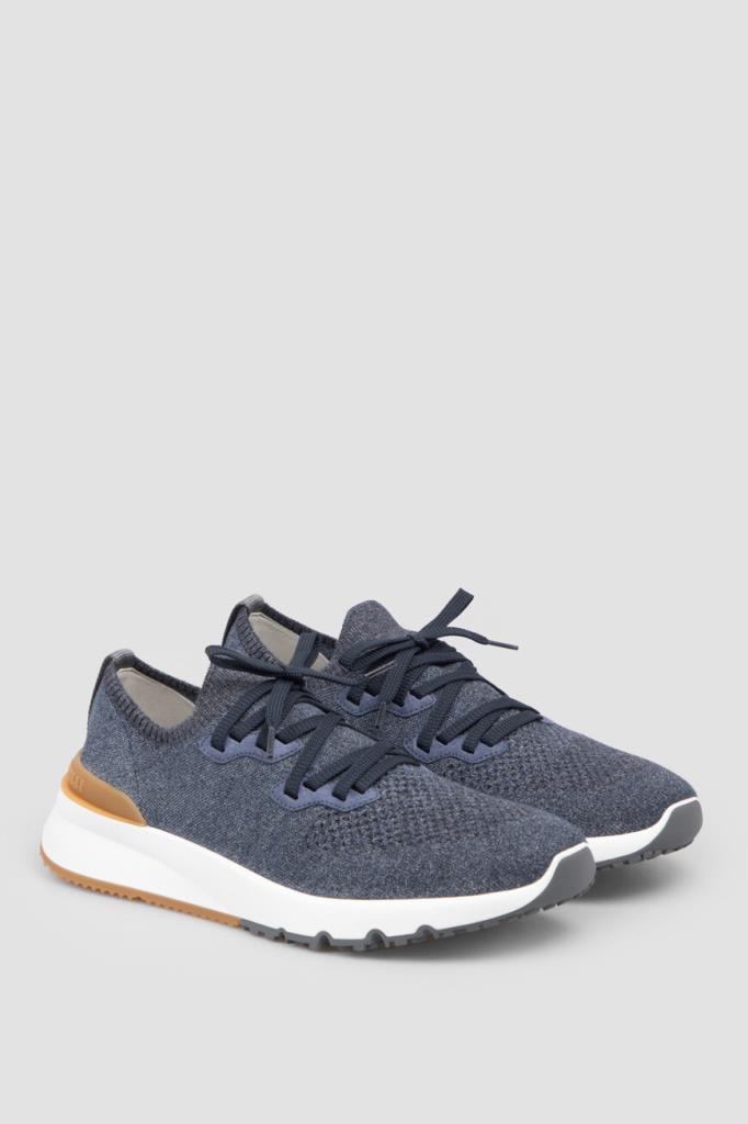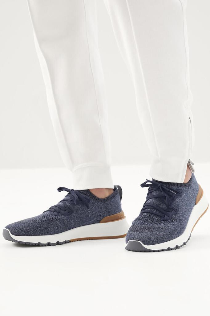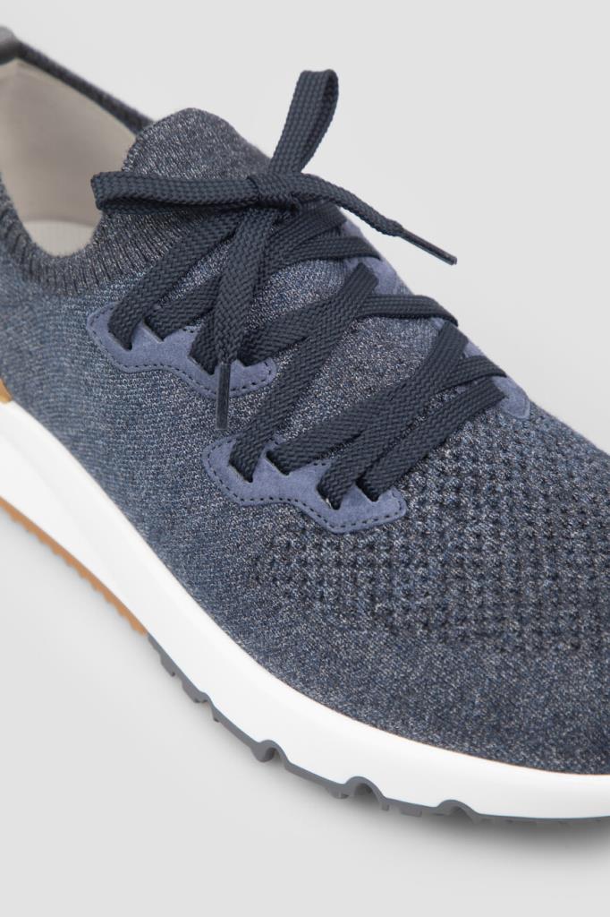 Сникеры тёмно-синего цвета от BRUNELLO CUCINELLI с разными текстурами. Модель изготовлена из очень лёгкого узорчатого трикотажа на основе хлопка стрейч и прочного нейлона. Эластичность ткани обеспечивает плотное прилегание сникеров и максимальный комфорт при носке. Конструкция удобной пары характеризуется укреплёнными округлым носком, отделанным по технологии микроперфорации, типичной для спортивной обуви, и задником, а также наличием открытого типа шнуровки. Верх изделия оформлен резинкой, а мыс и задник защищены от повреждений с помощью прорезиненных накладок.