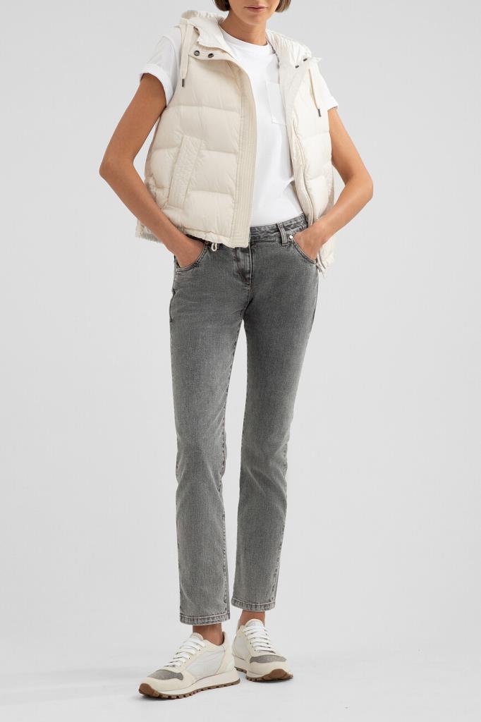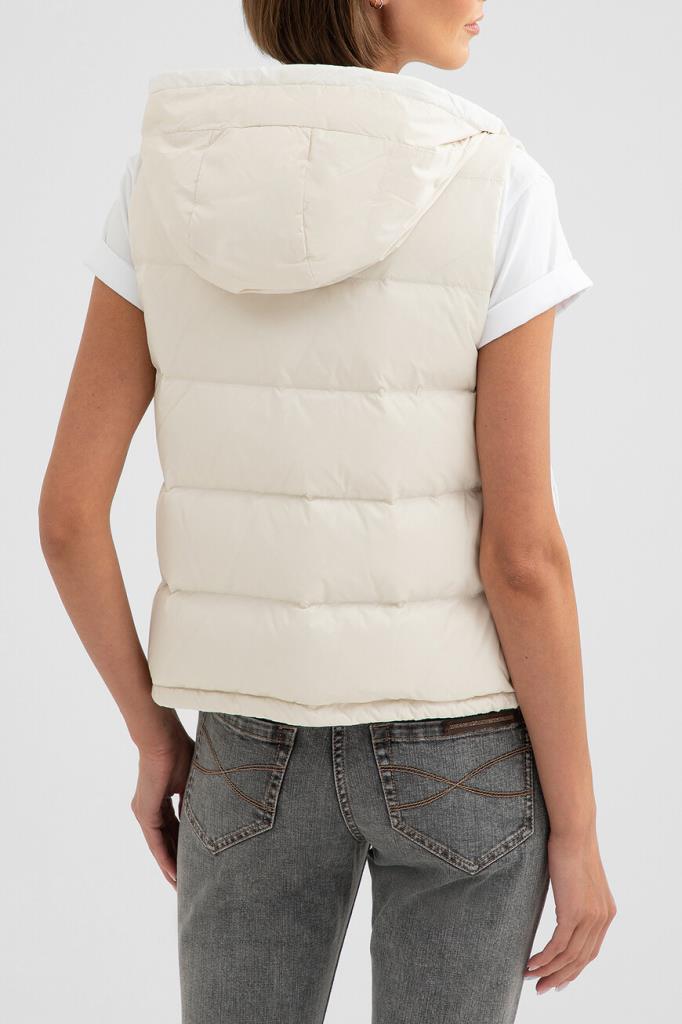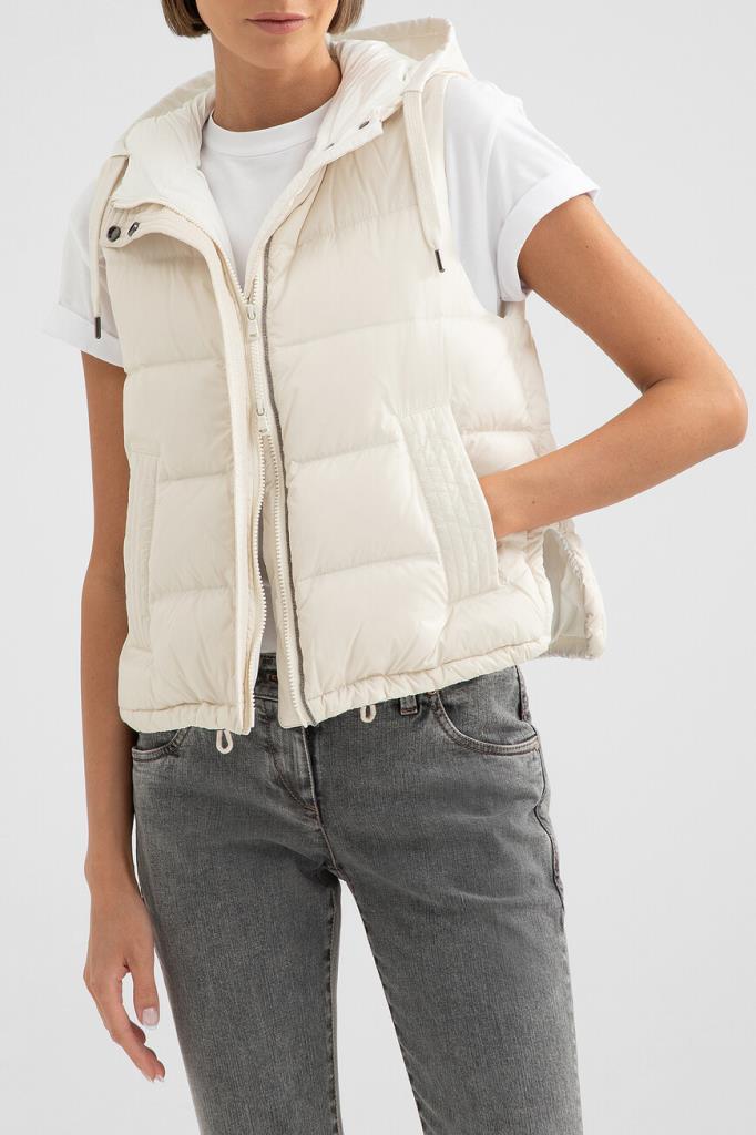Cтёганый жилет из лёгкого матового нейлона от BRUNELLO CUCINELLI. Короткая модель ванильного оттенка отличается надёжной защитой от холода и контакта с водой и утонченными деталями. Изделие, идеально подходящее для переменчивой погоды межсезонья, украшено полосой из блестящей цепочки Мониль, повторяющей контуры застёжки. Особенностью жилета стал мягкий наполнитель на основе натурального гусиного пуха и пера высокого качества. Все виды утеплителя приобретаются исключительно у европейских заводчиков, членов EDFA (Европейской Ассоциации пуха и пера), гарантирующих бережное отношение к животным и окружающей среде.