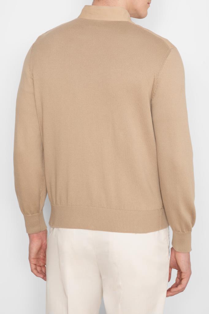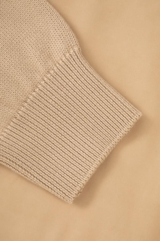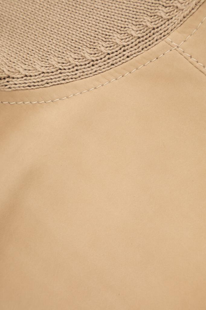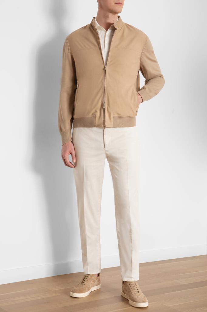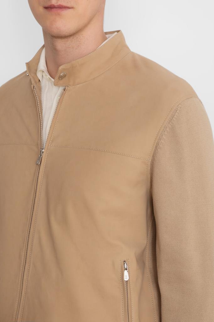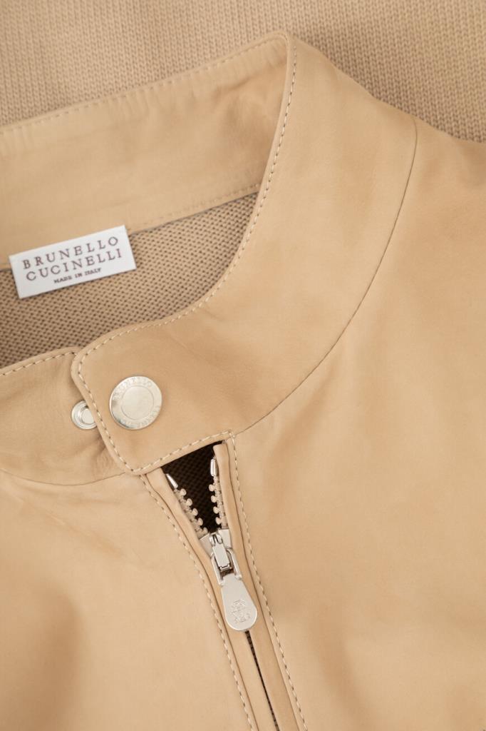 Бежевая куртка-авиатор из двух видов материалов от BRUNELLO CUCINELLI. Изделие выполнено из мягкого хлопкового трикотажа чулочной вязкой и дополнено вставками из бархатистого нубука спереди и на невысоком воротнике-стойке в тон. Модель застёгивается на молнию с двумя брендированными бегунками и характеризуется прямым кроем и двумя прорезными карманами на молнии по бокам. Блестящая подкладка из лёгкой ткани купро обеспечивает комфорт при носке.