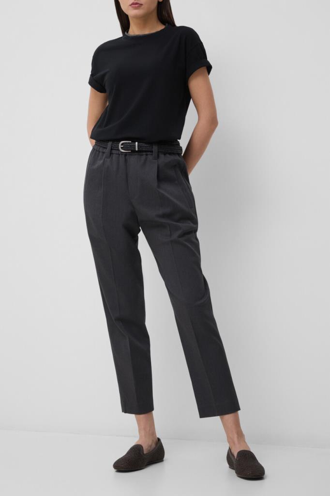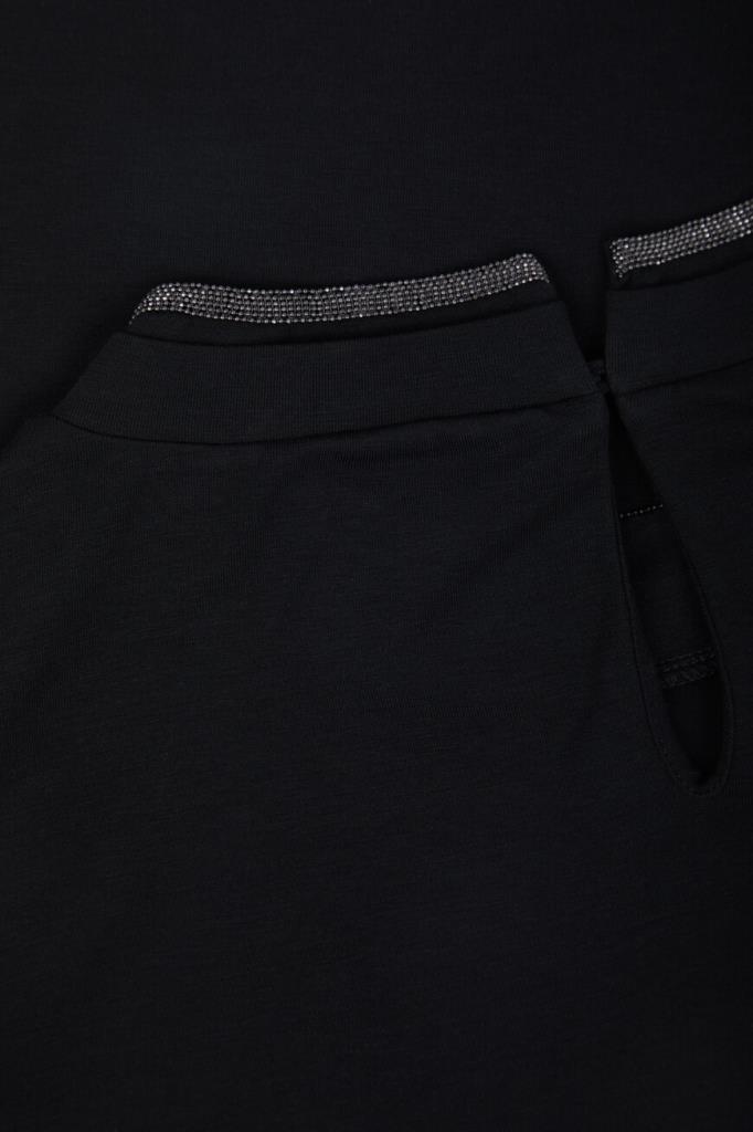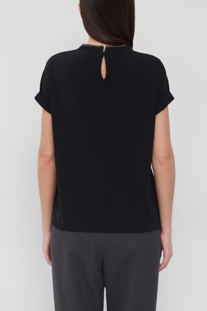 Чёрная футболка BRUNELLO CUCINELLI с эффектом наложения слоёв. Для пошива модели свободного кроя используется мягкое хлопковое джерси. Волокна эластана в составе материала сделали изделие более упругим и прочным. Изысканный воротник, повторяющийся элемент сезона, выделяется на гладкой текстуре футболки: вышивка из рядов тонких нитей блестящей цепочки Мониль образует на круглом вырезе элегантную деталь-украшение.