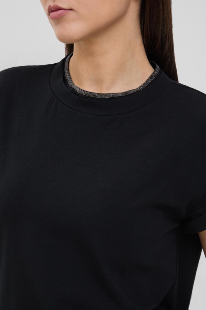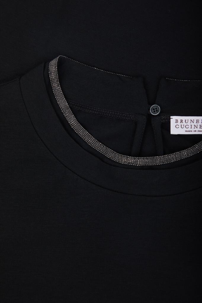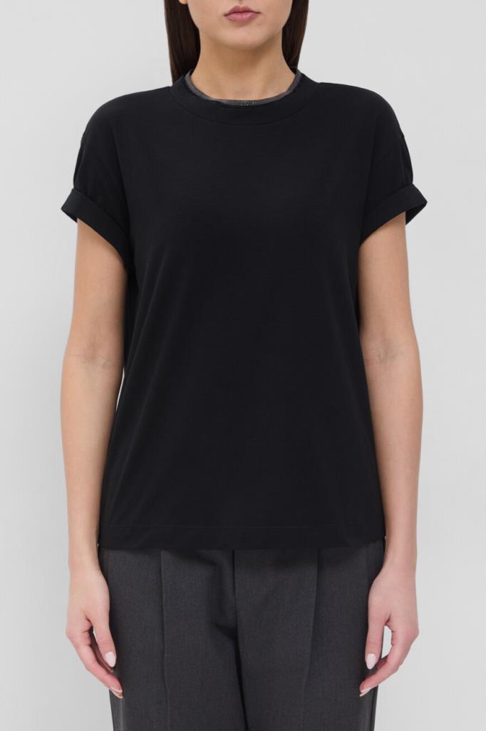 Чёрная футболка BRUNELLO CUCINELLI с эффектом наложения слоёв. Для пошива модели свободного кроя используется мягкое хлопковое джерси. Волокна эластана в составе материала сделали изделие более упругим и прочным. Изысканный воротник, повторяющийся элемент сезона, выделяется на гладкой текстуре футболки: вышивка из рядов тонких нитей блестящей цепочки Мониль образует на круглом вырезе элегантную деталь-украшение.
