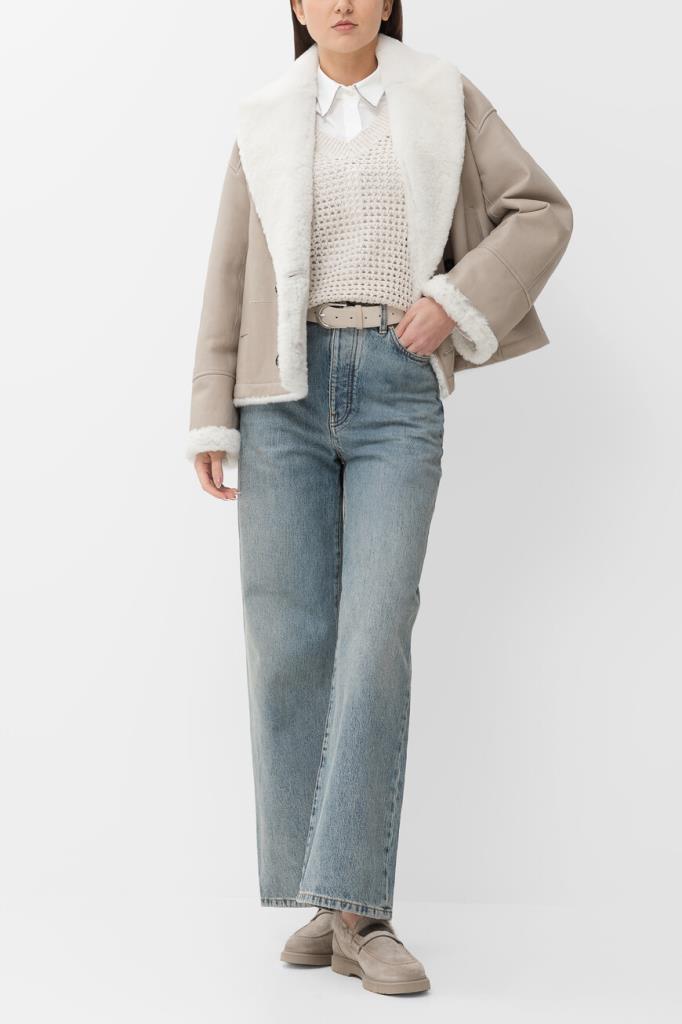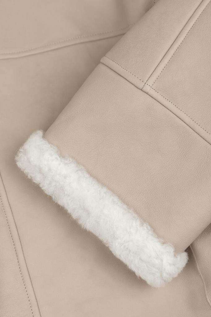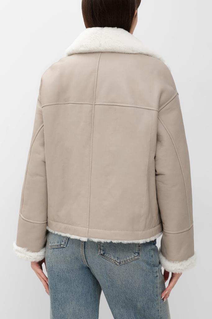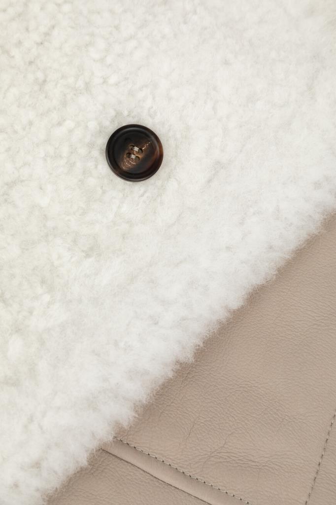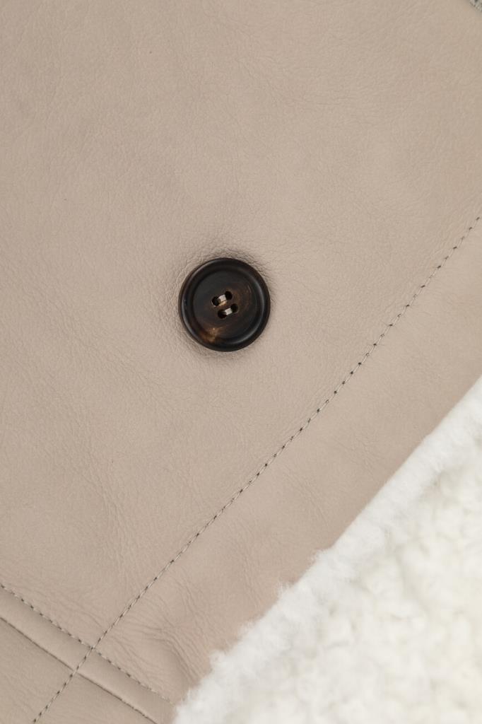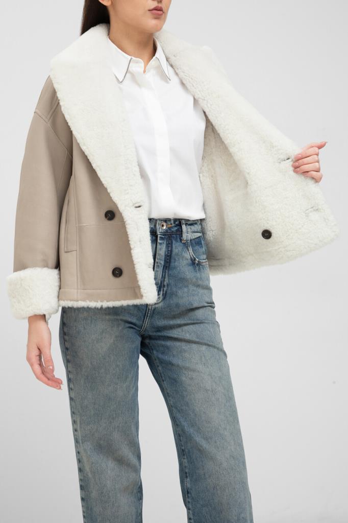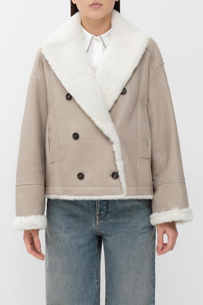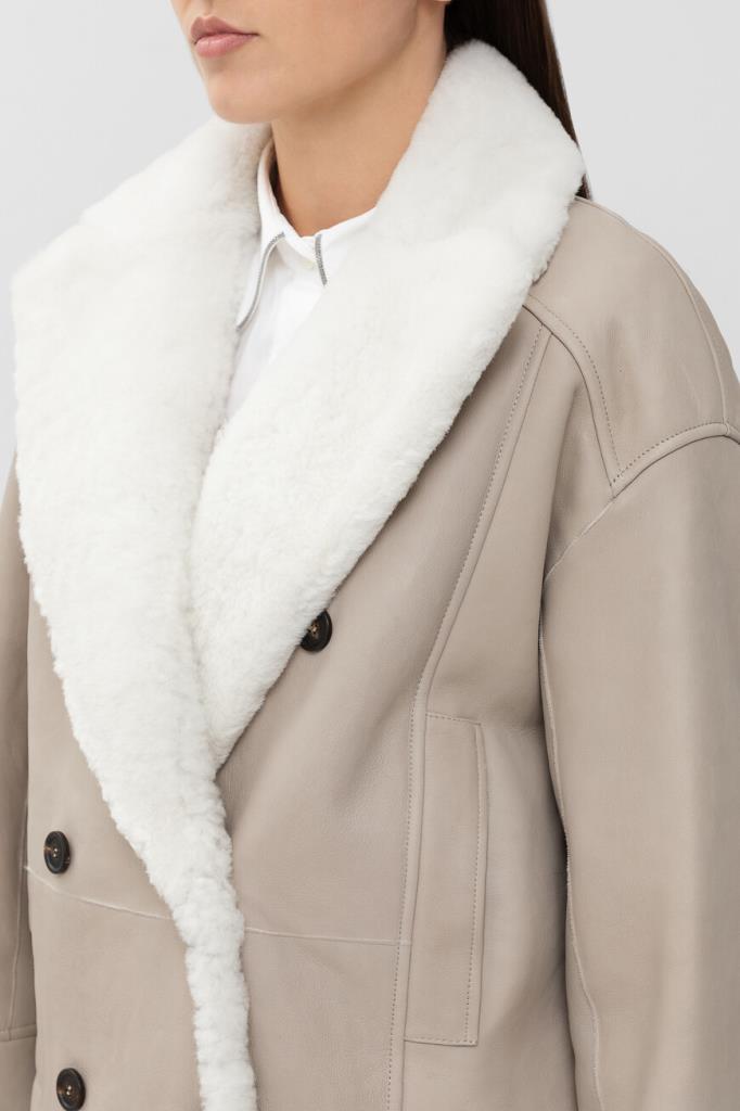 Укороченная дублёнка BRUNELLO CUCINELLI на крупных роговых пуговицах. Для создания двусторонней модели свободного силуэта используются мягкой мелковорсистый нубук бежевого оттенка с наружной стороны и натуральный мех белого цвета с внутренней. Декором выступают меховая отделка на воротнике, планке застёжки, манжетах и поясе кожаной стороны куртки и знаковая вышивка из рядов блестящей цепочки Мониль сзади вдоль нижнего края воротника. Составьте расслабленный комплект в сочетании с белыми брюками в спортивном стиле из той же коллекции.