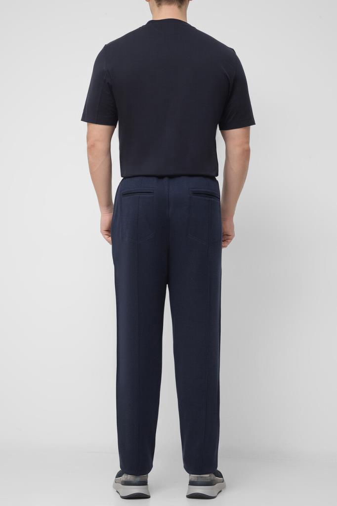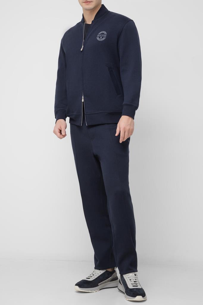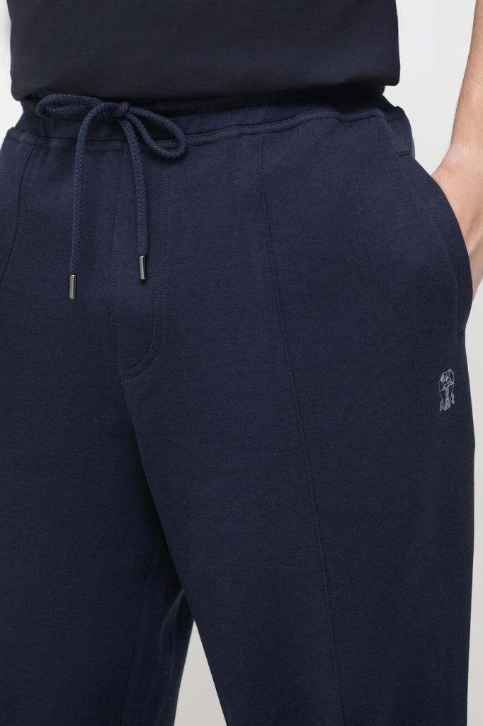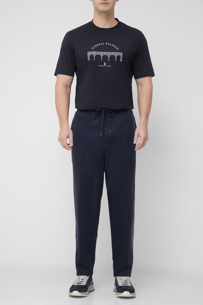 Спортивные брюки BRUNELLO CUCINELLI с декоративными швами. Для пошива модели тёмно-синего цвета выбрано мягкое джерси на основе хлопка, кашемира, гладкого шёлка и прочного нейлона. Изделие свободно сидит на бёдрах и немного сужается книзу. Для оптимальной посадки брюк по линии талии предусмотрен широкий эластичный пояс-кулиска. Декором выступает белая монограмма Дома под левым карманом спереди. Образ можно дополнить олимпийкой с невысоким воротником-стойкой из той же коллекции.