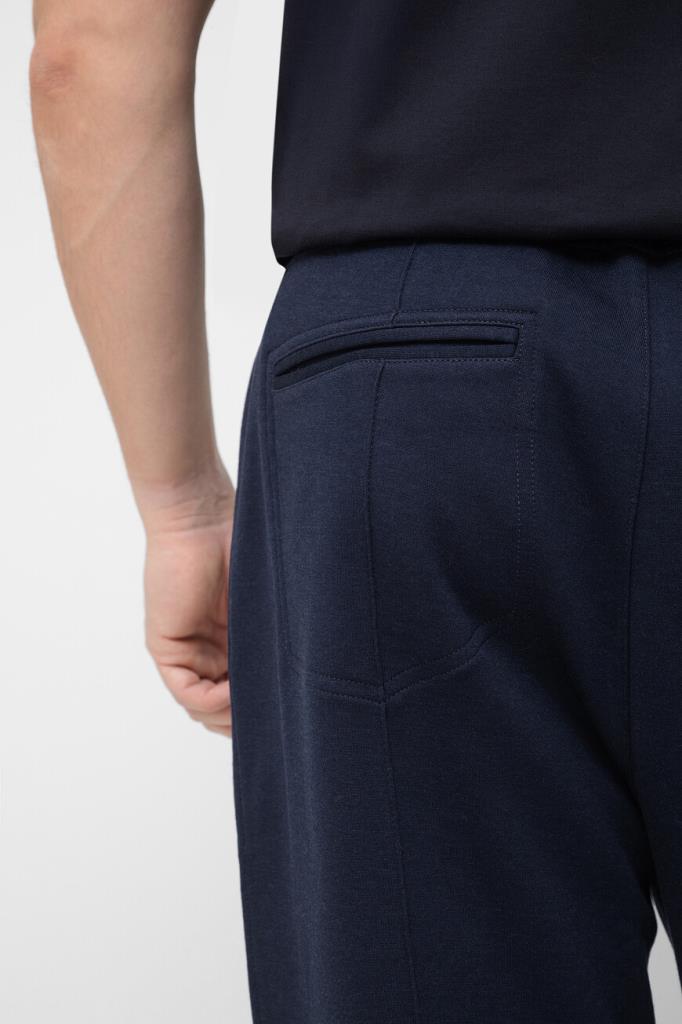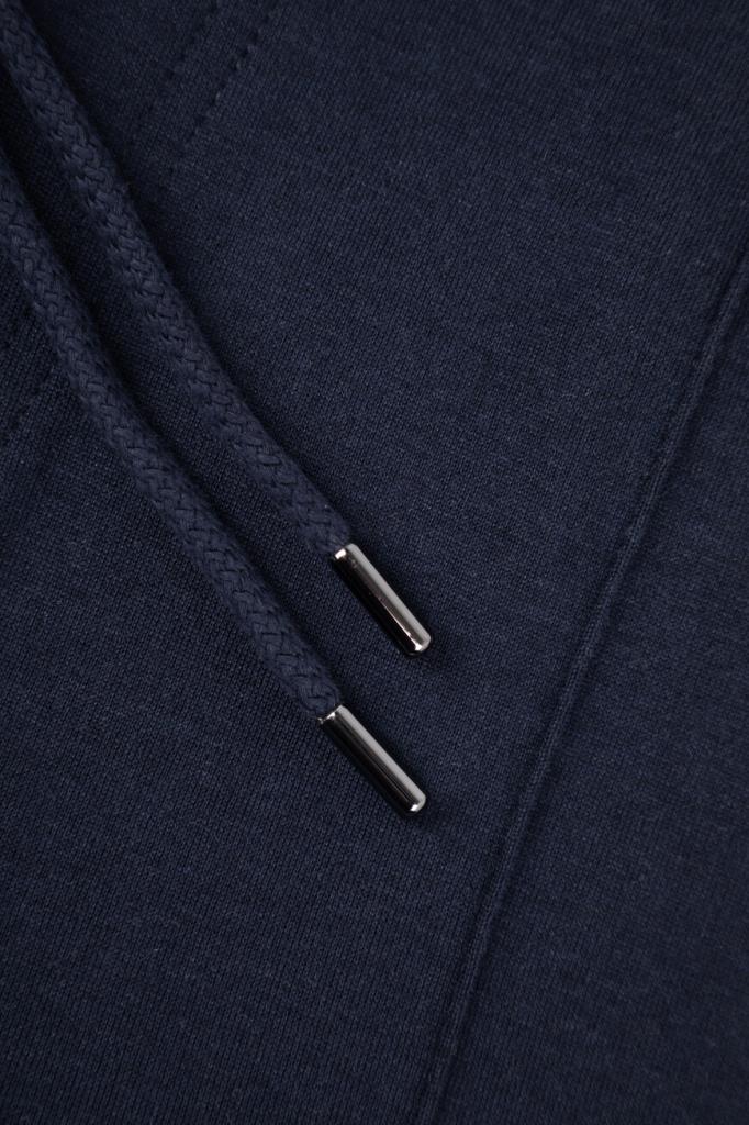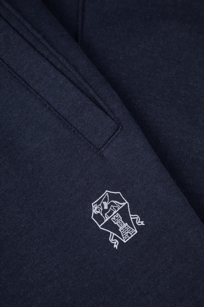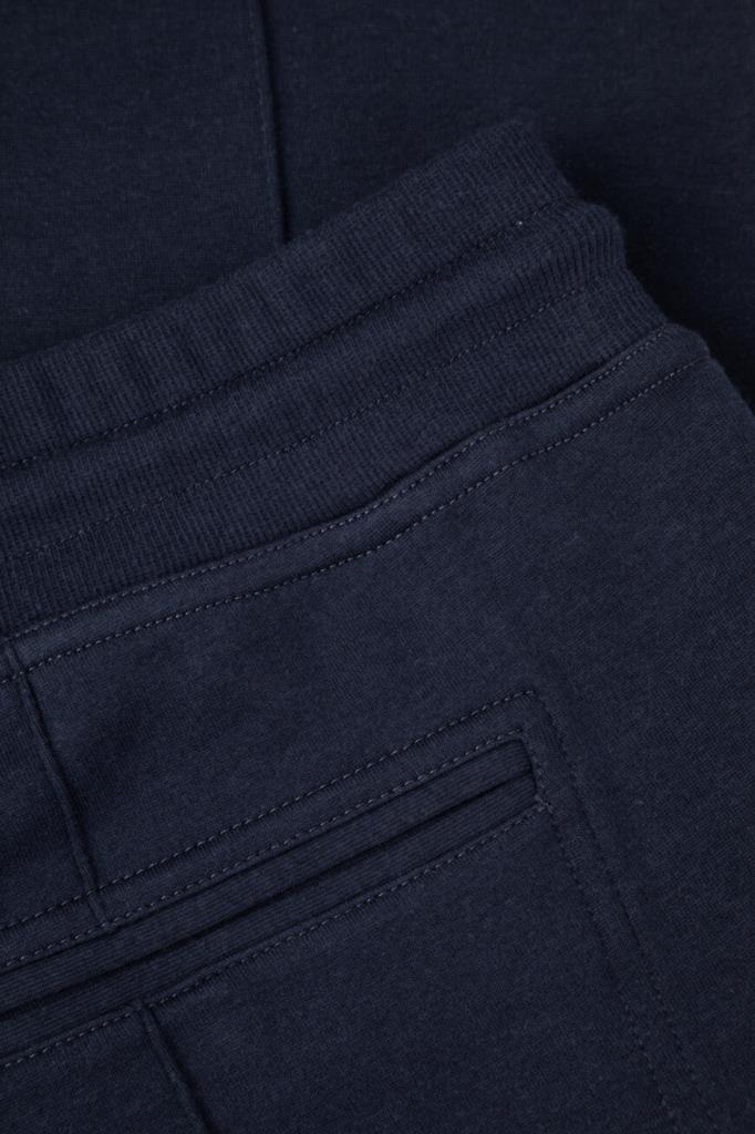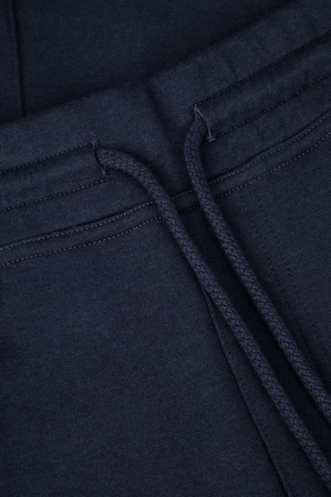 Спортивные брюки BRUNELLO CUCINELLI с декоративными швами. Для пошива модели тёмно-синего цвета выбрано мягкое джерси на основе хлопка, кашемира, гладкого шёлка и прочного нейлона. Изделие свободно сидит на бёдрах и немного сужается книзу. Для оптимальной посадки брюк по линии талии предусмотрен широкий эластичный пояс-кулиска. Декором выступает белая монограмма Дома под левым карманом спереди. Образ можно дополнить олимпийкой с невысоким воротником-стойкой из той же коллекции.