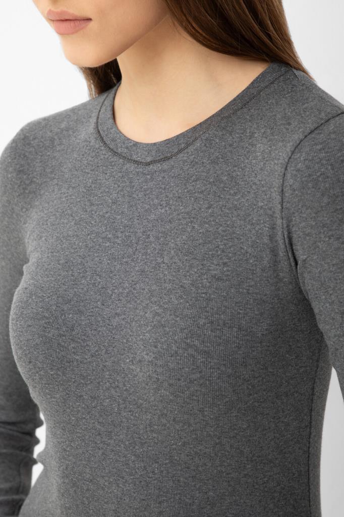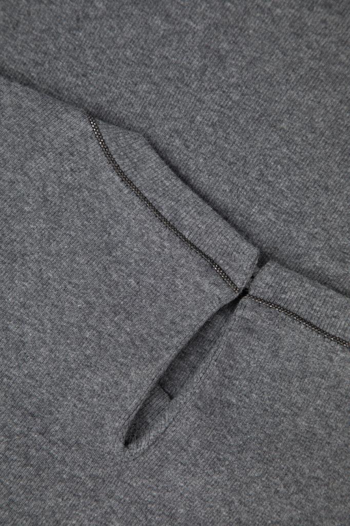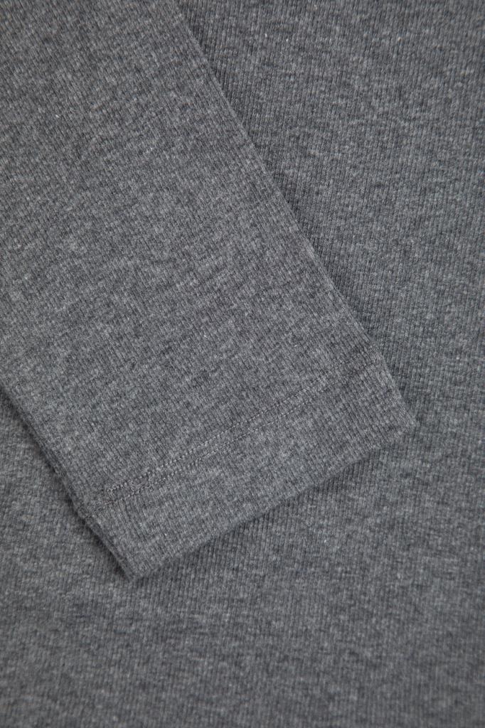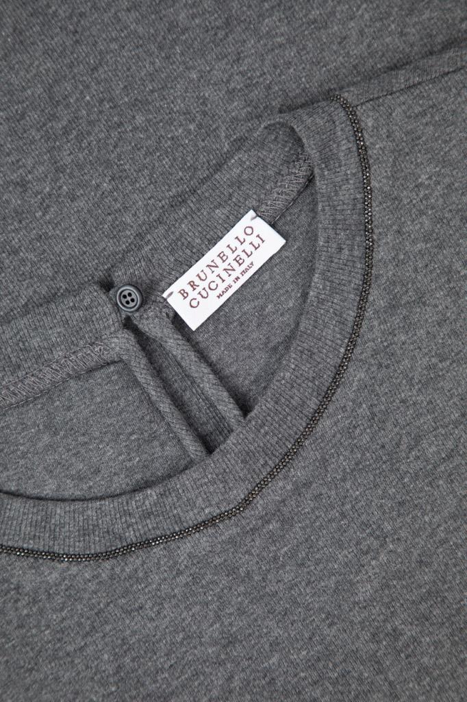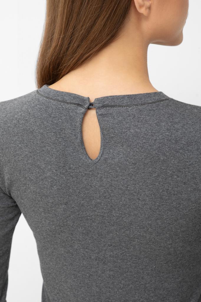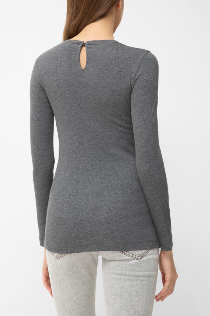 Хлопковый лонгслив прилегающего силуэта от BRUNELLO CUCINELLI. Добавление небольшого количества эластичных волокон в состав материала обеспечивает комфортную посадку модели по фигуре. Изделие тёмно-серого цвета интересно ребристой текстурой и вставкой-полосой из рядов блестящей латунной цепочки Мониль серебристого оттенка вдоль нижнего края воротника.