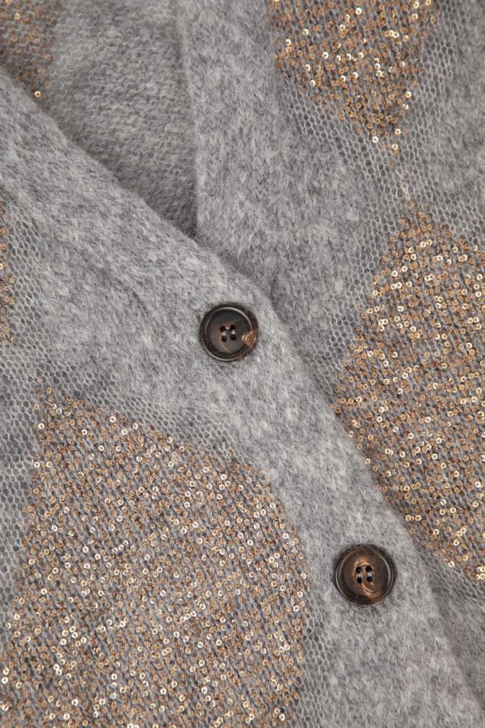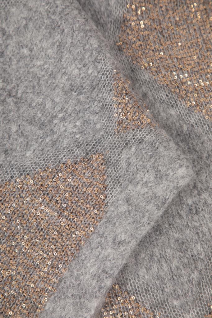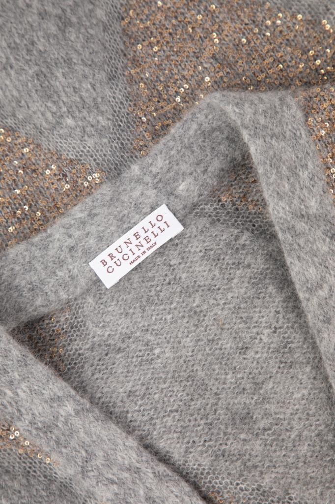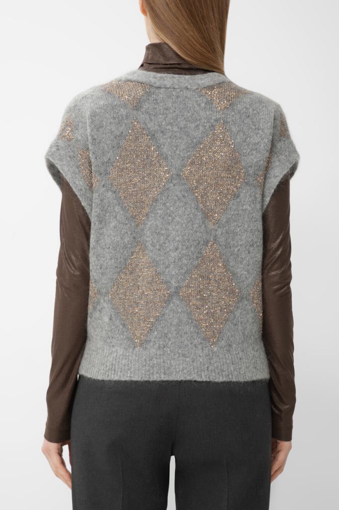 Серый жилет BRUNELLO CUCINELLI с приспущенным плечом. Модель Dazzling Argyle изготовлена из мягкого трикотажа на основе шерсти и мохера с пушистой и воздушной текстурой. Поверхность изделия украшает культовый геометрический мотив в виде ромбов. Узор декорирован россыпью золотистых сияющих на солнце микропайеток.