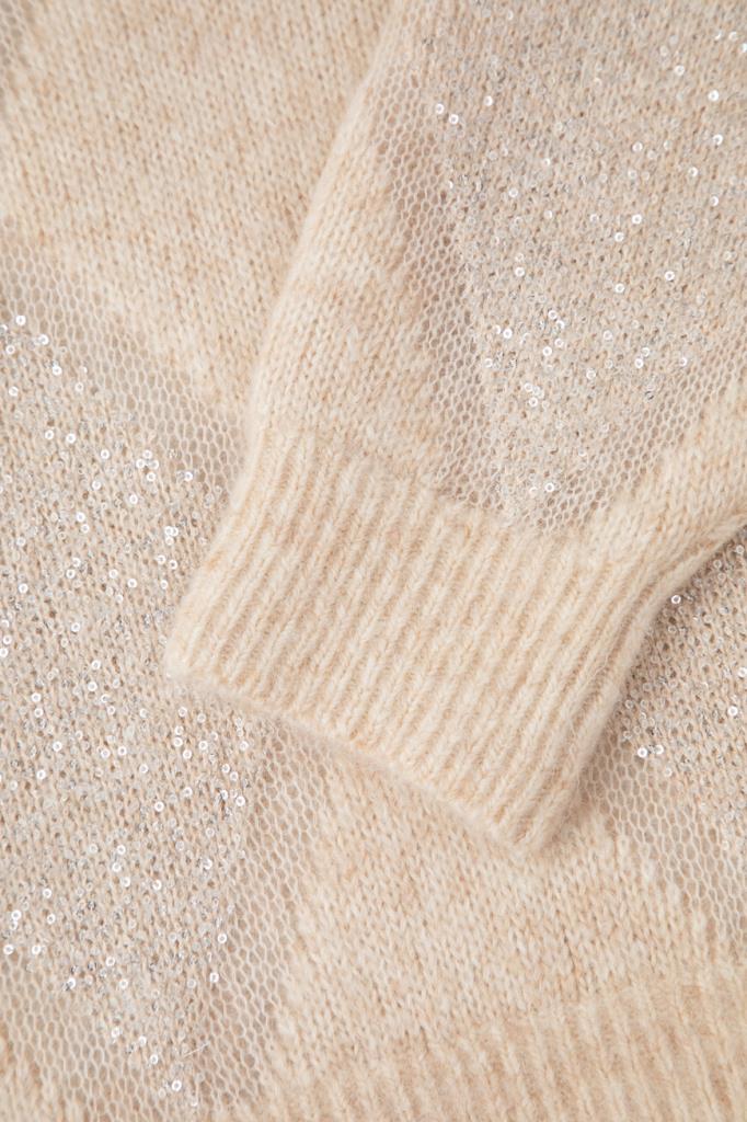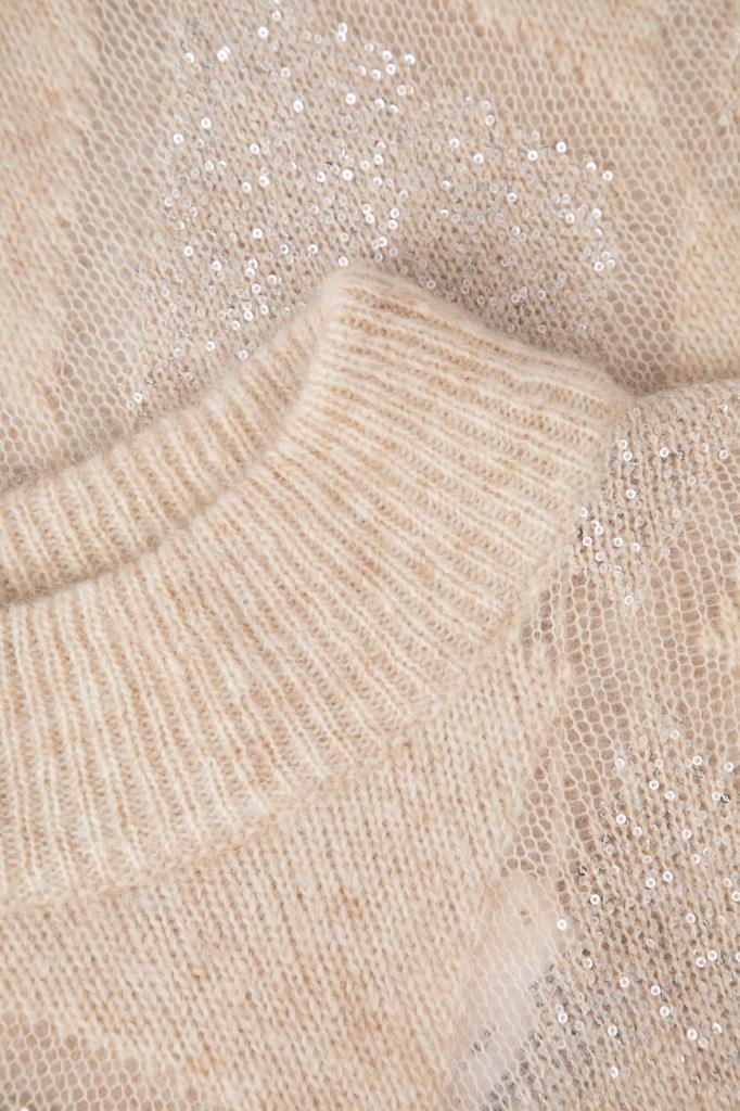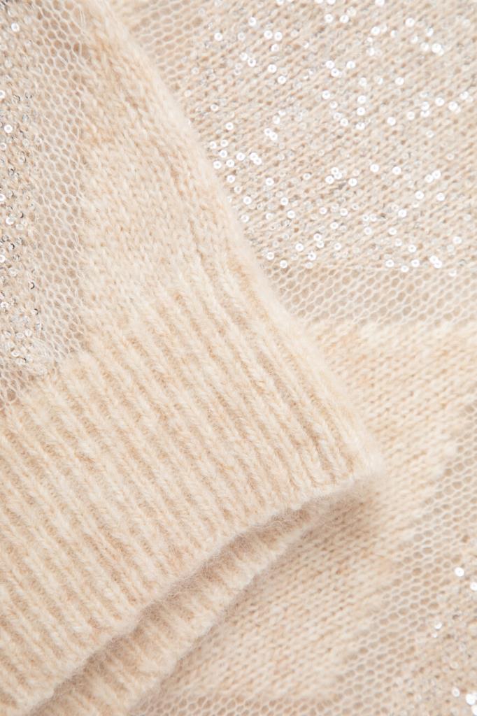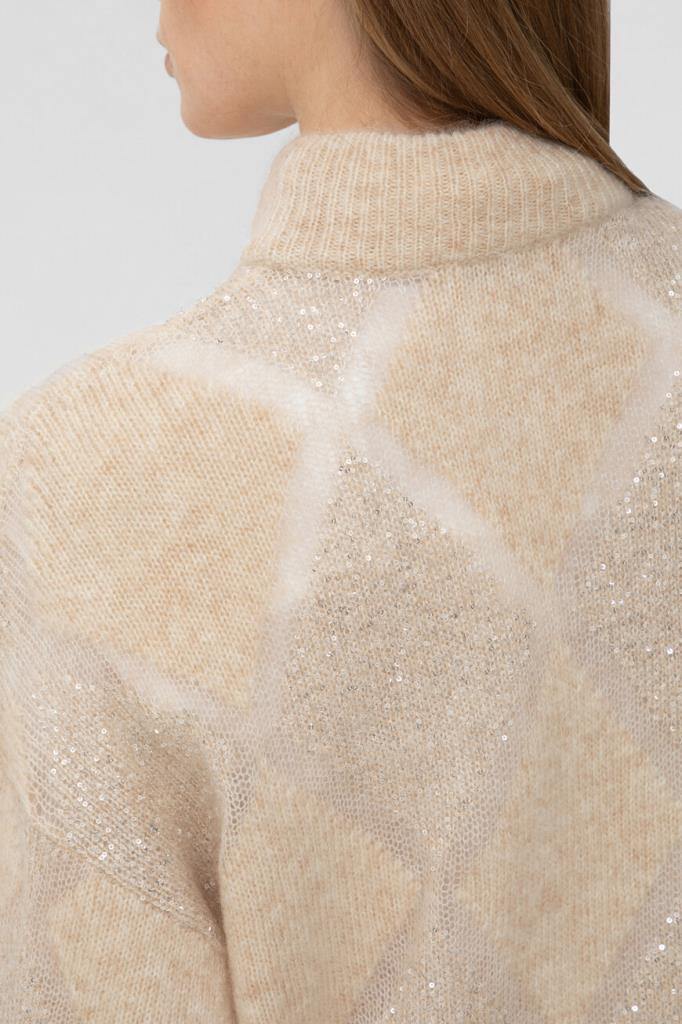 Свитер Dazzling Argyle из мягкой шерсти и мохера от BRUNELLO CUCINELLI. Модель выполнена в бежевом оттенке и украшена геометрическим мотивом в виде ромбов, сочетающим в себе изящный блеск пайеток и чулочную вязку, которые чередуются между собой. Невысокий воротник-стойка, манжеты широких рукавов и пояс оформлены резинкой, обеспечивающей дополнительный комфорт и удобство в носке. Изделие свободного кроя сделает комфортнее образ в схожей цветовой гамме.