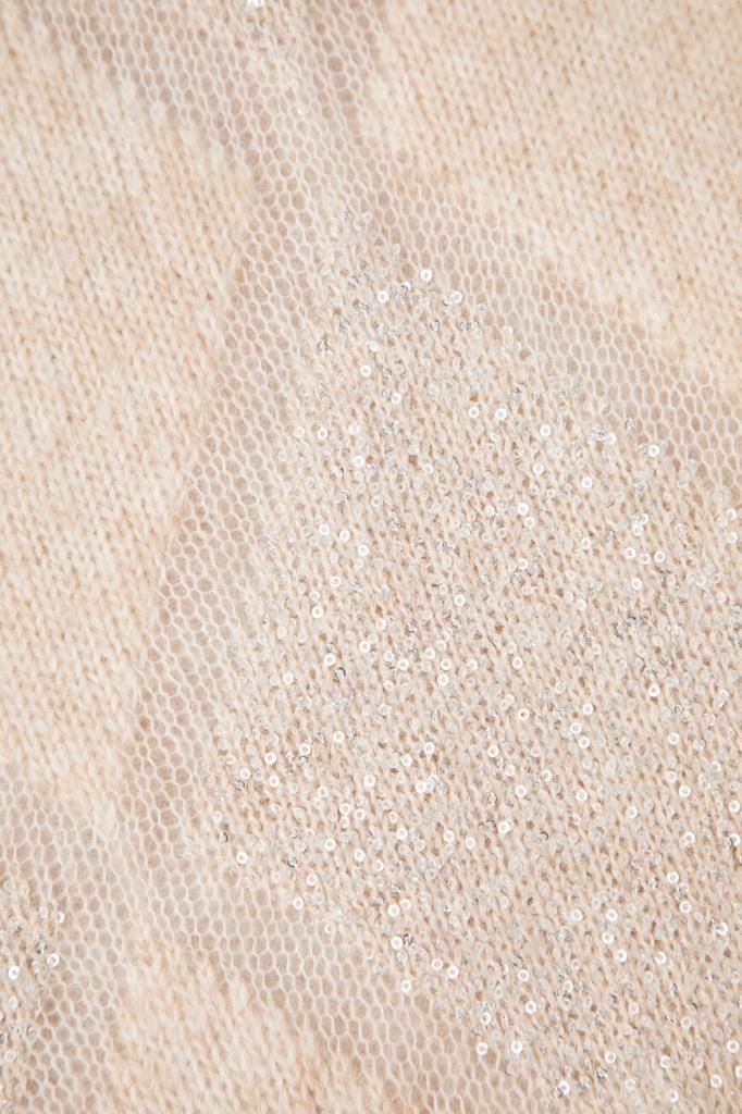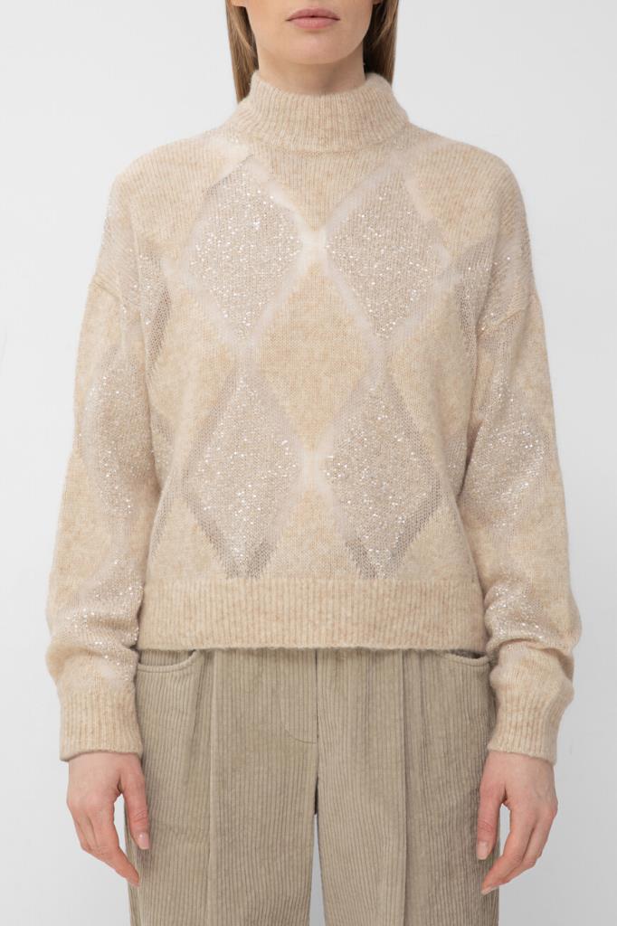 Свитер Dazzling Argyle из мягкой шерсти и мохера от BRUNELLO CUCINELLI. Модель выполнена в бежевом оттенке и украшена геометрическим мотивом в виде ромбов, сочетающим в себе изящный блеск пайеток и чулочную вязку, которые чередуются между собой. Невысокий воротник-стойка, манжеты широких рукавов и пояс оформлены резинкой, обеспечивающей дополнительный комфорт и удобство в носке. Изделие свободного кроя сделает комфортнее образ в схожей цветовой гамме.