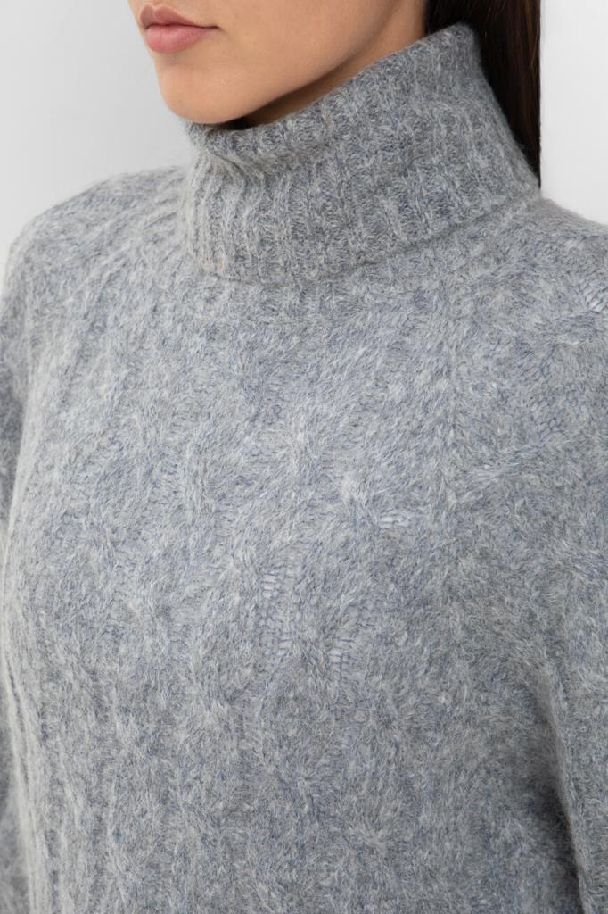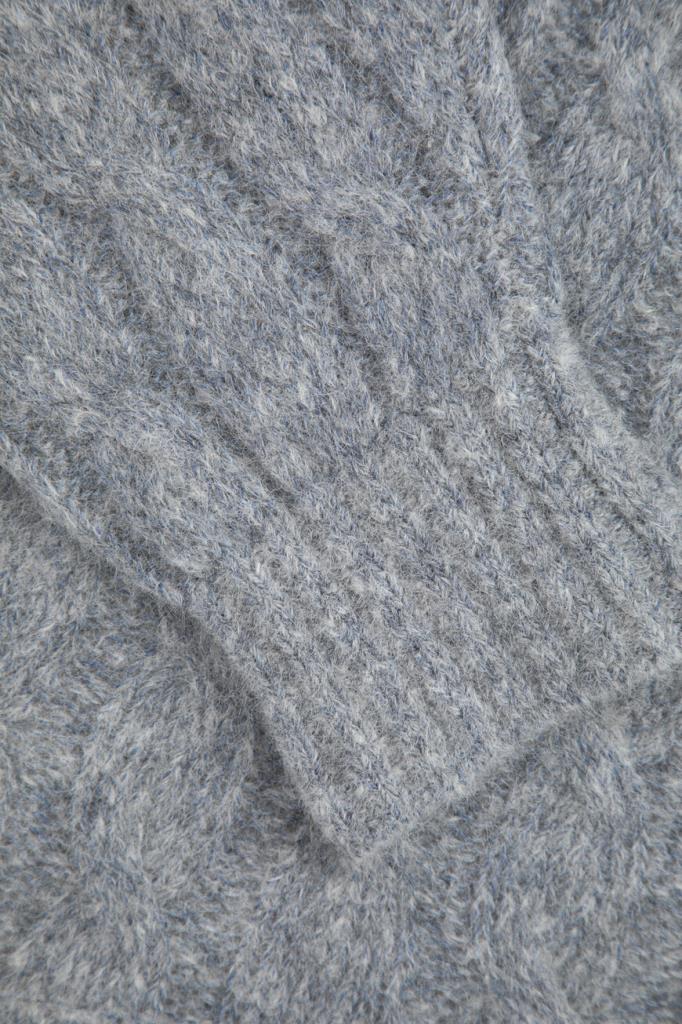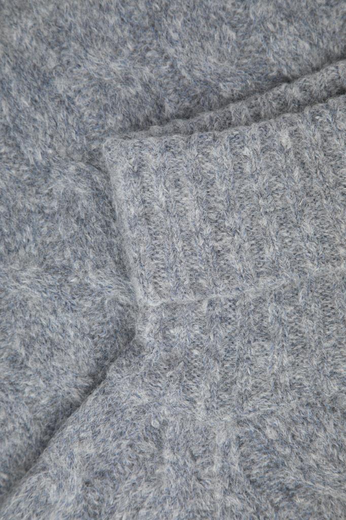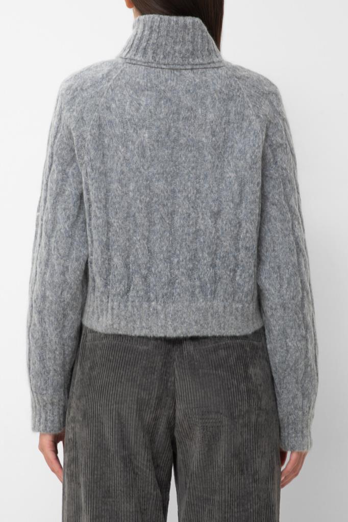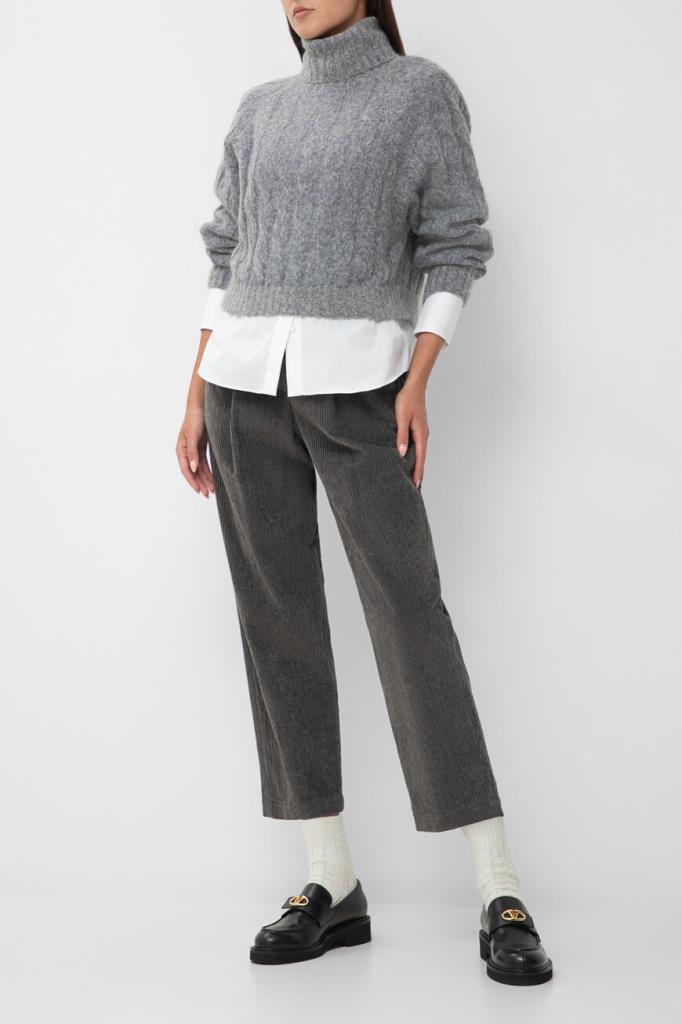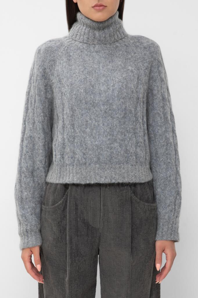 Укороченный свитер BRUNELLO CUCINELLI, связанный косами. Для изготовления модели расслабленного силуэта выбраны мягкая шерсть и пушистый мохер. О принадлежности изделия Дому деликатно напоминает полоса из рядов серебристой цепочки Мониль на спинке под воротником. Оптимальную посадку свитера по фигуре гарантируют высокий воротник фасона «гольф», манжеты рукавов и широкий пояс, оформленные резинкой. Модель будет комфортно носить и поверх рубашки, и на голое тело.