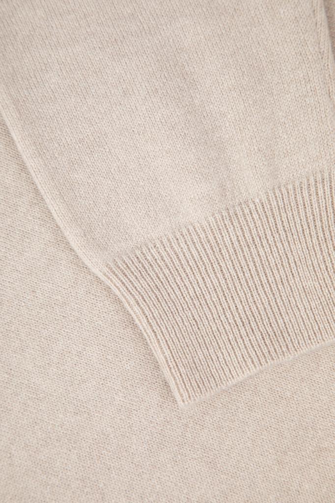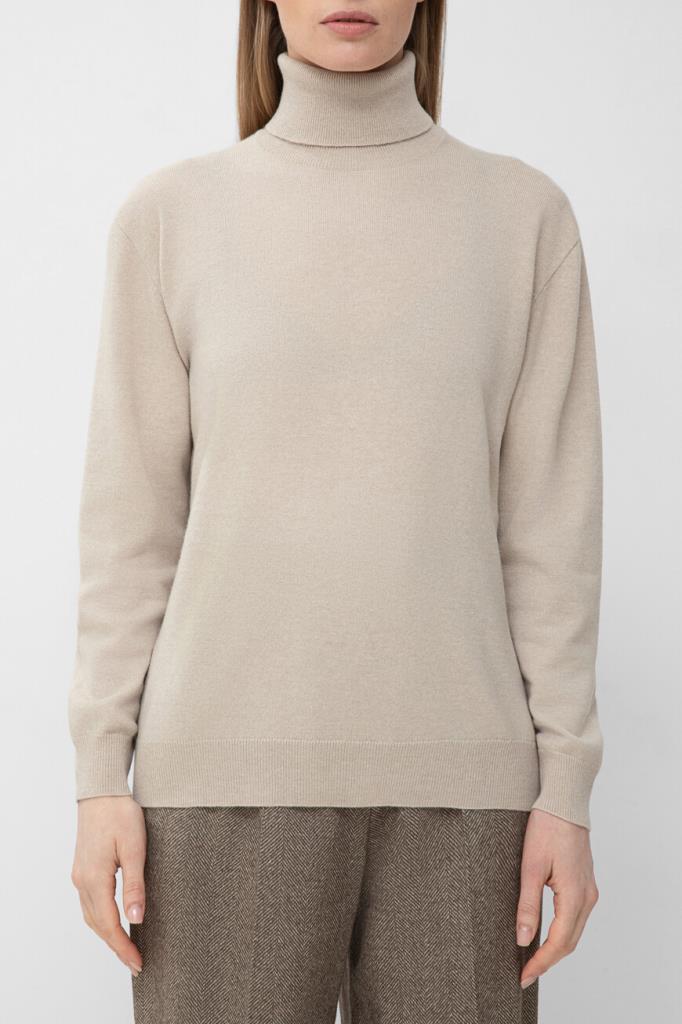 Водолазка BRUNELLO CUCINELLI связана лицевой гладью. Для изготовления модели расслабленного силуэта используется мягкий кашемир. На принадлежность изделия Дому указывает неброский декор - полоса из блестящей ценной цепочки Мониль сзади вдоль нижнего края воротника. Высокий воротник фасона «гольф», манжеты и широкий пояс оформлены резинкой.