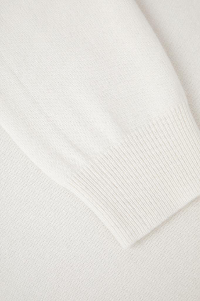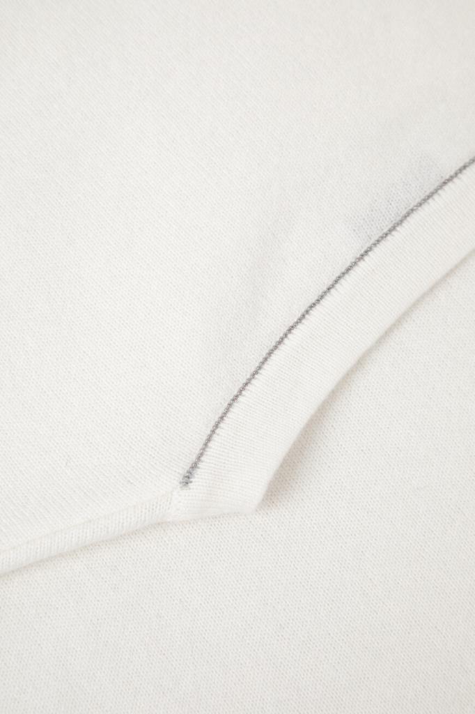Кашемировый джемпер BRUNELLO CUCINELLI со знаковой символикой Дома.Такой нежный материал сохраняет тепло лучше обычной шерсти и при этом хорошо пропускает воздух, поэтому в изделии белого цвета будет комфортно весь день. Особенностями повседневной модели стали чулочная вязка и полоса из блестящей ценной цепочки Мониль сзади вдоль нижнего края воротника. Джемпер прилегающего силуэта станет универсальным решением в гардеробе и удачным компаньоном для вещей как ярких, так и базовых оттенков.