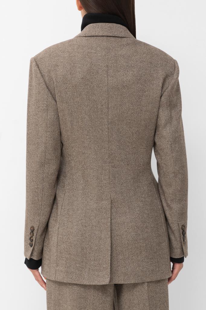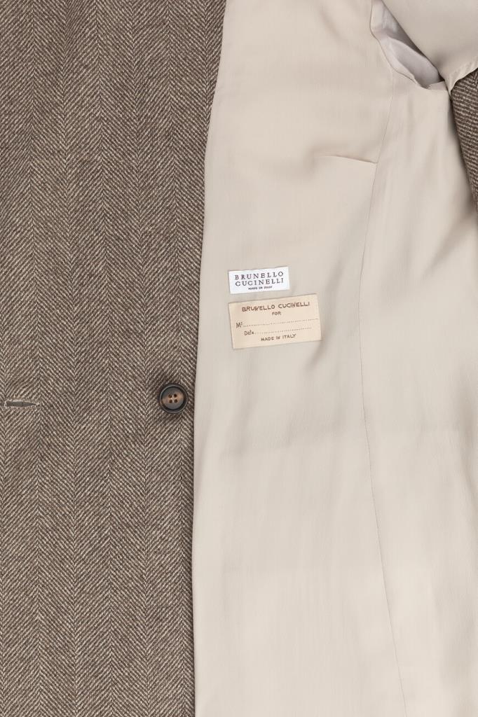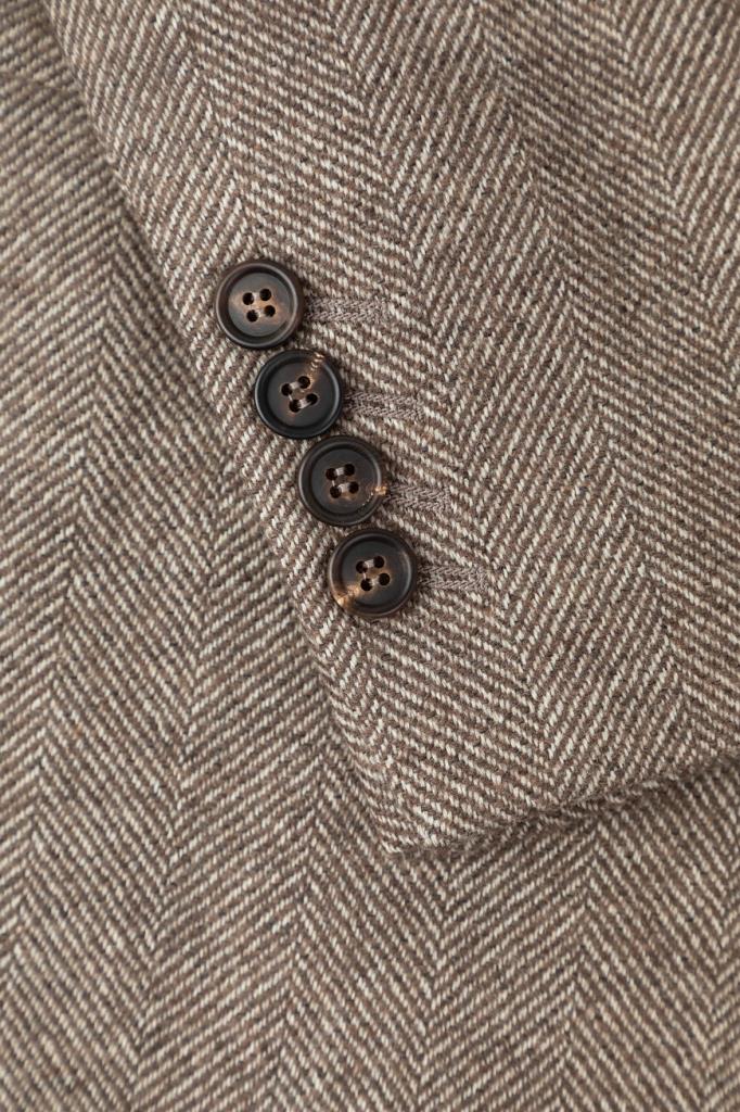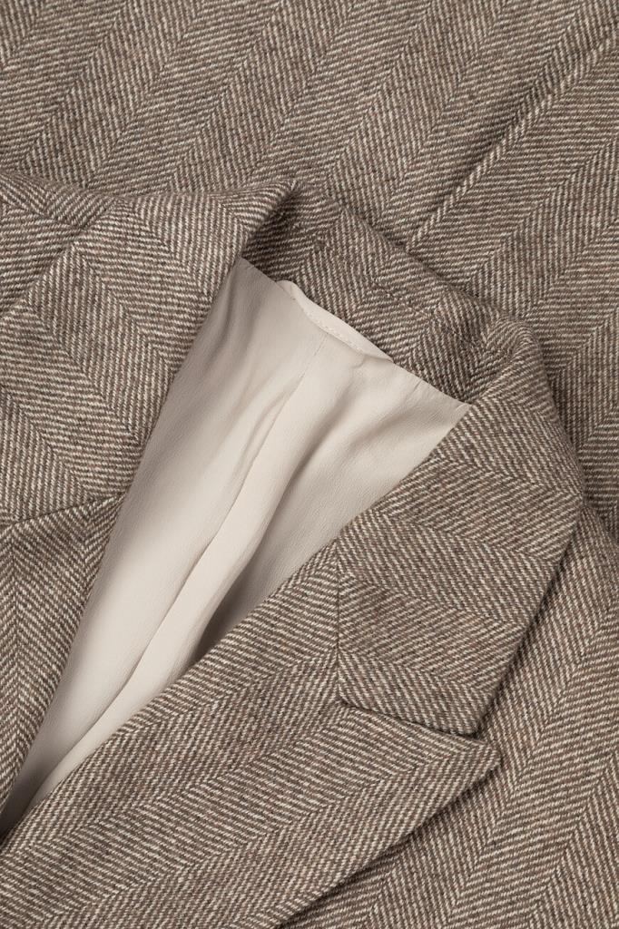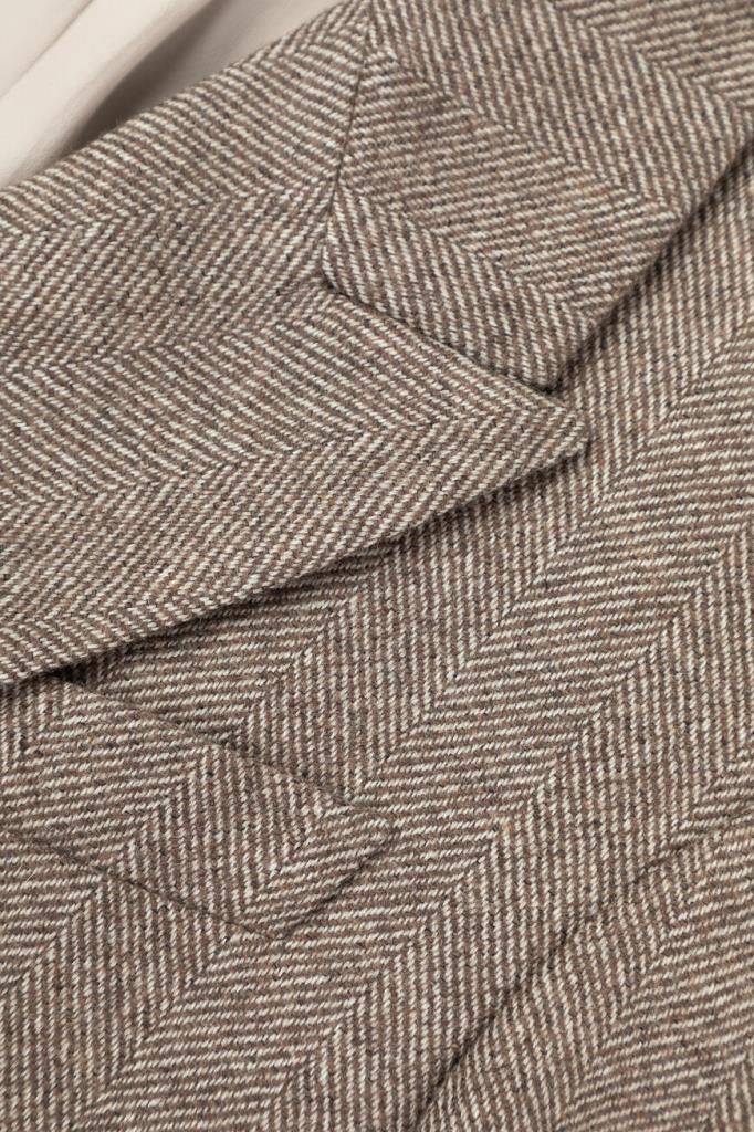 Жакет приталенного силуэта от BRUNELLO CUCINELLI. Для изготовления модели с геометрическим мотивом в «ёлочку», выполненной в коричневых тонах, используются высокотехнологичная чесаная шерсть и прочный нейлон с добавлением эластичных волокон. Изделие по-новому интерпретирует неустаревающую икону стиля ретро. Пиджак следует канонам высокого портновского мастерства и отличается свободным кроем с крупными плечами и стандартной, гармонично подчёркнутой талией. Деталь из серебристой цепочки Мониль сзади вдоль нижнего края воротника добавляет модели сияющую ноту с фирменном стиле.