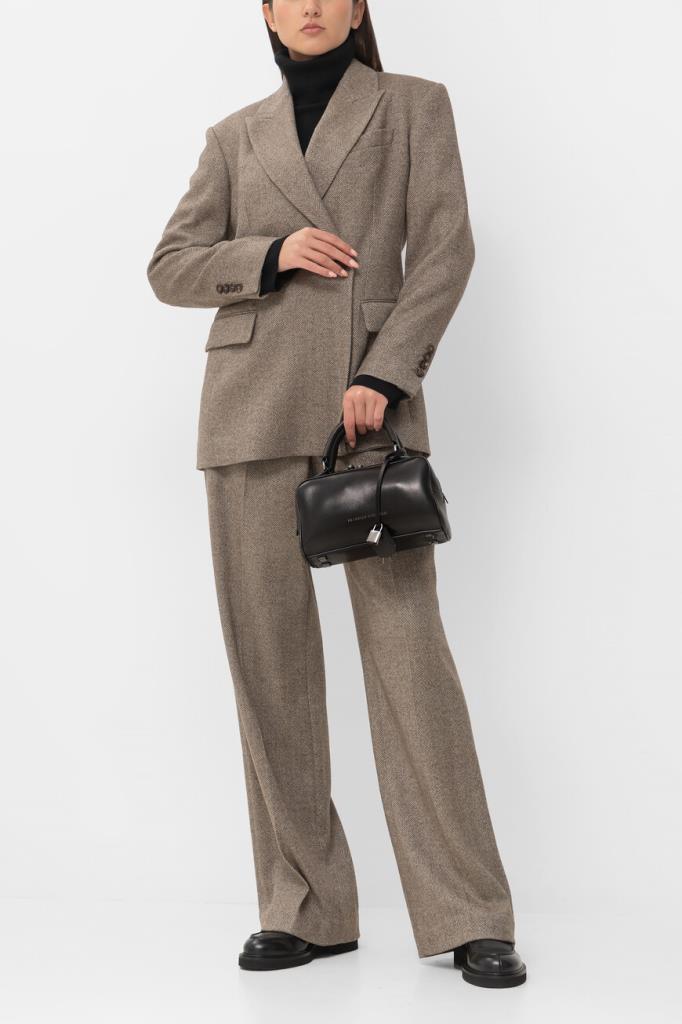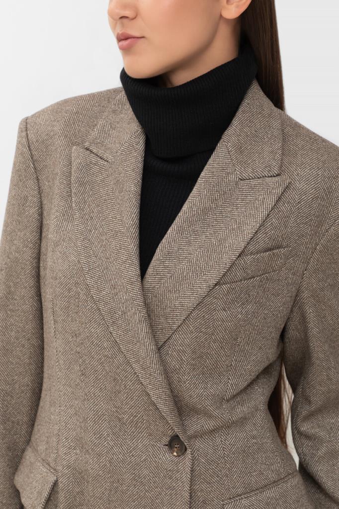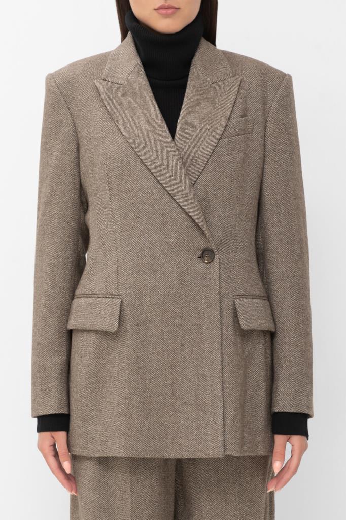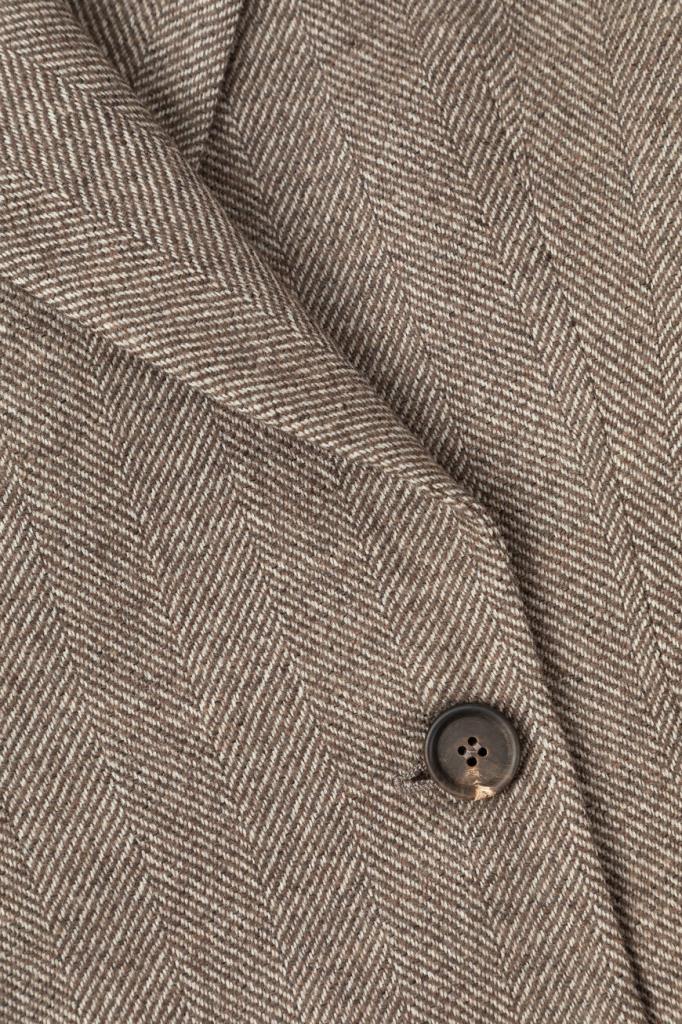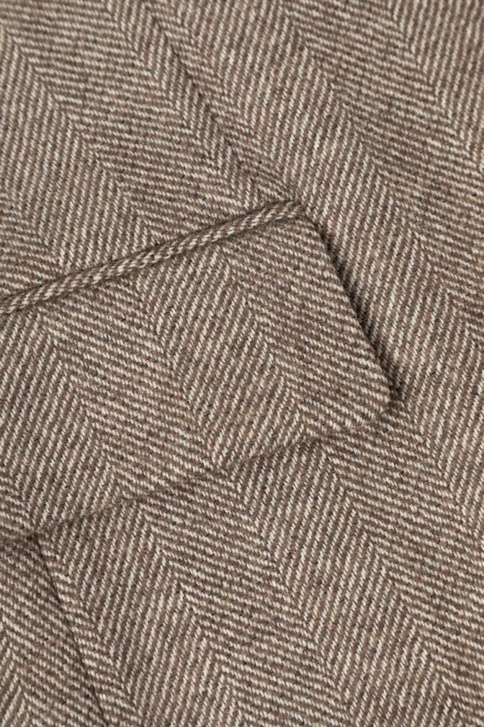 Жакет приталенного силуэта от BRUNELLO CUCINELLI. Для изготовления модели с геометрическим мотивом в «ёлочку», выполненной в коричневых тонах, используются высокотехнологичная чесаная шерсть и прочный нейлон с добавлением эластичных волокон. Изделие по-новому интерпретирует неустаревающую икону стиля ретро. Пиджак следует канонам высокого портновского мастерства и отличается свободным кроем с крупными плечами и стандартной, гармонично подчёркнутой талией. Деталь из серебристой цепочки Мониль сзади вдоль нижнего края воротника добавляет модели сияющую ноту с фирменном стиле.
