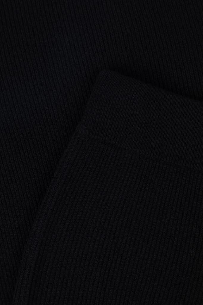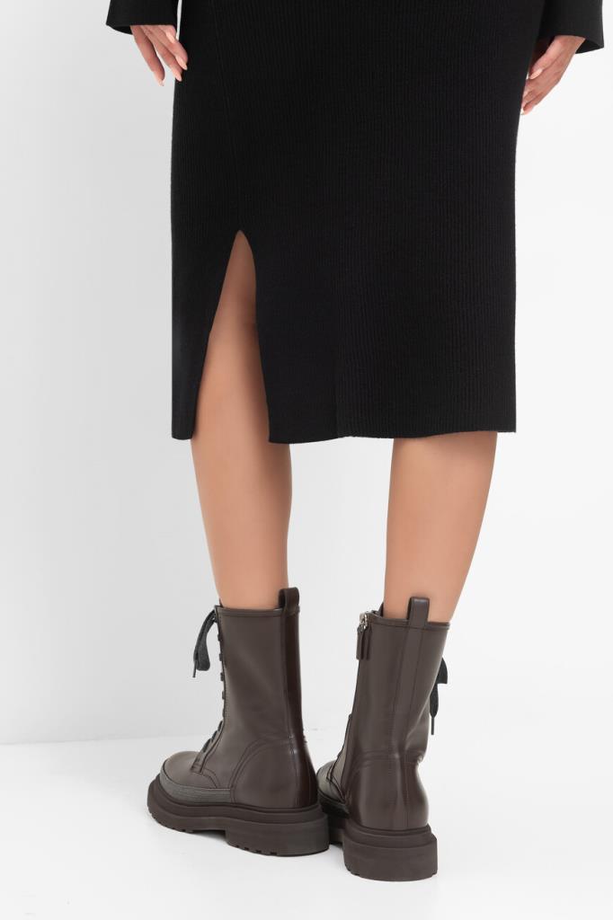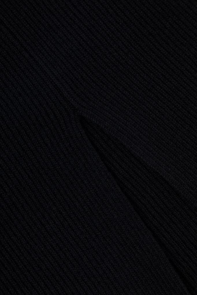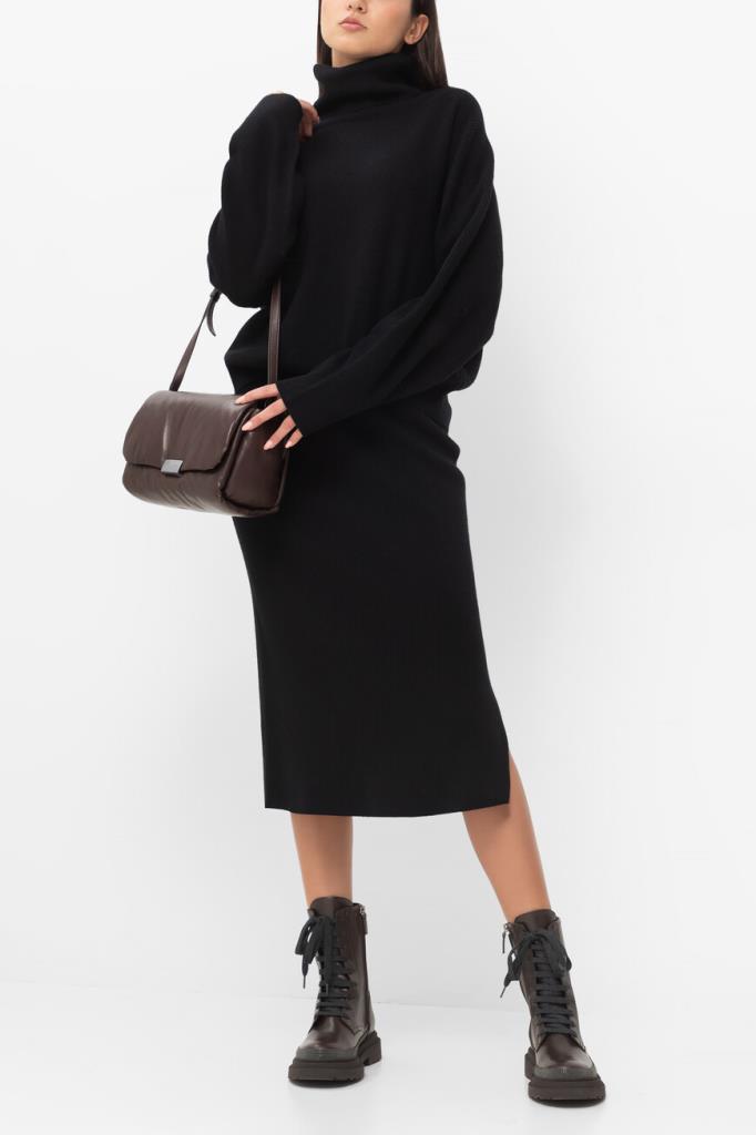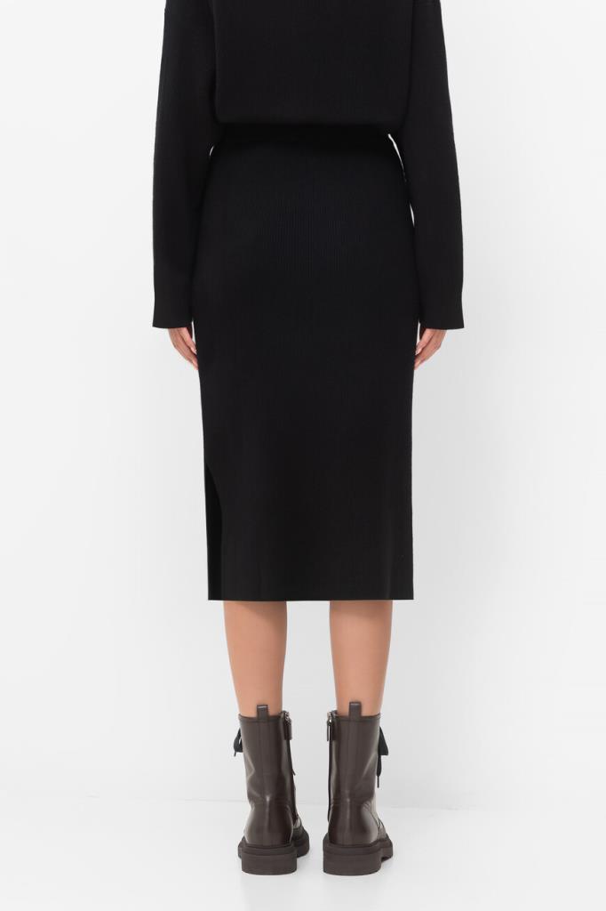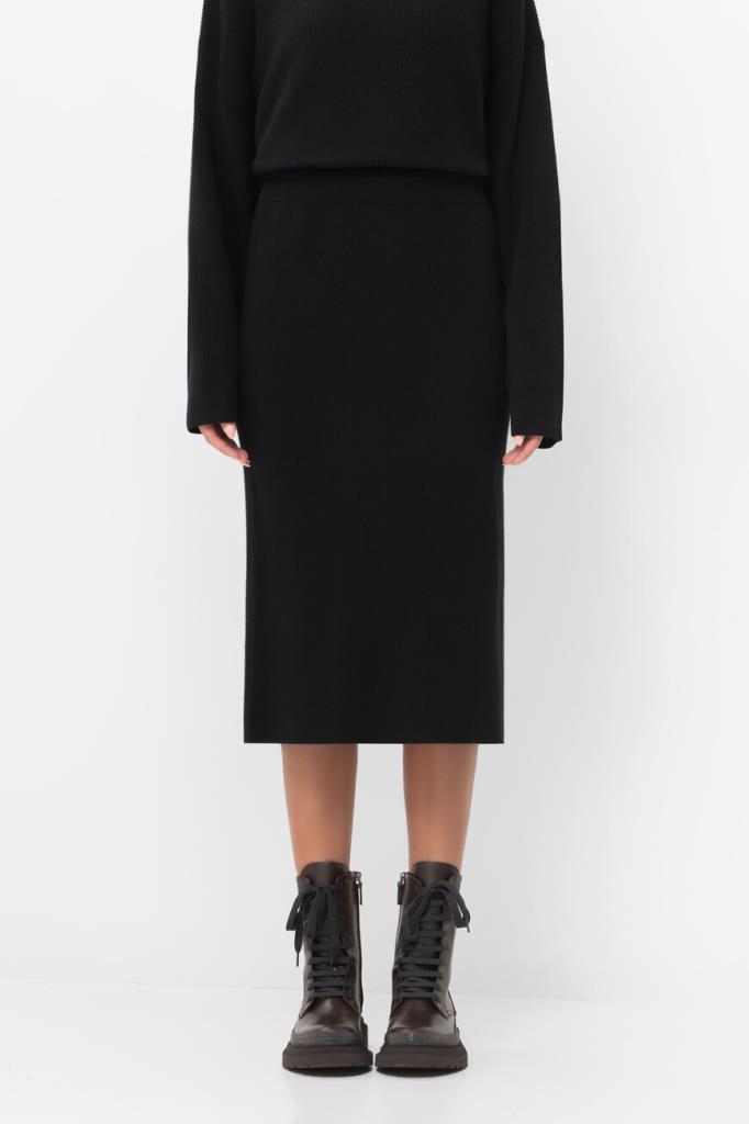 Чёрная юбка-миди прямого силуэта от BRUNELLO CUCINELLI. Для изготовления модели с широким эластичным поясом-резинкой используется мягкий трикотаж на основе шерсти первого пострига с добавлением кашемира и гладкого шёлка. Изделие интересно вязкой английской резинкой и изящным боковым разрезом. Юбка будет одинаково хорошо смотреться и в офисе, и на обеде в ресторане. Создайте total look с парным свитером из той же коллекции.