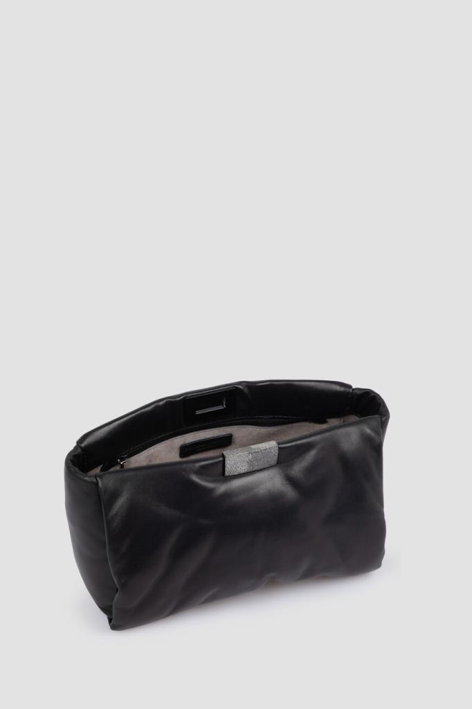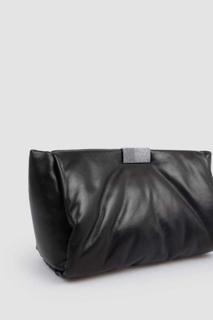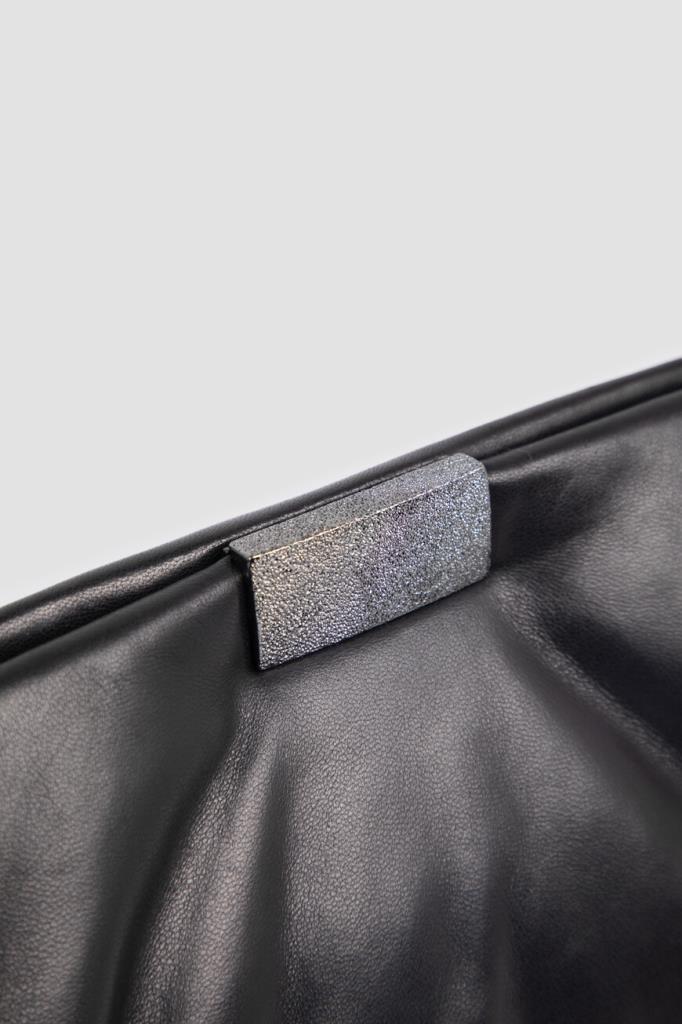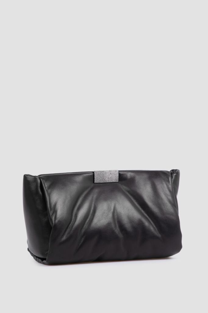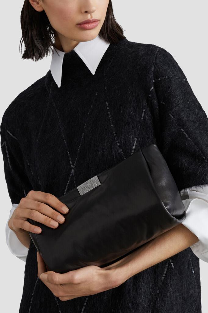 Клатч Brunello Cucinelli изготовлен из мягкой кожи наппа. Изделие выполнено в чёрном базовом цвете с одним внутренним отделением. Атрибутом Дома является вставка из блестящей серебристой цепочки Мониль на видимой передней части магнитной застёжки, обработанной по технологии зеркальной полировки.