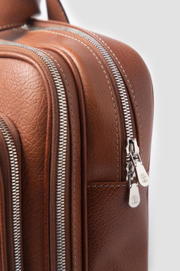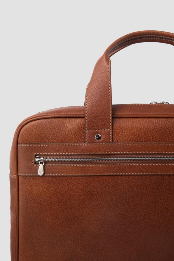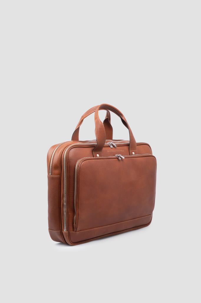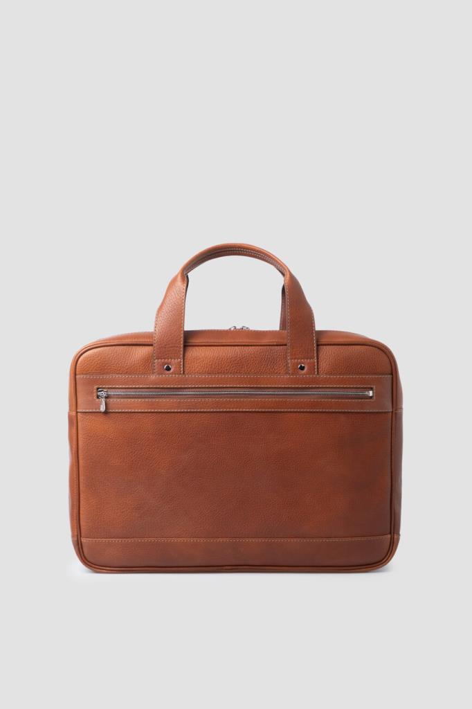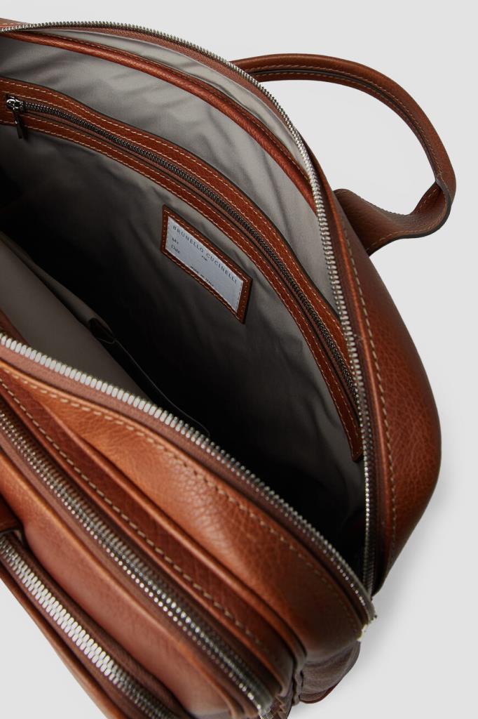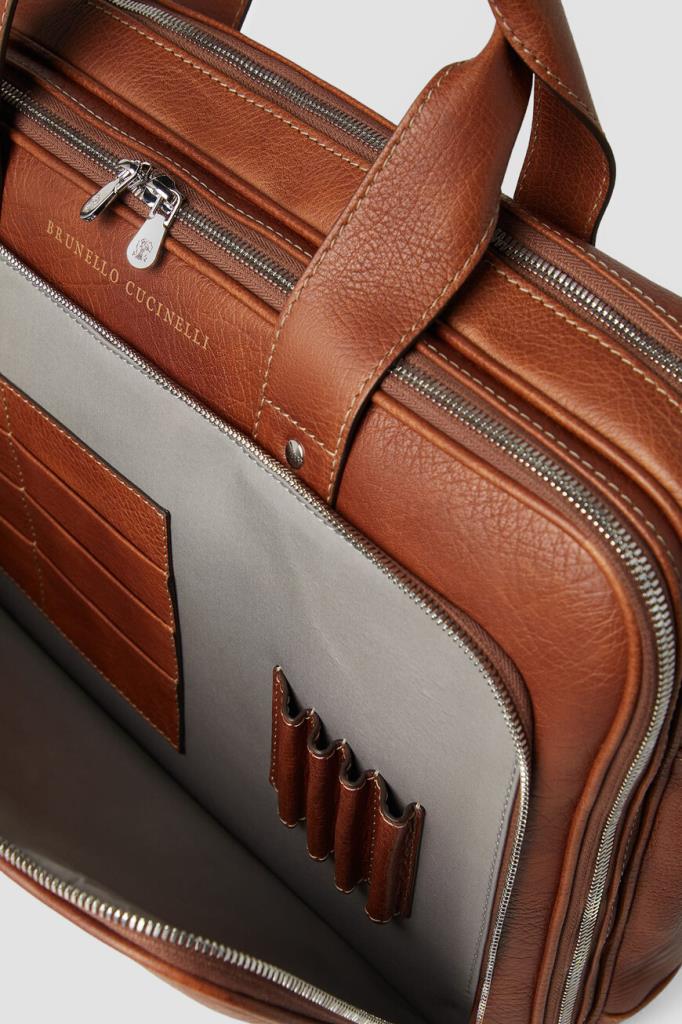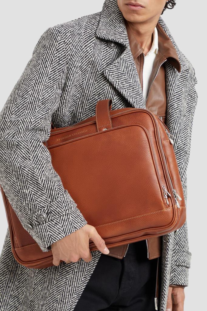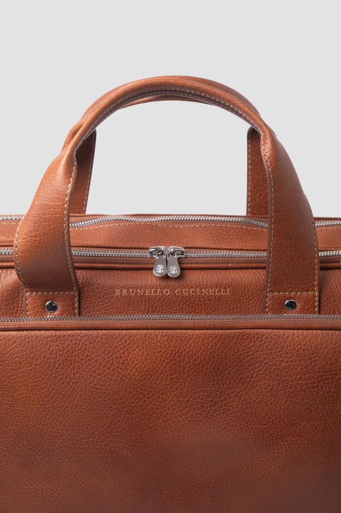 Деловая сумка BRUNELLO CUCINELLI закруглённой прямоугольной формы. Модель изготовлена из мягкой зернистой кожи телёнка коричневого оттенка и дополнена двумя округлыми кожаными ручками для переноски. Изделие оснащено просторным внутренним отделением на застёжке-молнии, дополнительным отделением на молнии с двумя брендированными пуллерами в передней части, также большим внешним карманом на молнии спереди и плоским карманом на молнии сзади. Функционал аксессуара расширен внутренним боковым карманом на молнии с брендированием, шестью слотами для кредитных карт и визиток, четырьмя держателями для авторучек и дополнительными открытыми внутренними отделениями.