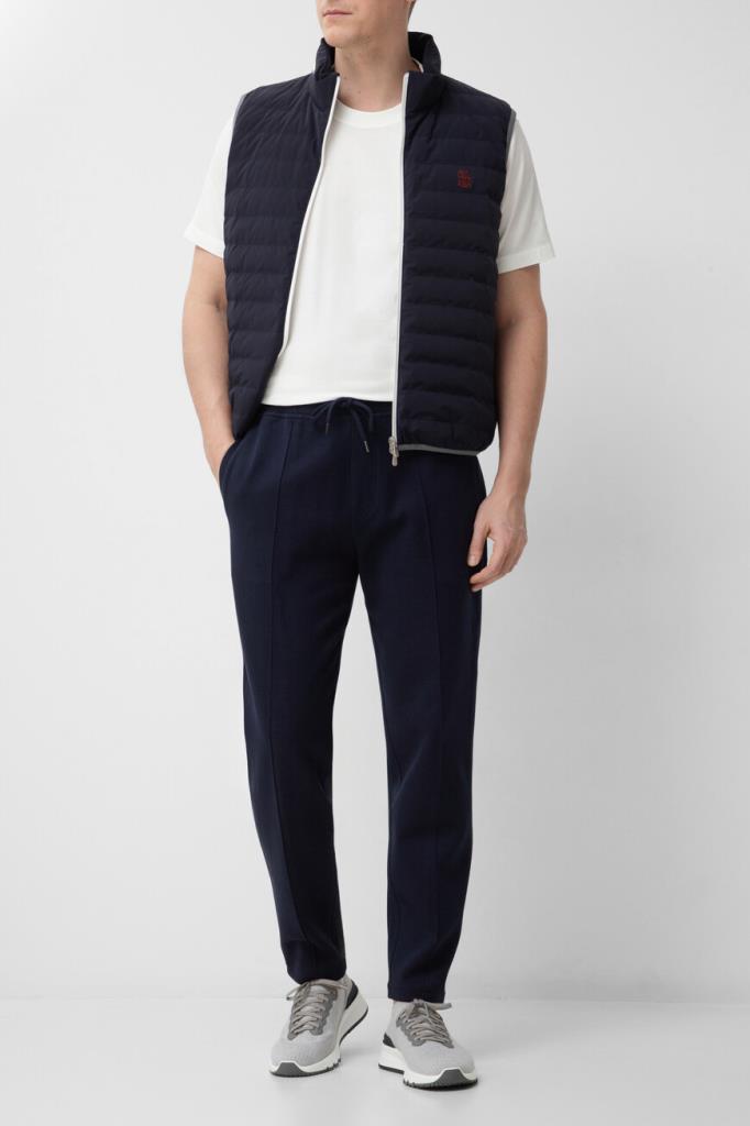 Спортивные брюки BRUNELLO CUCINELLI с очерченными стрелками. Изделие линии Travelwear выполнено из двухслойной ткани ручной отделки - футера на основе хлопка, кашемира, прочного нейлона и гладкого шёлка, обеспечивающих тепло, мягкость и комфорт при носке. Оптимальную посадку модели по линии талии обеспечивает широкий эластичный пояс-кулиска. В передних вертикальных карманах по бокам и крупных задних карманах удобно хранить мелкие предметы. Брюки сочетаются со стёганым пуховым жилетом на молнии с белой отделкой из той же линейки.