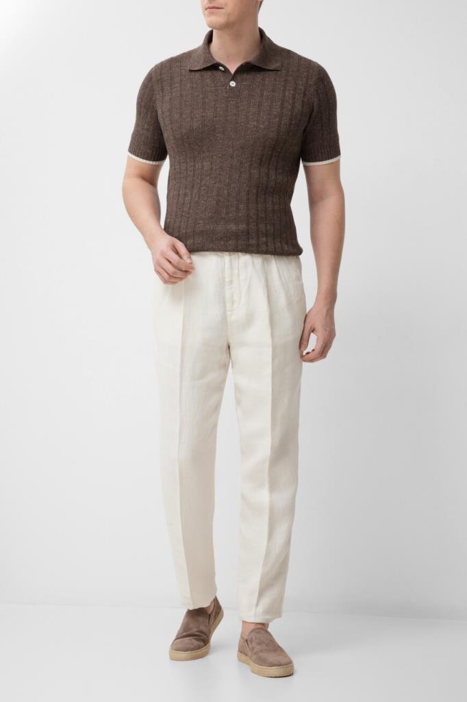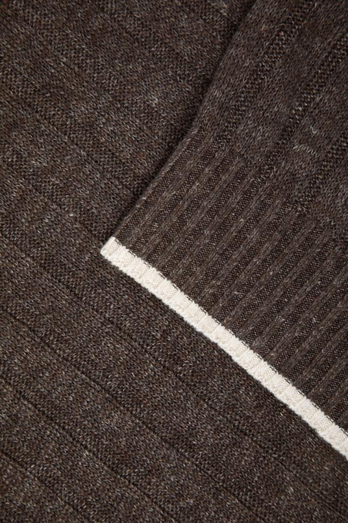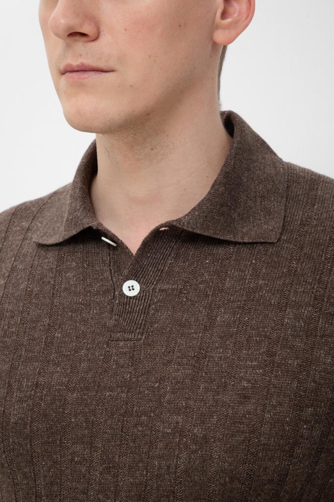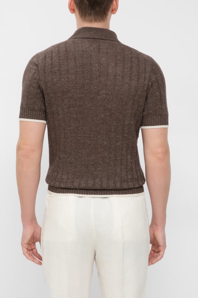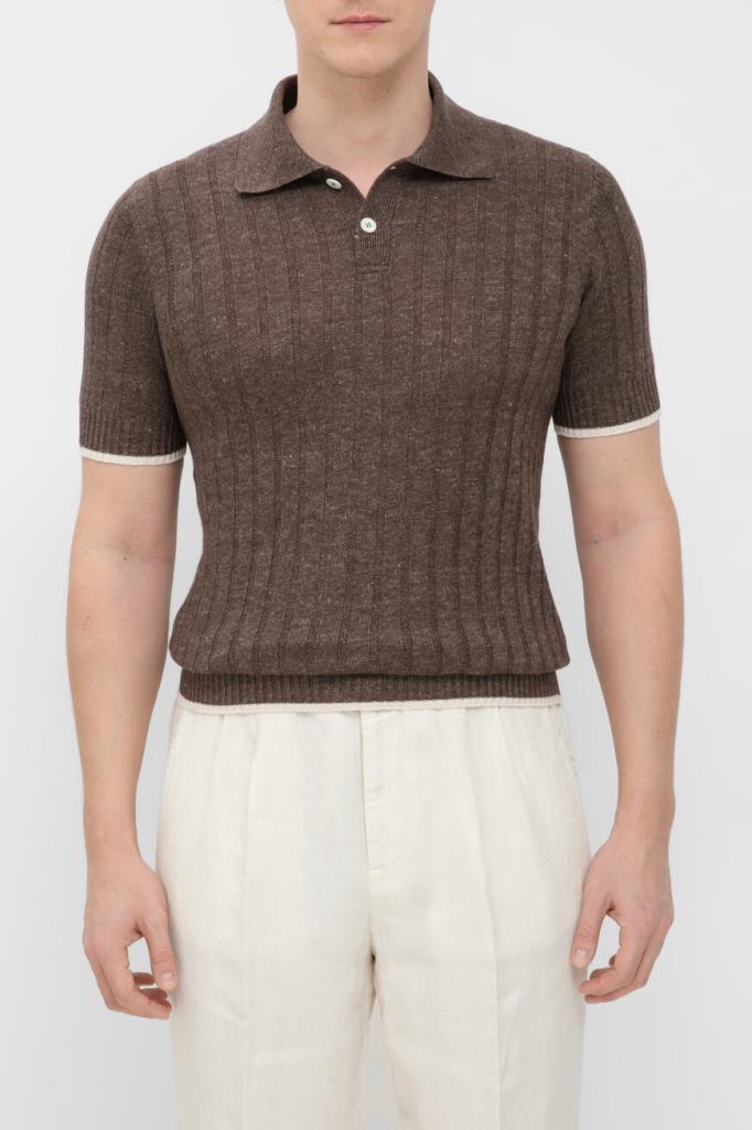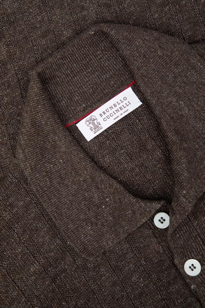Поло тёмно-коричневого цвета от BRUNELLO CUCINELLI. Фасон полуприталенной модели, выполненной из мягкого трикотажа на основе хлопка и льна чулочной вязкой, характеризуется наличием коротких рукавов и застёжкой на перламутровые пуговицы в верхней части. Отличительными особенностями изделия стали геометрический мотив в виде вертикальных полос и белые полосы-окантовка снизу на манжетах рукавов и широком поясе - культовый декор коллекций Дома.