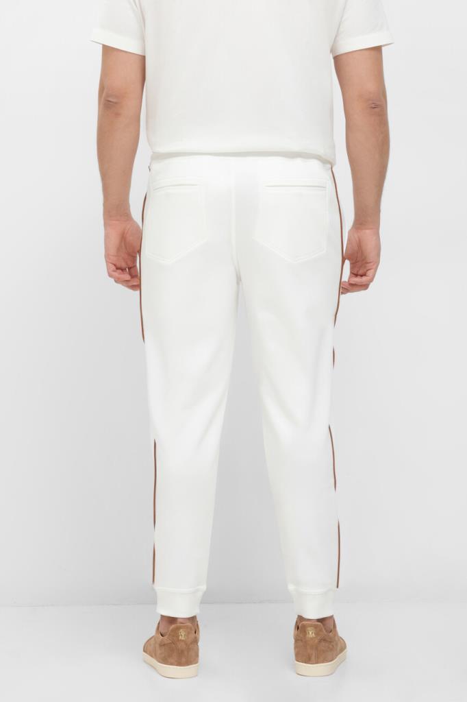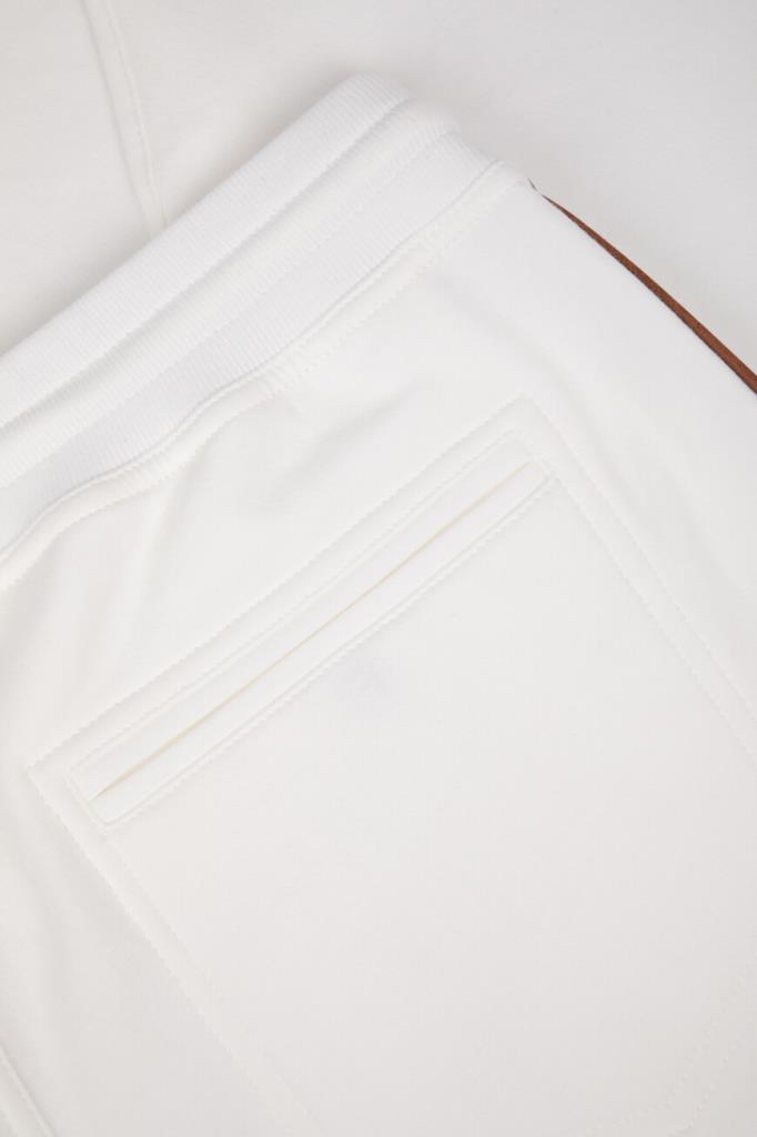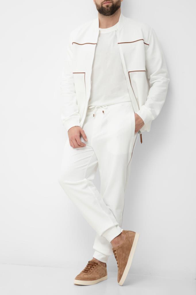 Спортивные брюки из линейки Travelwear от BRUNELLO CUCINELLI. Для создания изделия свободного силуэта выбран высокотехнологичный хлопковый футер белого цвета. Модель декорирована коричневыми полосами-лампасами и оснащена широким эластичным поясом-кулиской и манжетами-резинками для комфортной посадки. Брюки с четырьмя карманами составят идеальный комплект с толстовкой с невысоким воротником-стойкой в стиле бомбера из той же коллекции.